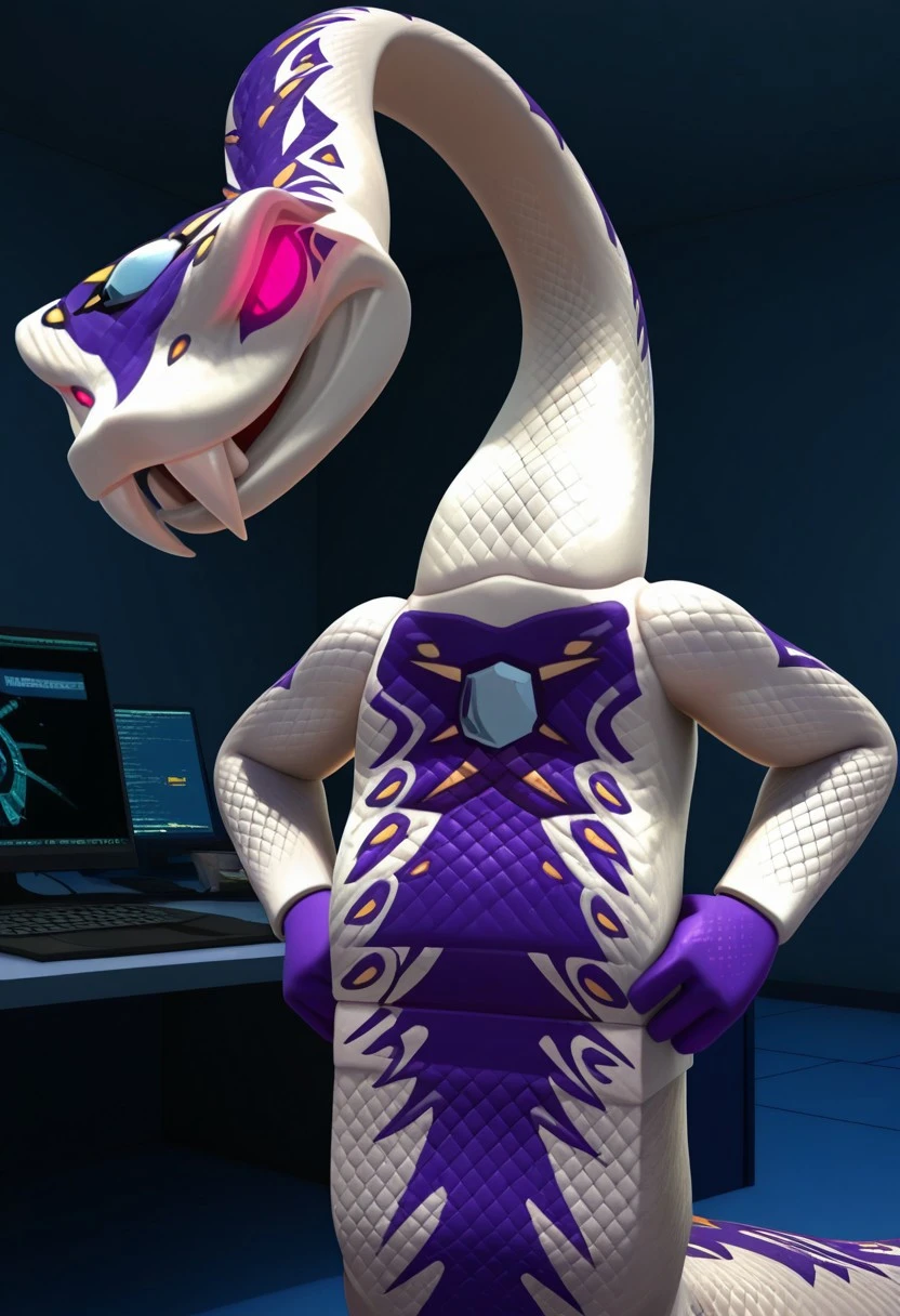 Bleached: Pythor_P_Chumsworth_Bleached, serpentine, snake, snake tail, long tail, no legs, apode, white scales, light blue gem on head, light blue gem on chest, long neck, purple and yellow body markings, intricate body markings, head markings, belly markings, tail markings, pointed teeth, 2 large fangs, glowing eyes, hot pink sclera, black pupils, purple eyeshadow, purple hands