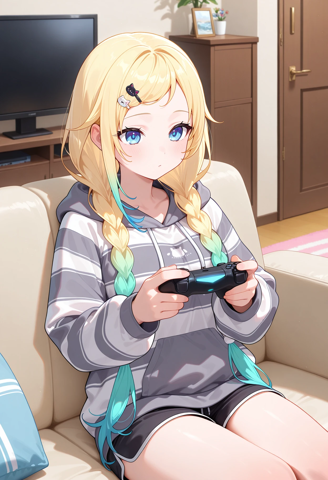 outfit4-1ddema, long hair, gradient hair, blonde hair, twin braids, hairclip, blue eyes, striped hoodie, grey hoodie, long sleeves, short shorts, black shorts