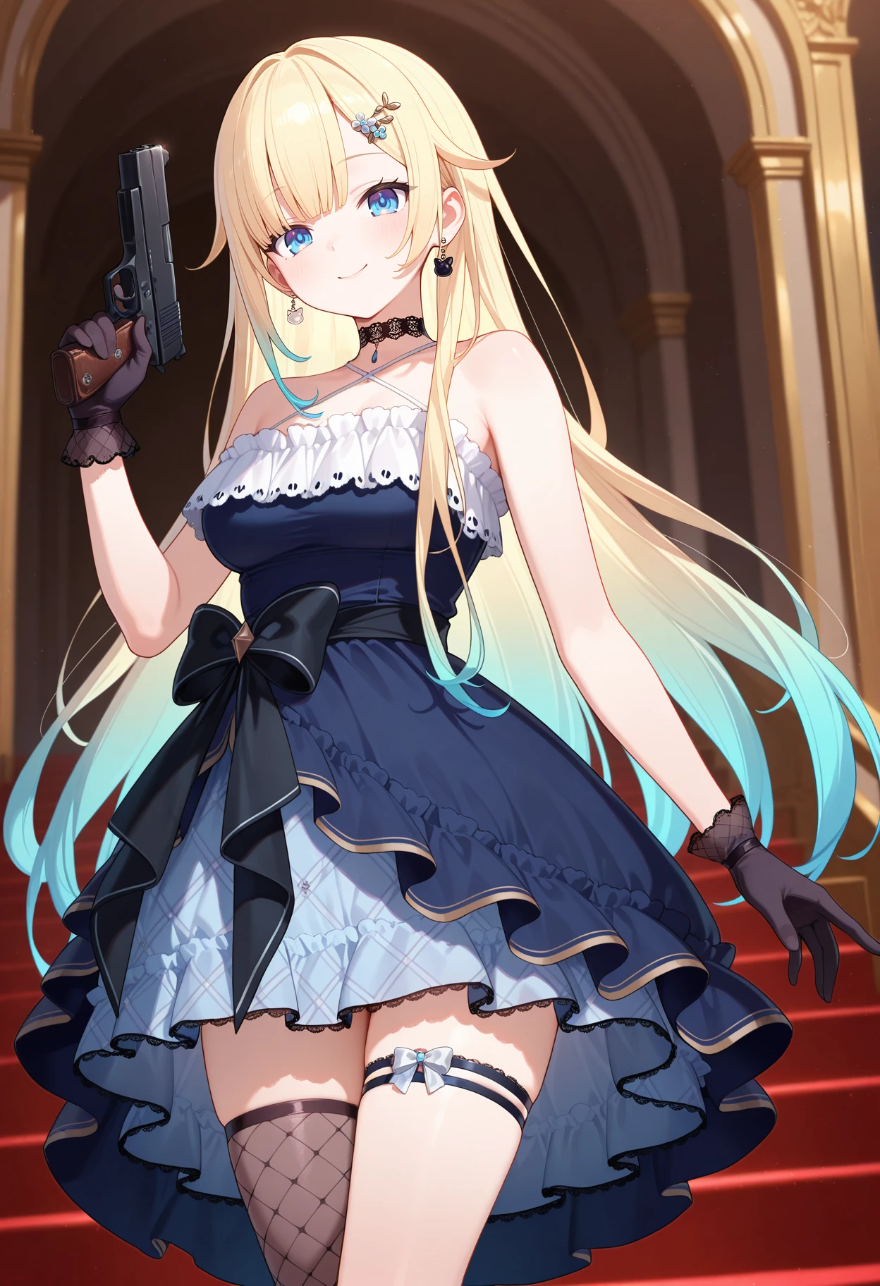 outfit1aaema, long hair, gradient hair, blonde hair, hair ornament, earrings, blue eyes, lace choker, bare shoulders, halterneck, frills, blue dress, black gloves, black bow, thigh strap, single thighhigh, fishnet thighhighs