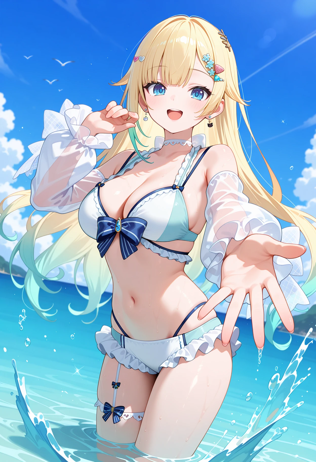 outfit5eeema, long hair, gradient hair, blonde hair, hair ornament, earrings, blue eyes, white choker, frilled bikini, white bikini, blue bow, long sleeves, detached sleeves, see-through sleeves, thigh strap, single garter strap