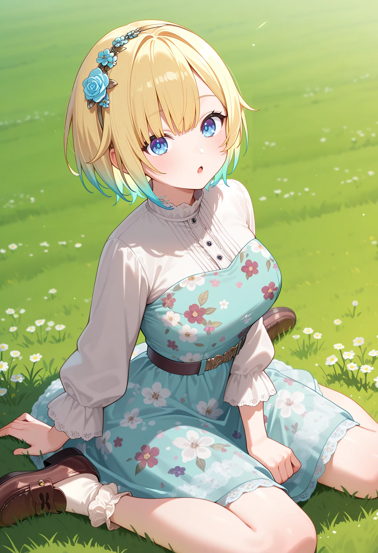 outfit3ccema, short hair, blonde hair, gradient hair, hairband, hair flower, blue eyes, white shirt, floral print, print dress, aqua dress, long sleeves, belt