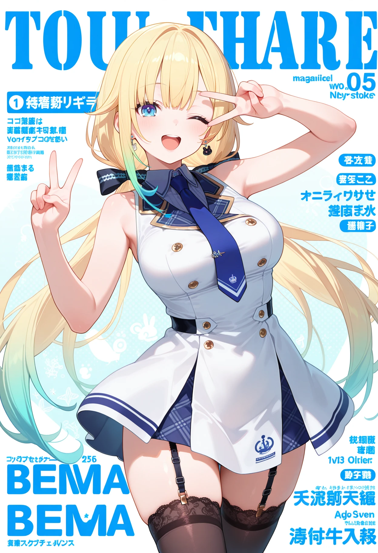 outfit2-2bbema, long hair, gradient hair, blonde hair, low twintails, hair ribbon, earrings, blue eyes, blue necktie, collared shirt, white dress, sleeveless, overskirt, garter straps, black thighhighs