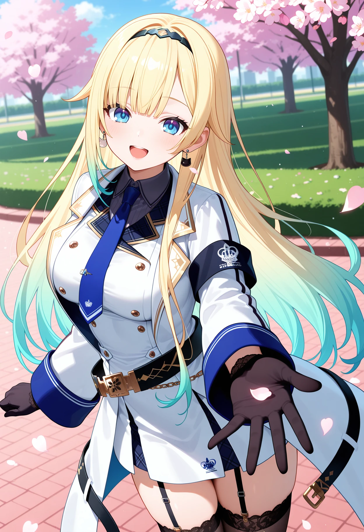 outfit2-1bbema, long hair, gradient hair, blonde hair, black hairband, earrings, blue eyes, blue necktie, collared shirt, white dress, white coat, long sleeves, armband, black gloves, black belt, overskirt, garter straps, black thighhighs