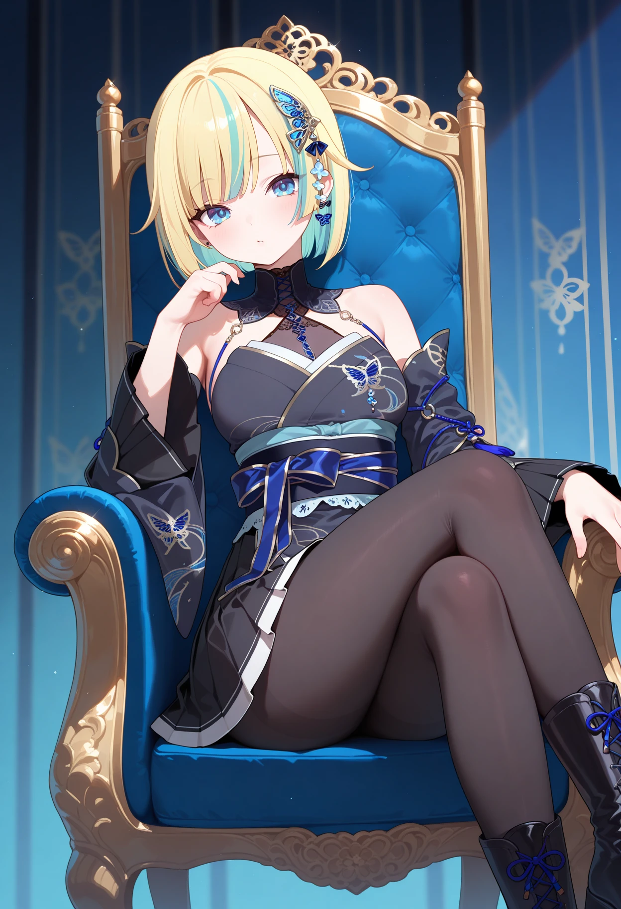 outfit6ffema, short hair, streaked hair, blonde hair, bob cut, hair ornament, earrings, blue eyes, black kimono, sleeveless, detached sleeves, wide sleeves, sash, black skirt, pleated skirt. black pantyhose