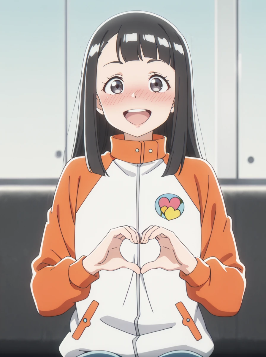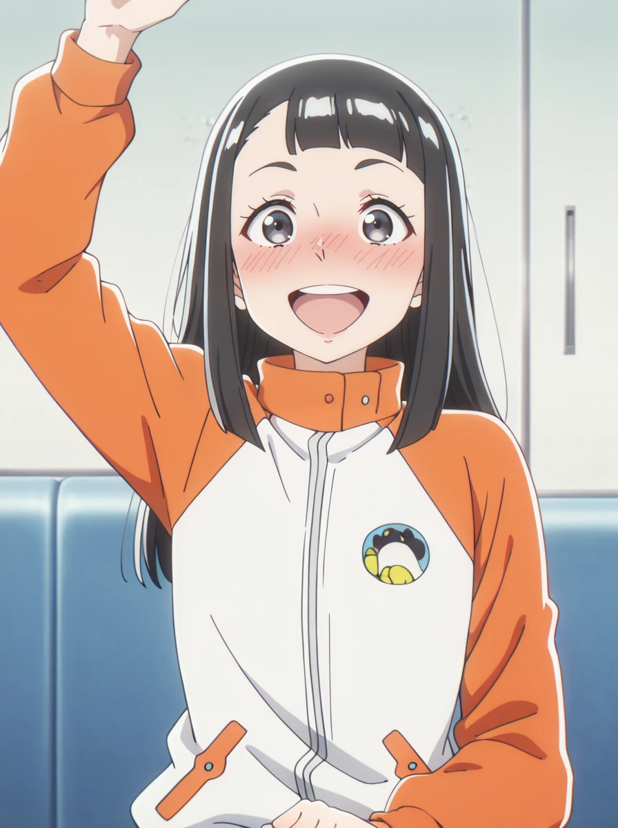 takakokobuchizawauniform , black hair, long hair, bangs jacket orange jacket,