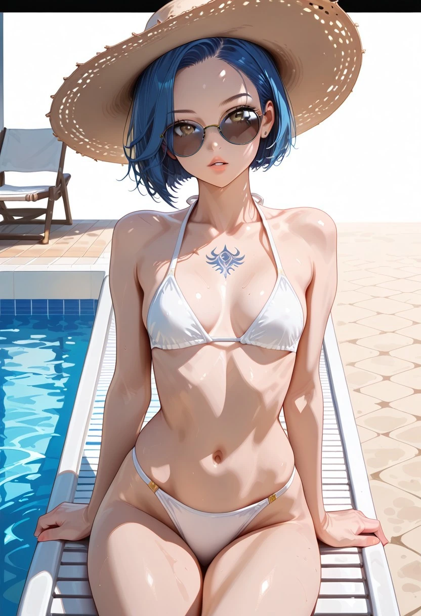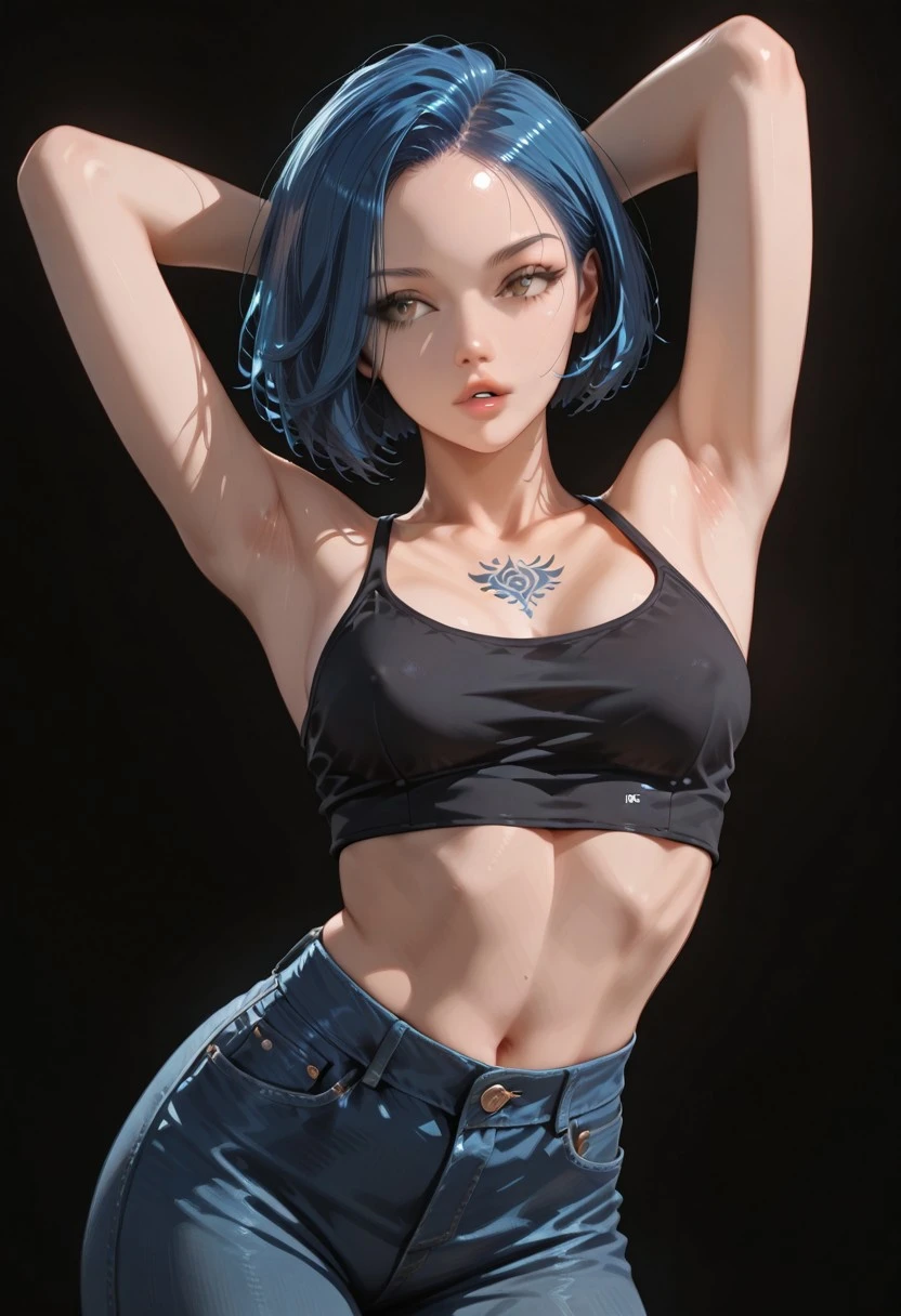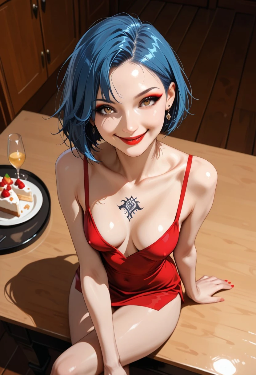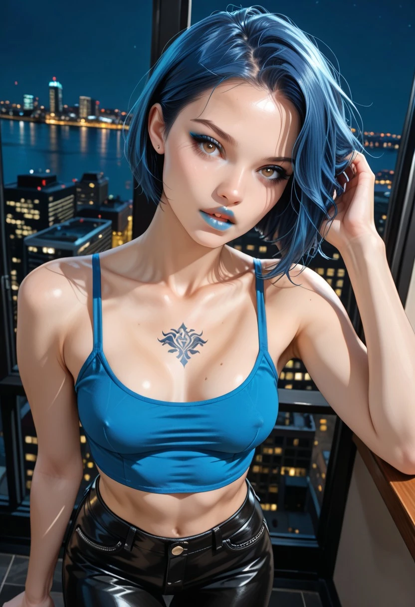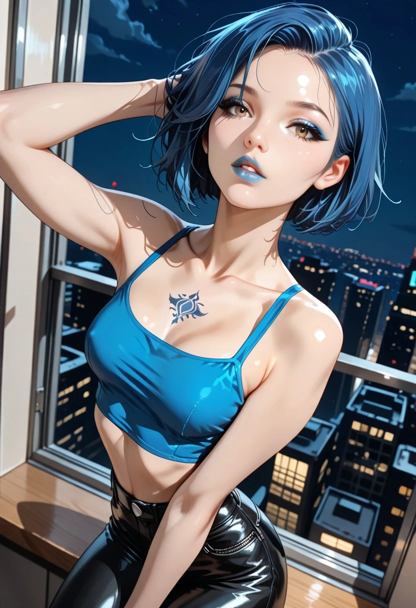 short hair, bobcut, ((blue hair)), swept hair, light brown eyes, slim, small breasts