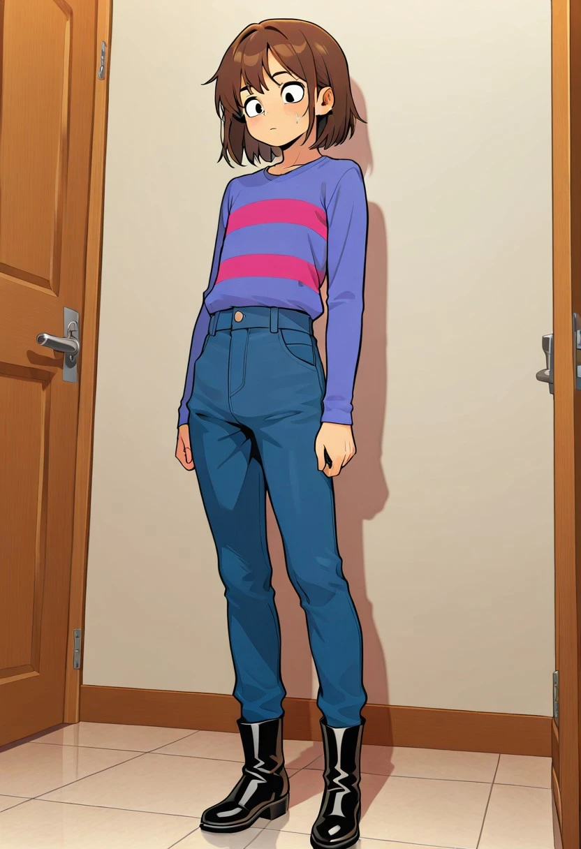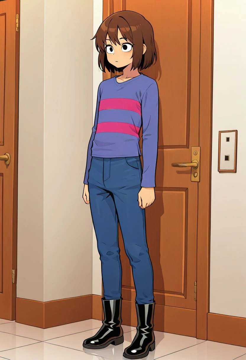 Frisky underhertail, solo, 1boy, light brown skin, black eyes, brown hair, long sleeve light blue shirt with two magenta stripes, blue pants, black boots