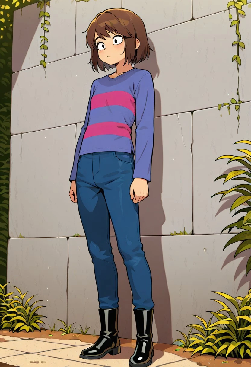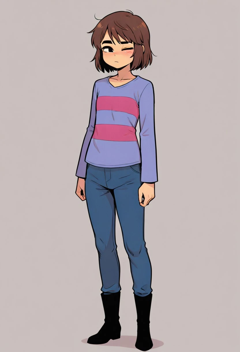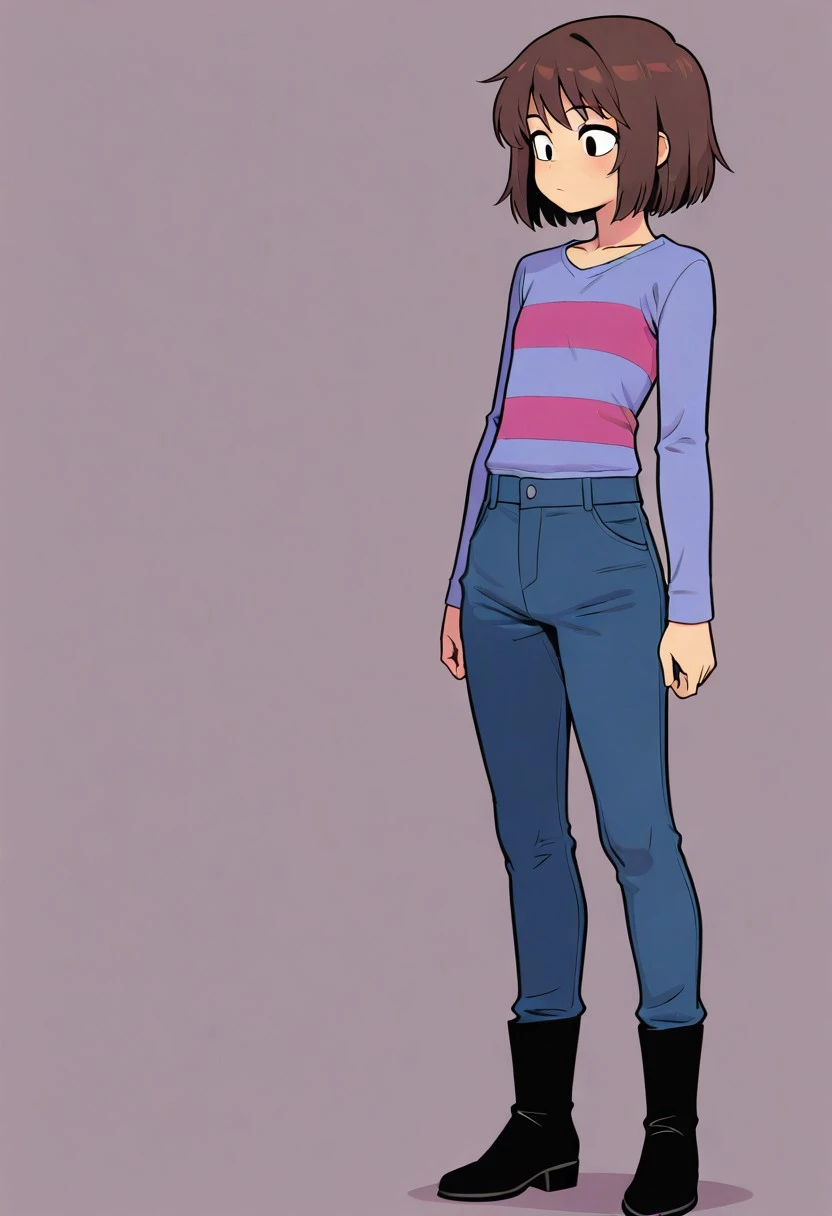 Prompt: Frisky underhertail, solo, 1boy, light brown skin, black eyes, brown hair, long sleeve light blue shirt with two magenta stripes, blue pants, black boots