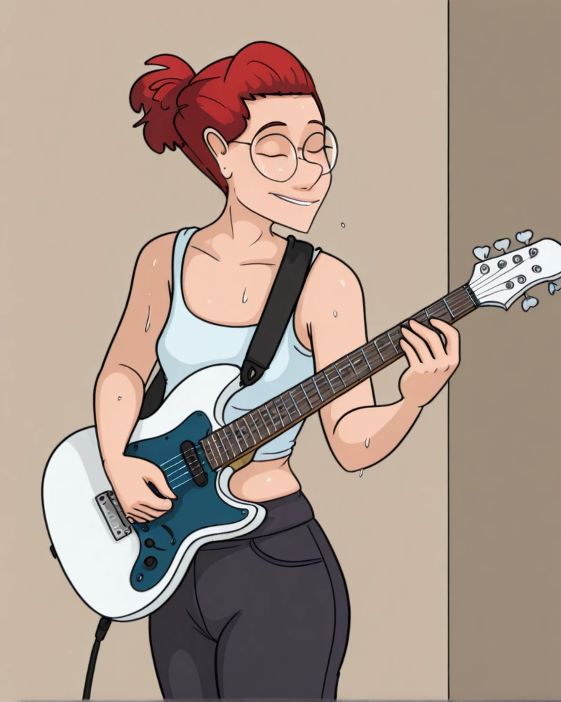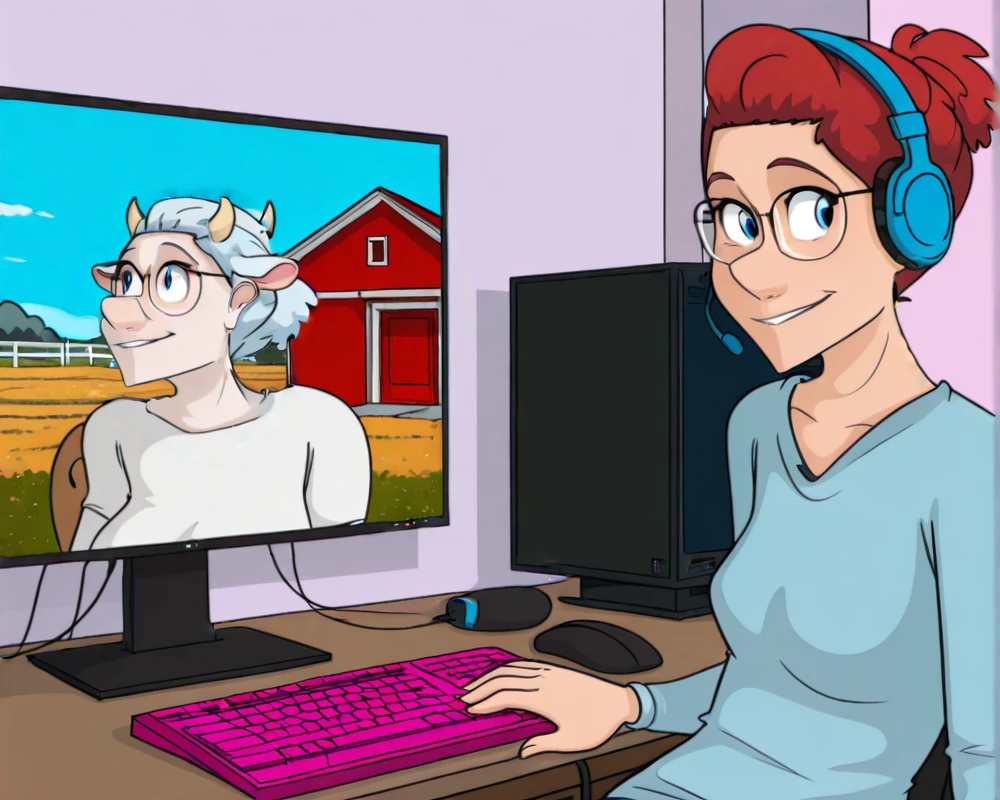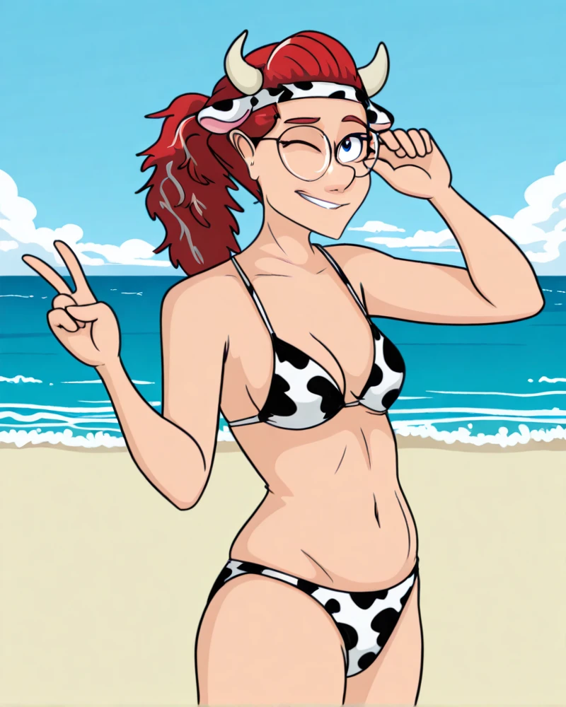 Recommended tags: "red hair, blue eyes, glasses, mature female, milf." Depending on your preferences, she sometimes has "grey hairs, grey streaks in hair."