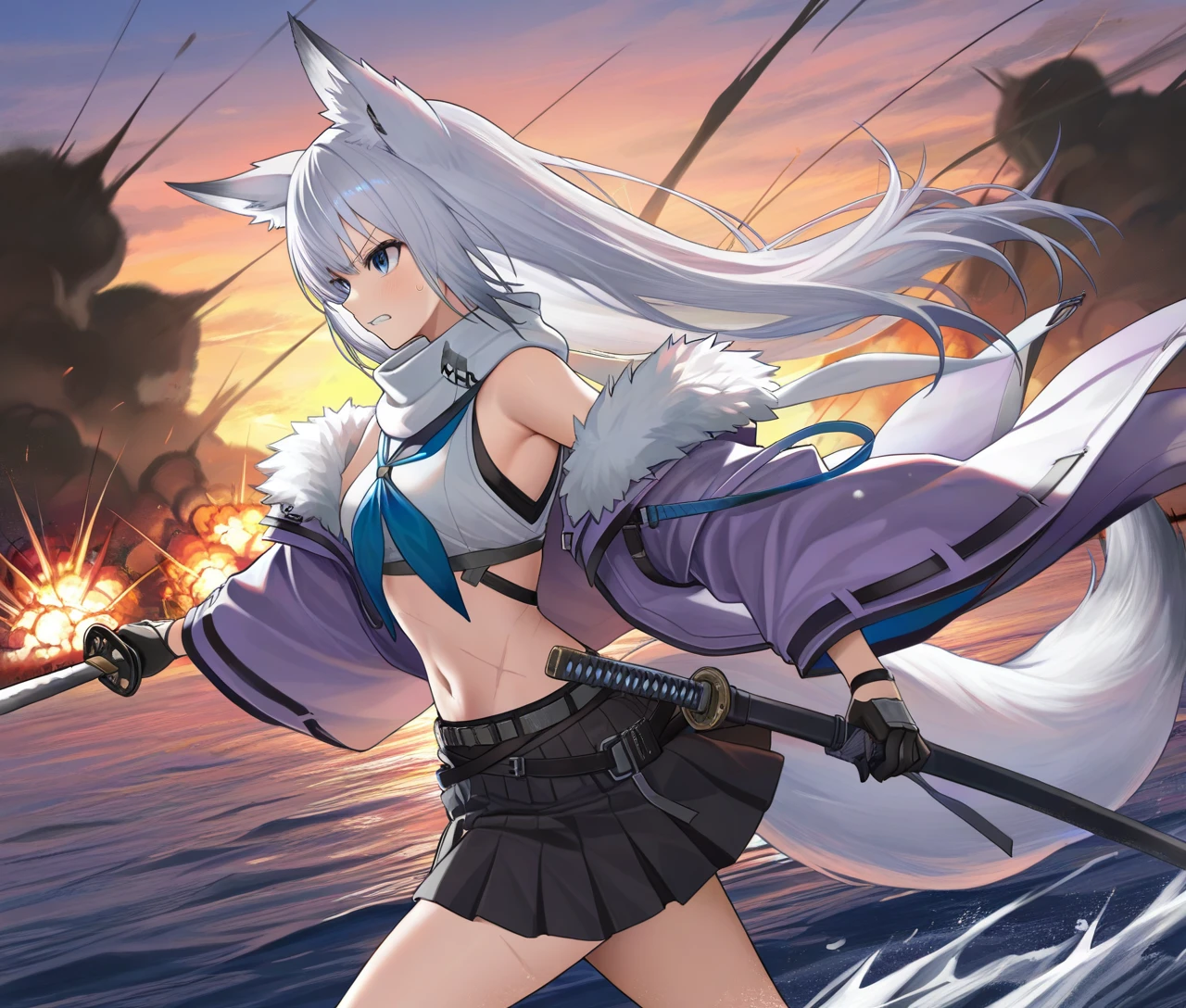 sleeveless, ,white scarf,multiple_belts, cowboy_shot, white_shirt,black_gloves, purple jacket,fur_trim,wide_sleeves, midriff,black pleated_skirt,blue neckerchief,