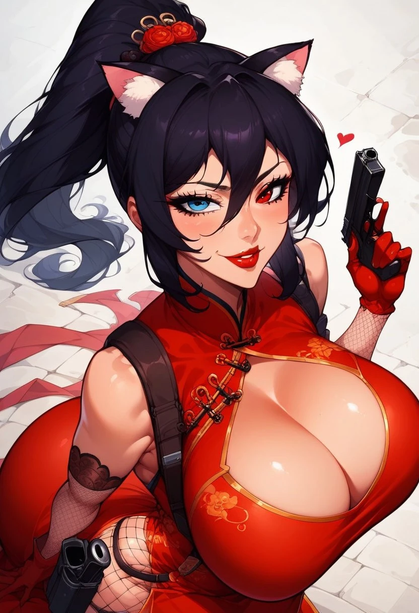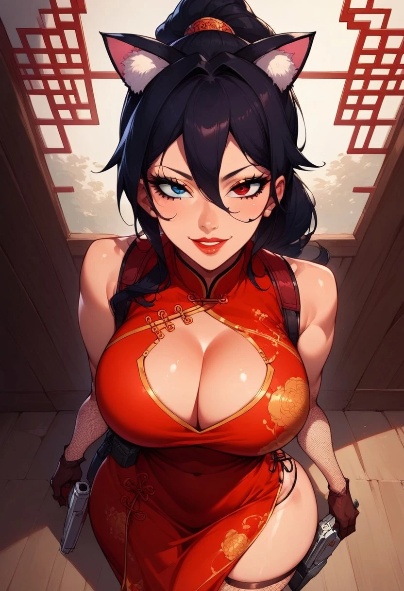 Outfit 1: cleavage. , bangs, dress, chinese clothes, makeup, red dress, cleavage, gloves, fishnets, thighhghs, suspenders with aholster, pistol in holster.