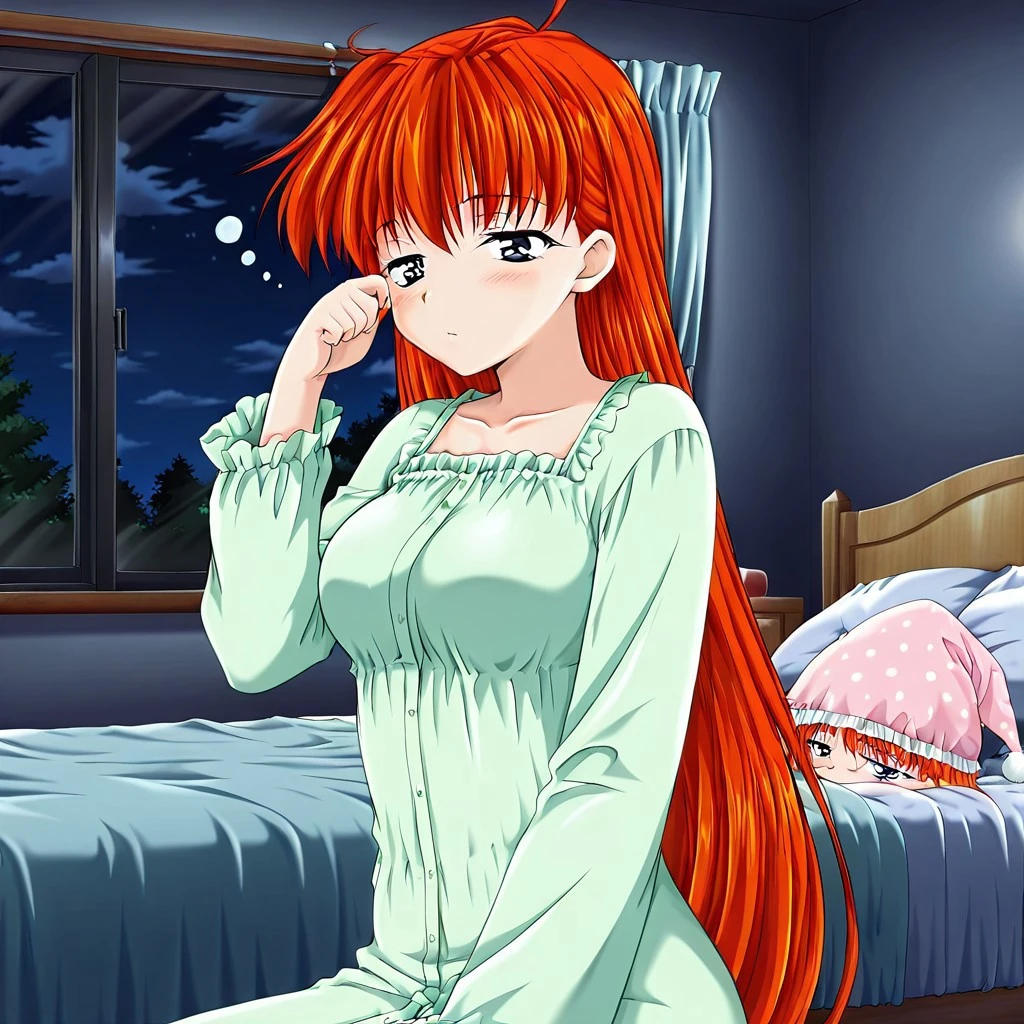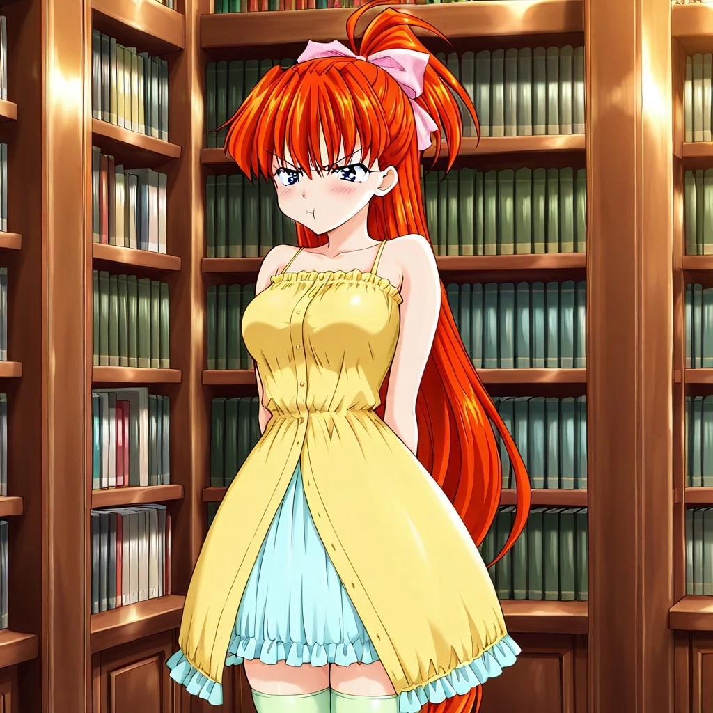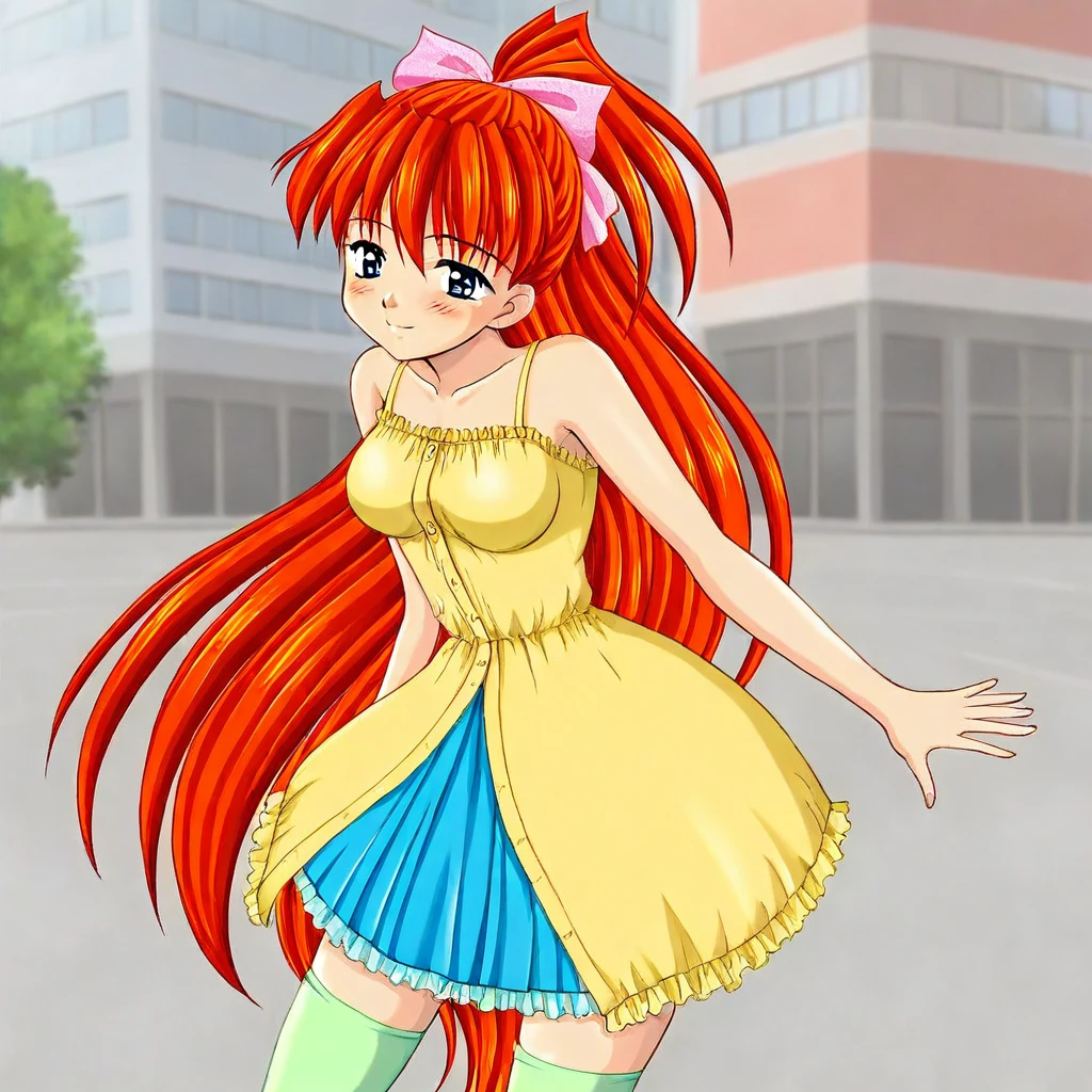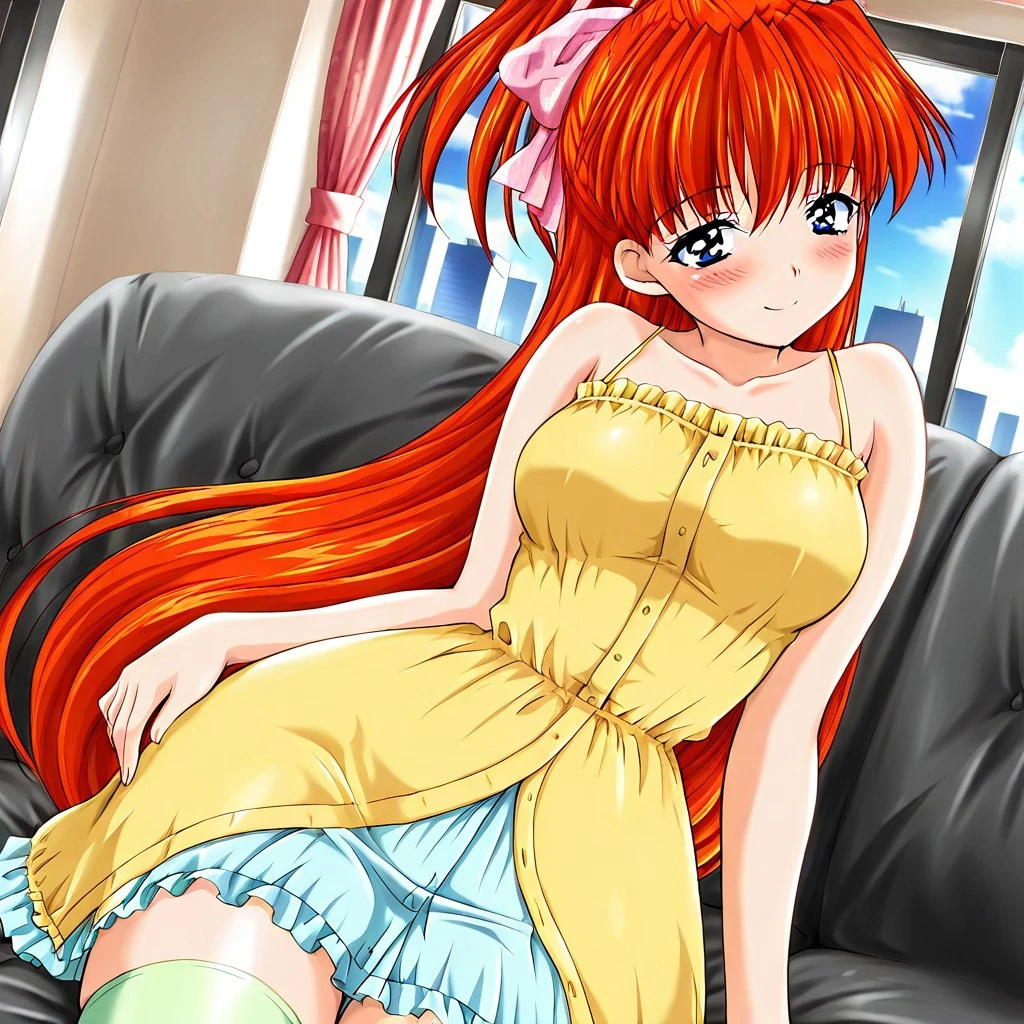 Fukugawa Kyoko: Kyoko, orange hair, long hair, ponytail, blue eyes, medium breasts, hair ribbon, pink bow