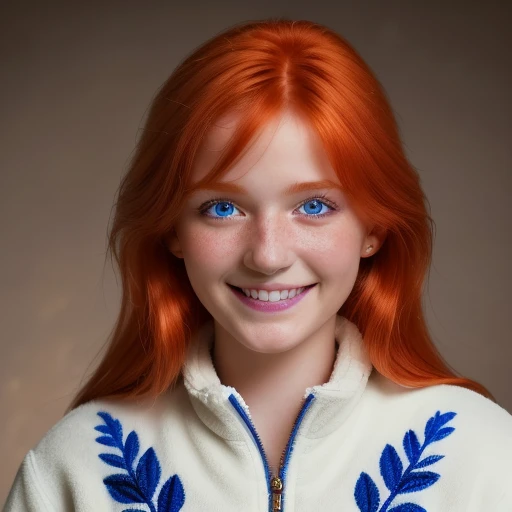 close-up portrait of Irish charm girl, copper hair, wearing white fleece with cobalt blue embroidery, soft studio lighting, happy expression, looking at camera, blurred beige background, 4k, high resolution