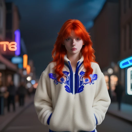 medium shot of Irish charm girl, copper hair, white fleece with cobalt blue embroidery, night time in Dublin city, cinematic lighting, face illuminated by warm pub lights and cool neon, fascinated expression, cobblestone street background