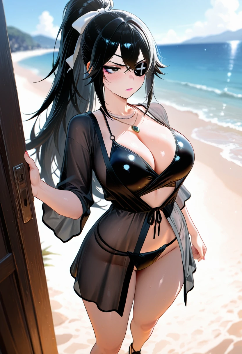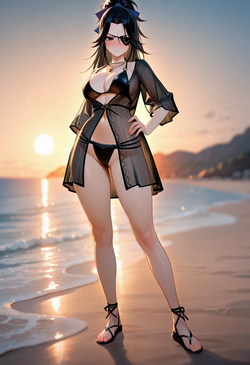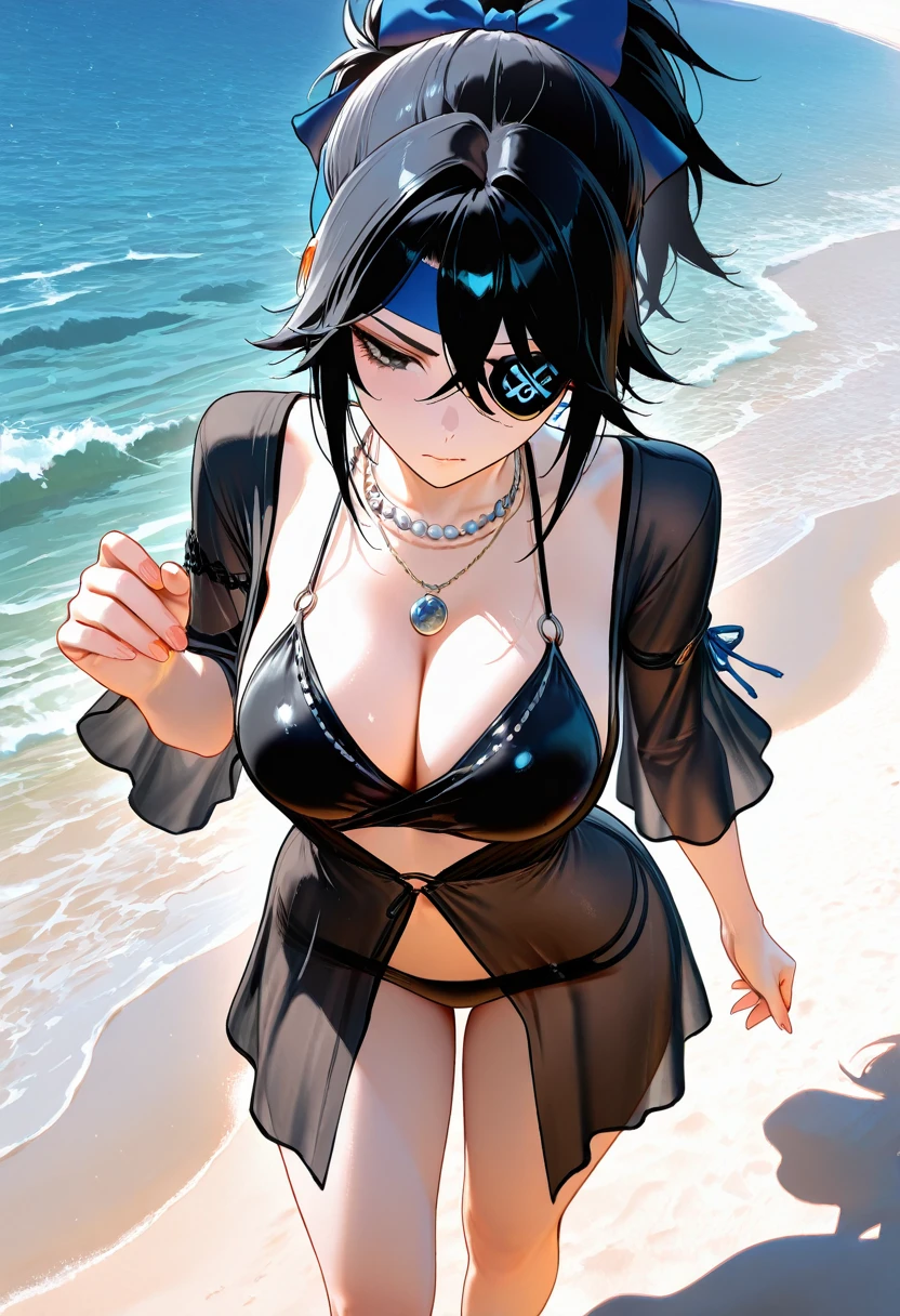valda cui,necklace,cleavage,jacket,black bikini,black dress,swimsuit cover-up,striped clothes,see-through dress,sandals,