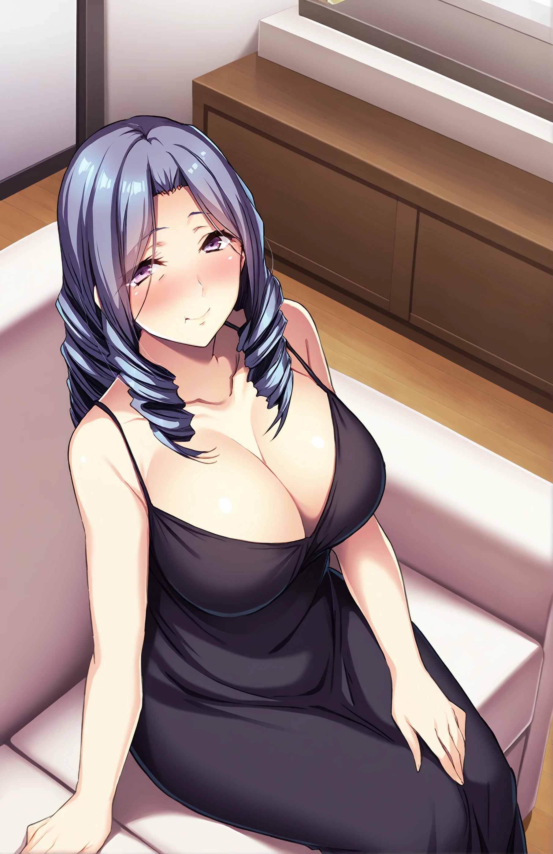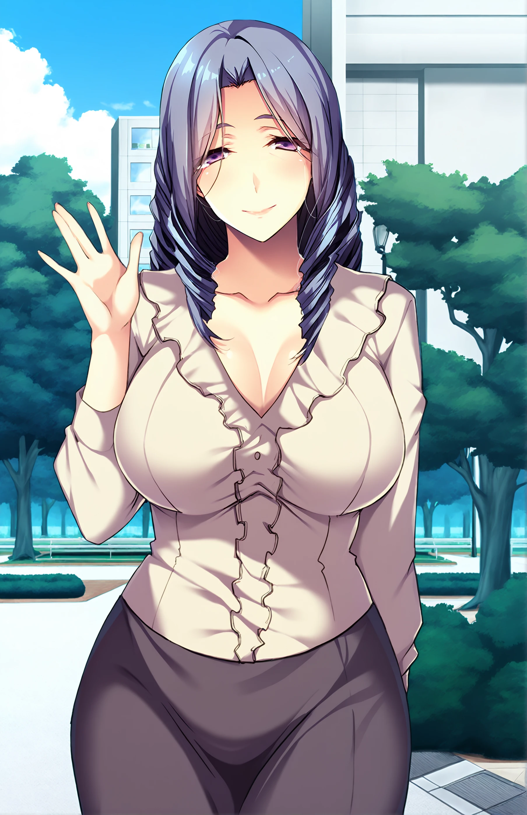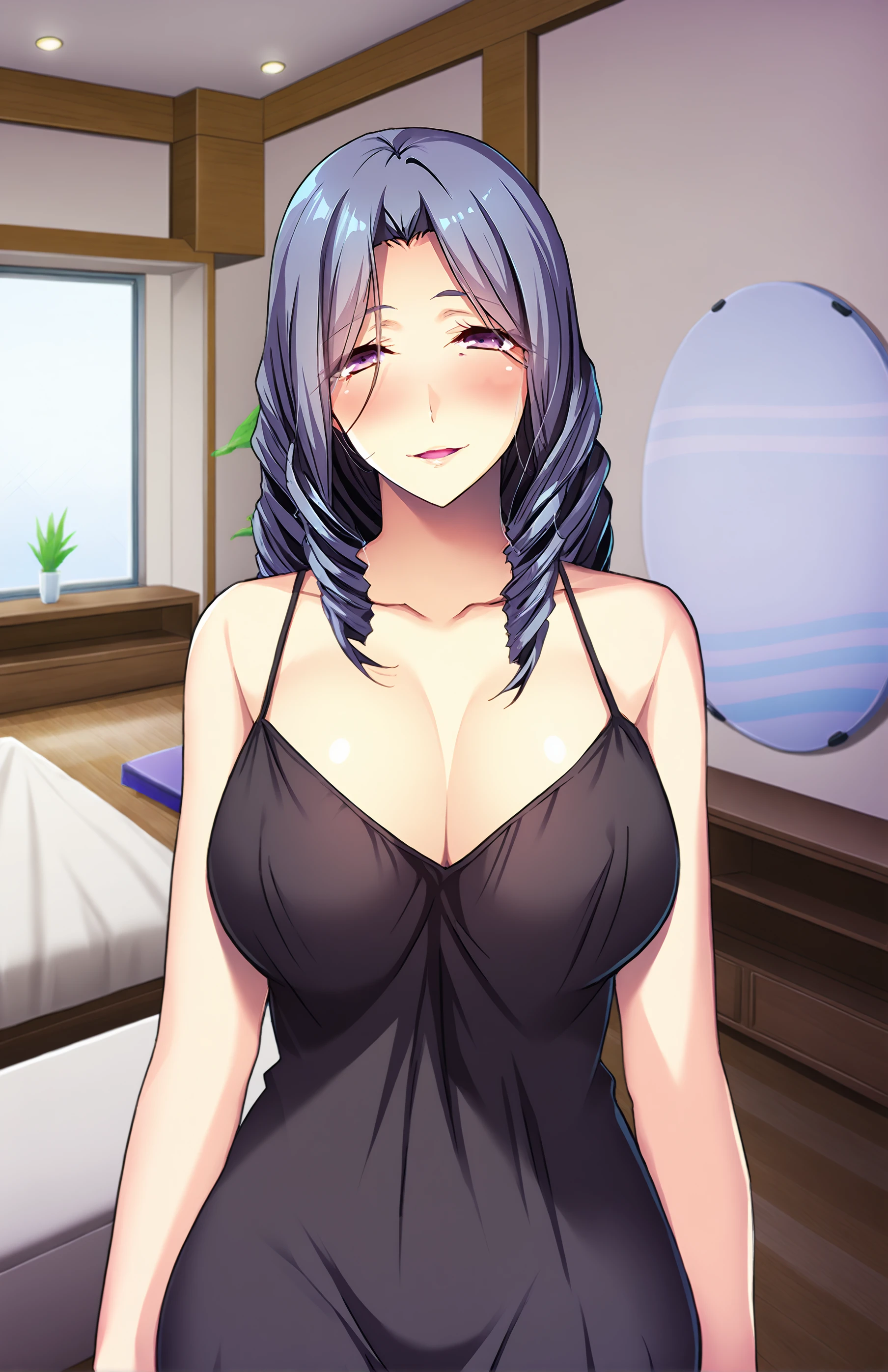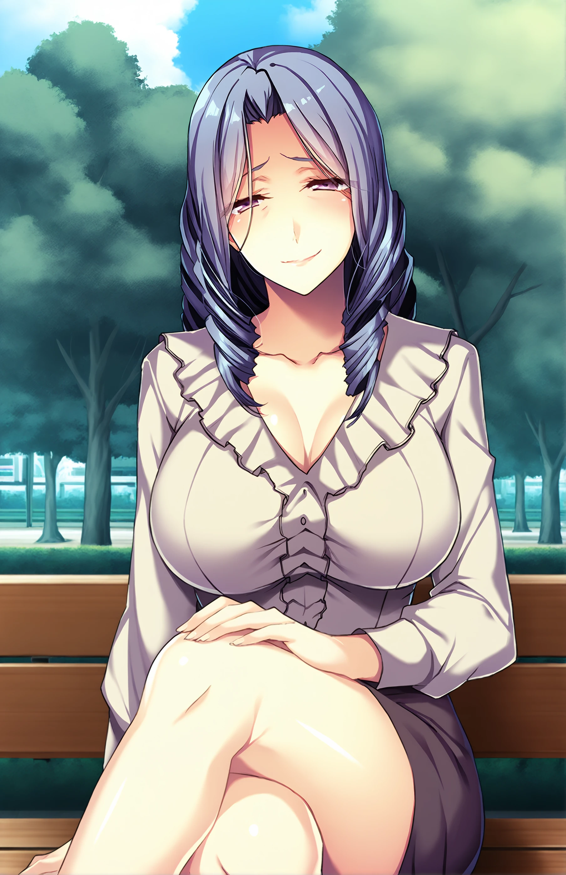 HonamiSob, long hair, wrinkles, breasts, large breasts, purple eyes, drill hair, mature female