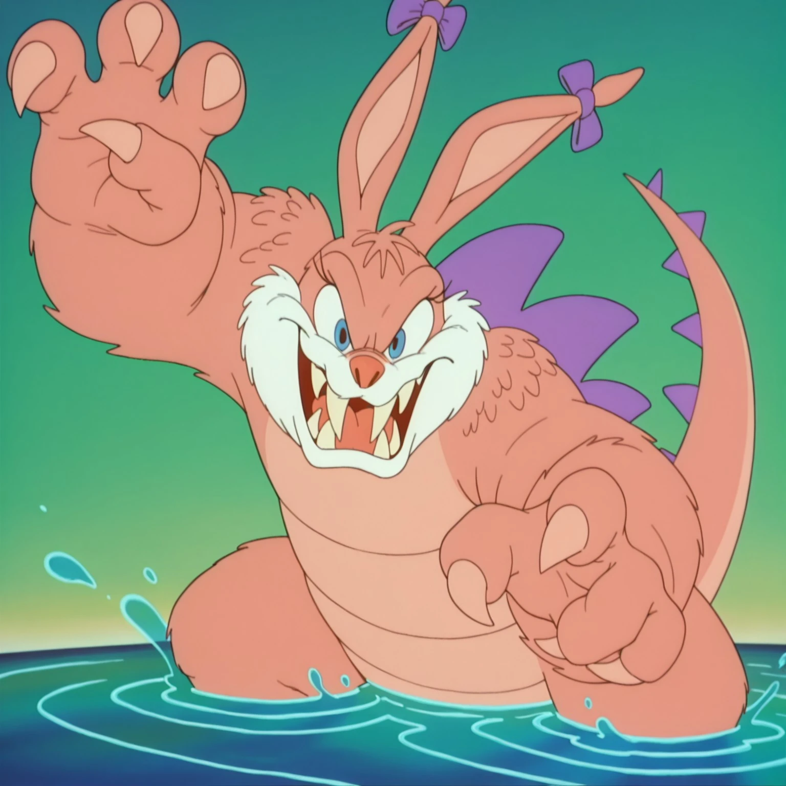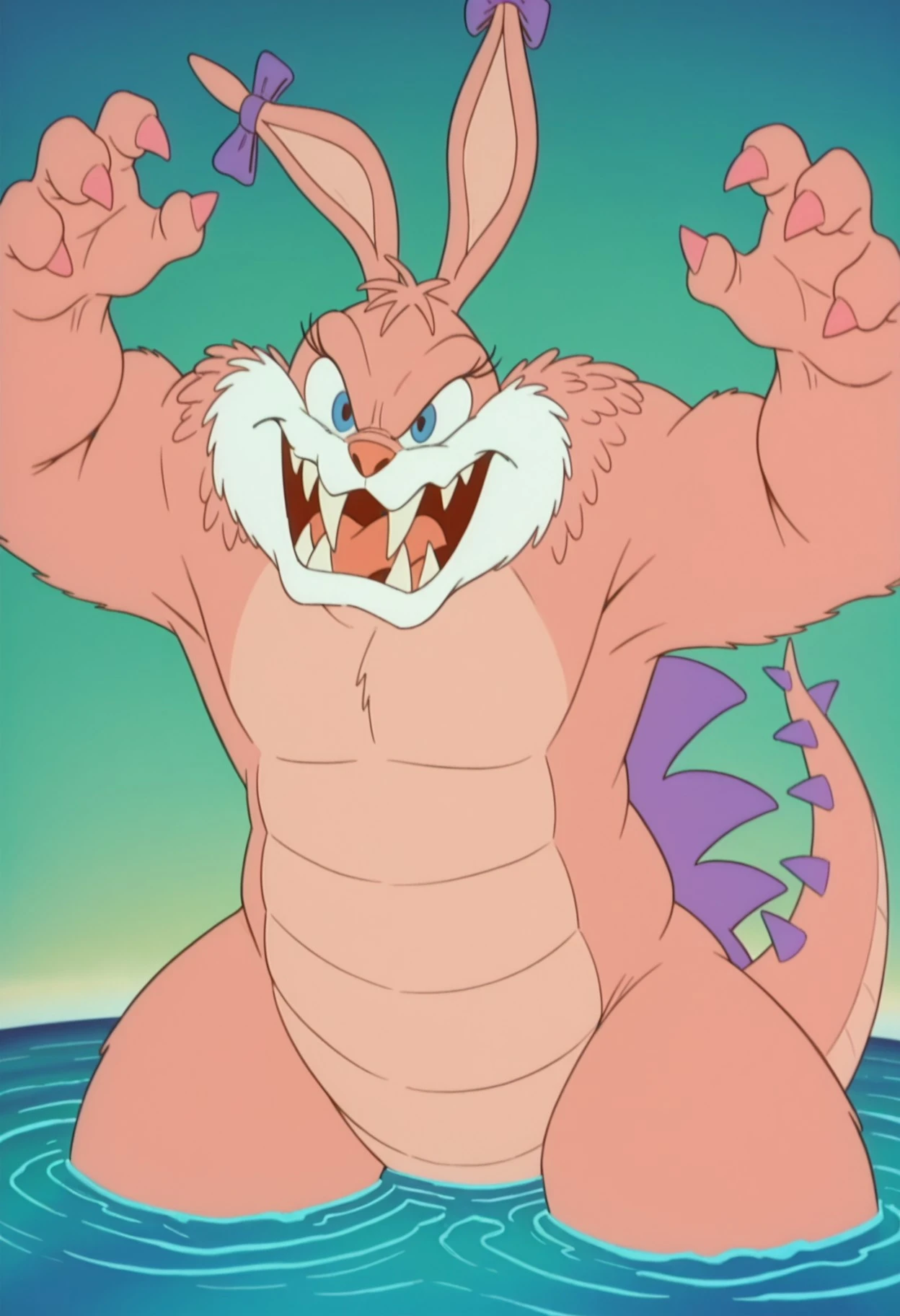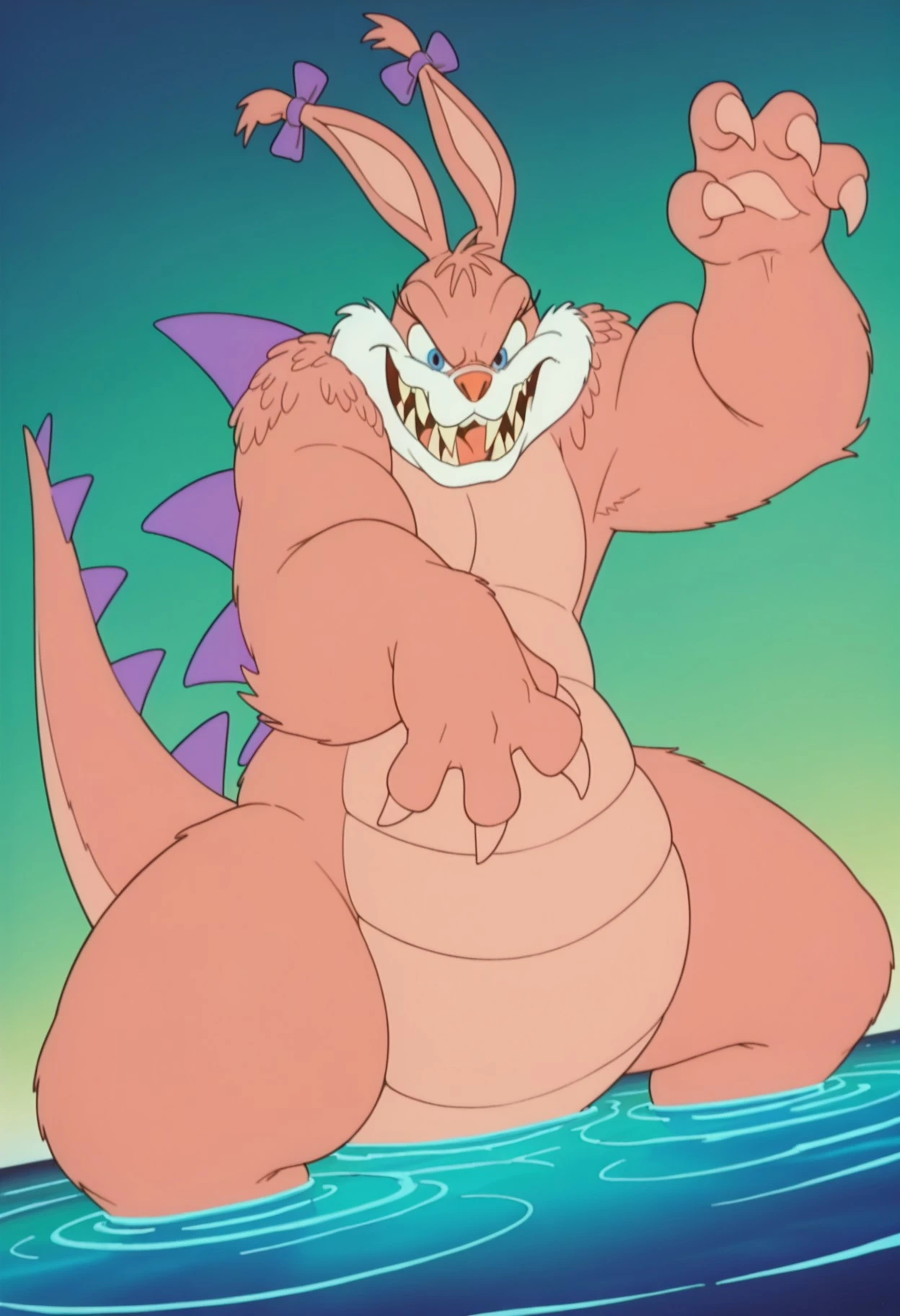 Babzi11a, Babs Bunny, kaiju, claws, rabbit ears, purple bow on ears, tail, tail spikes, back spikes, blue eyes, sharp teeth, thick body, thick arms