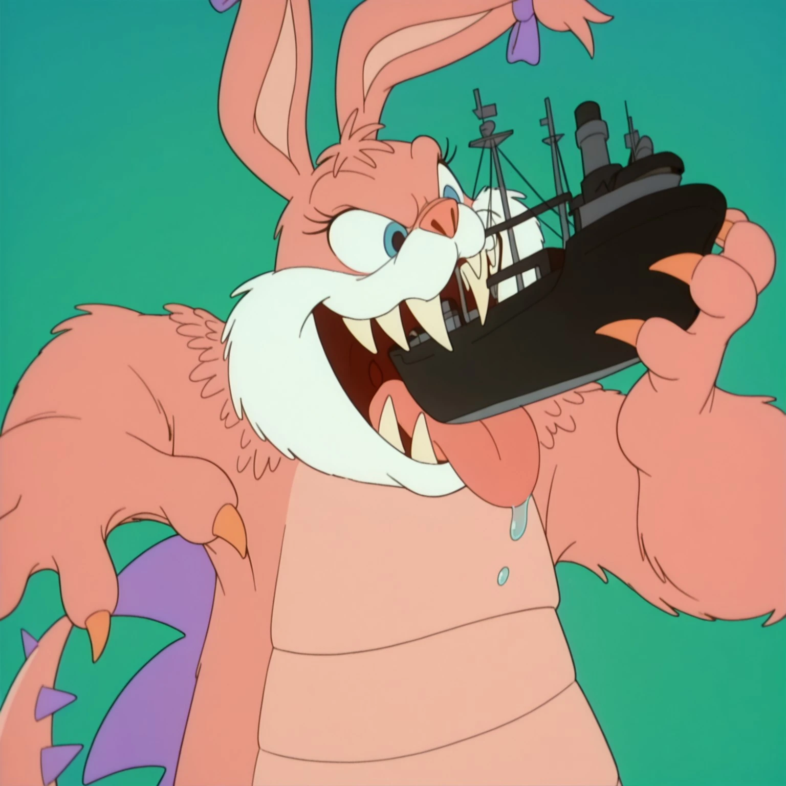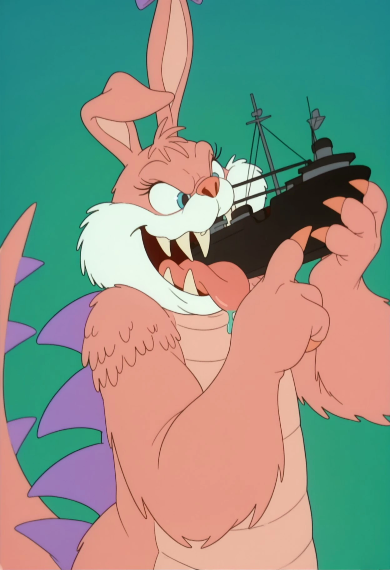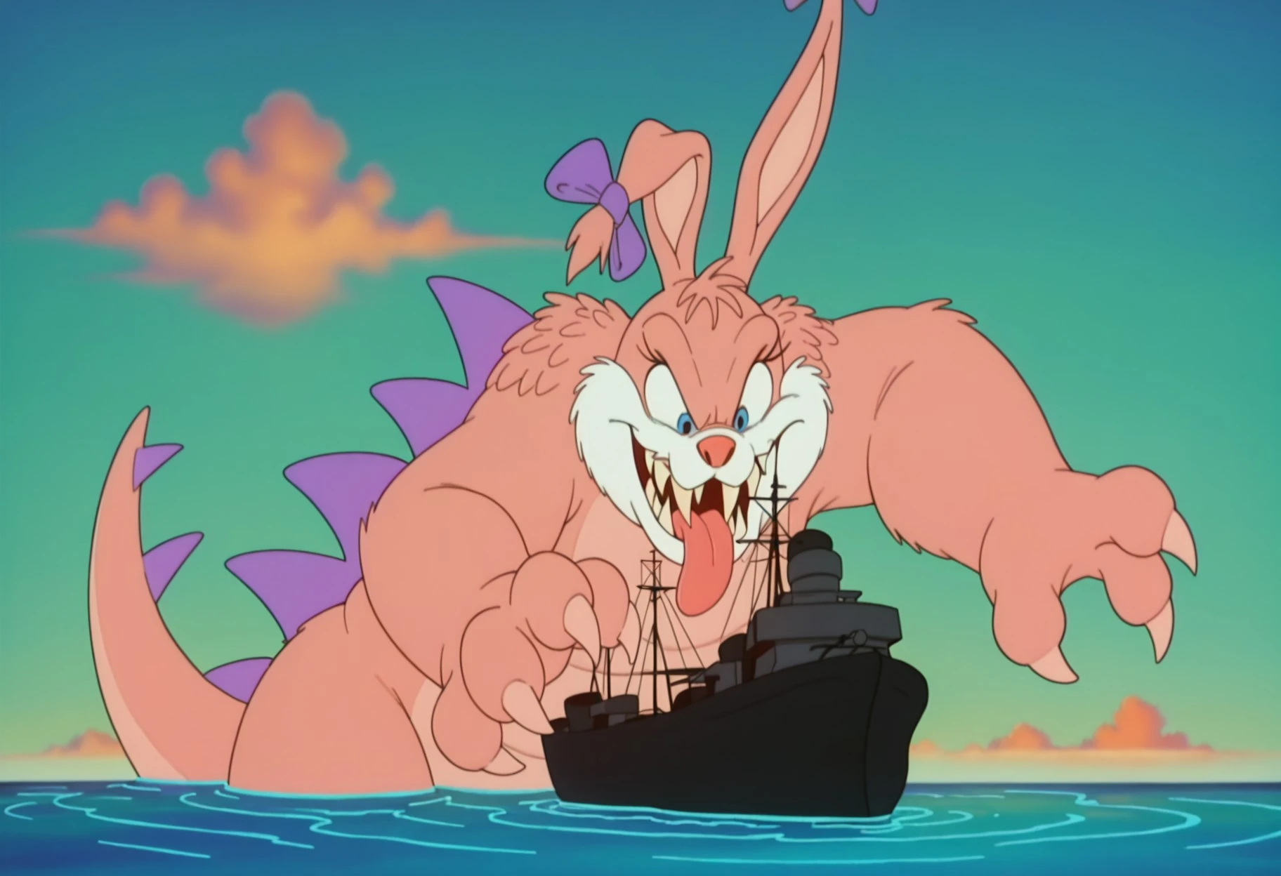 Babzi11a, Babs Bunny, kaiju, claws, rabbit ears, purple bow on ears, tail, tail spikes, back spikes, blue eyes, sharp teeth, thick body, thick arms
