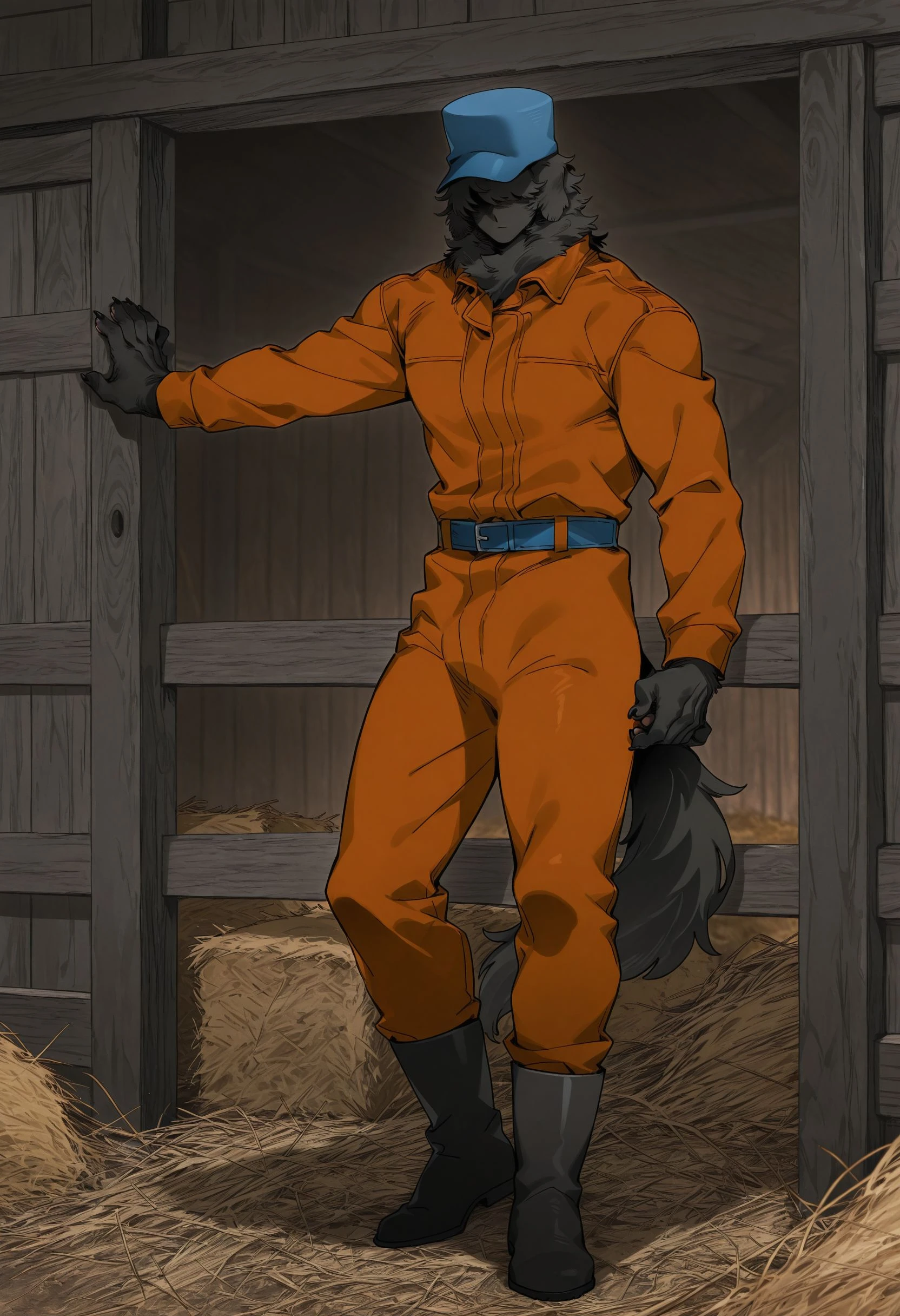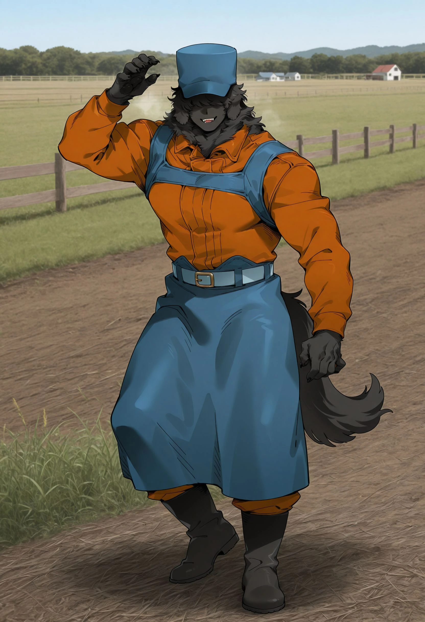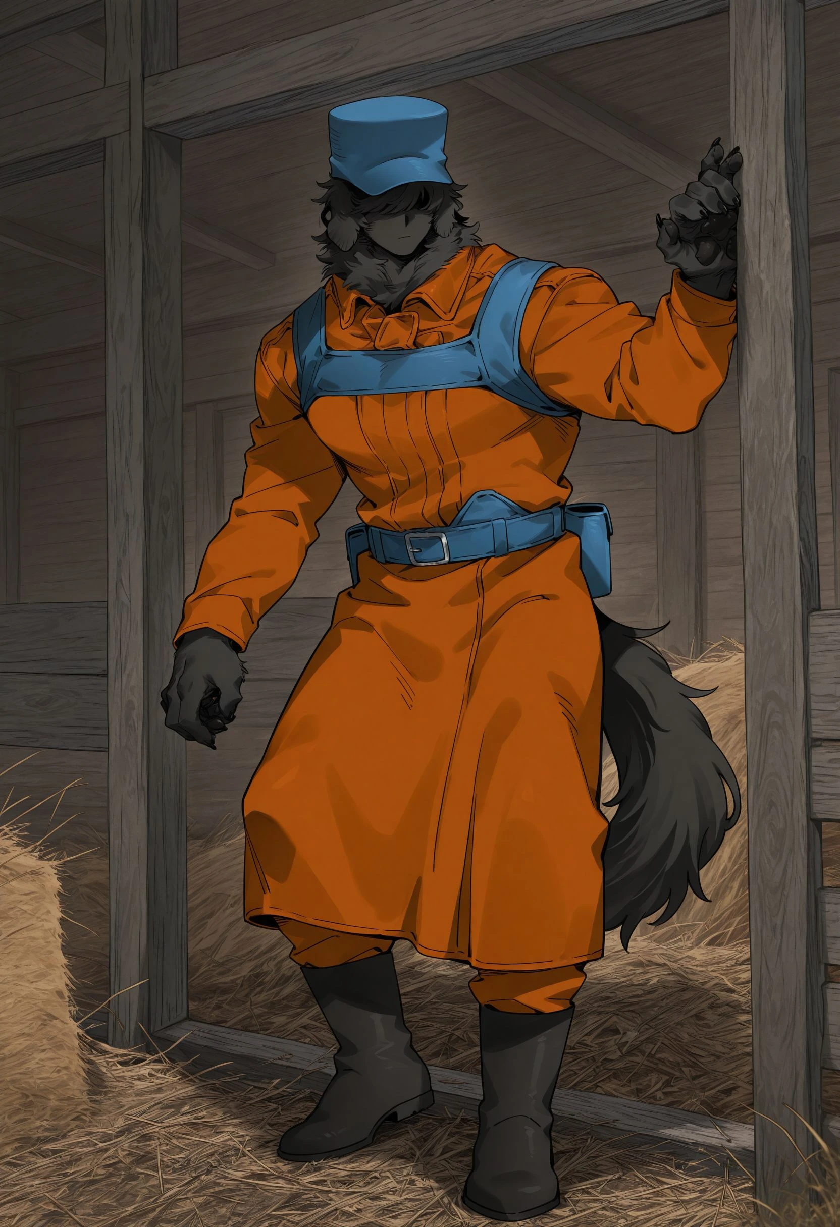 floppy ears, black fur, no eyes, male,dog_fluffy, tail, paw pads, fur body, barefoot, claws, human face, humanoid face,