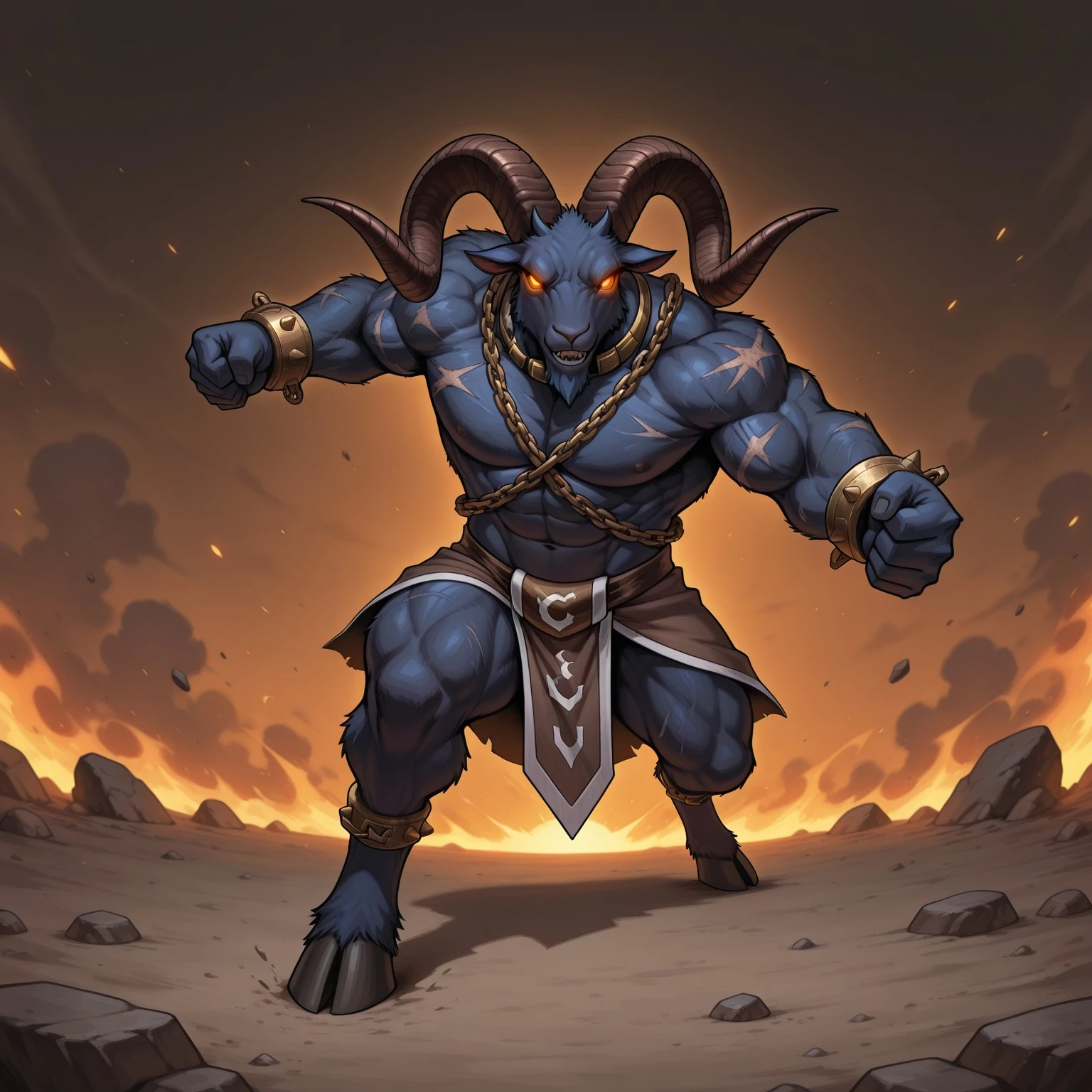 GoatLord,1male, anthro goat, muscular build, dark blue-gray fur, goat face, long downward beard, sharp teeth, glowing orange eyes, spiral ram horns, goat legs, cloven hooves, heavy chains across chest, metal collar, wrist , ankle , scars on torso, brown waist cloth,