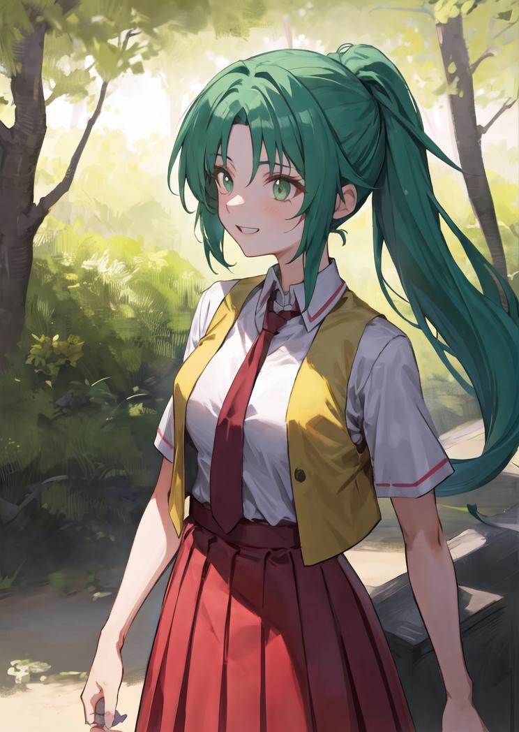 For Mion's school uniform, use school uniform, collared shirt, red necktie, yellow vest, open vest, red skirt, short sleeves tags.