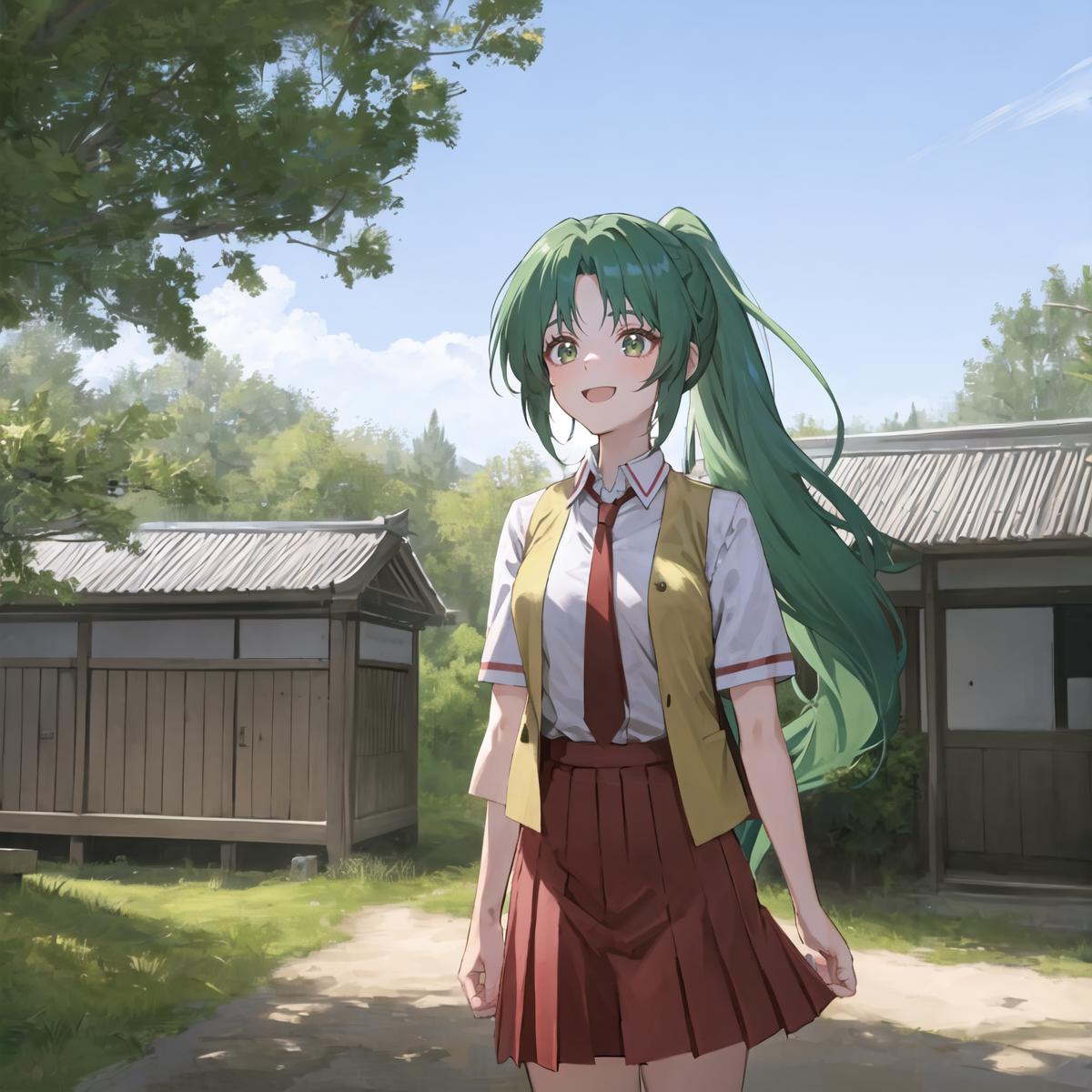 For Mion's head, use ponytail, green hair, long hair, green eyes, tags.