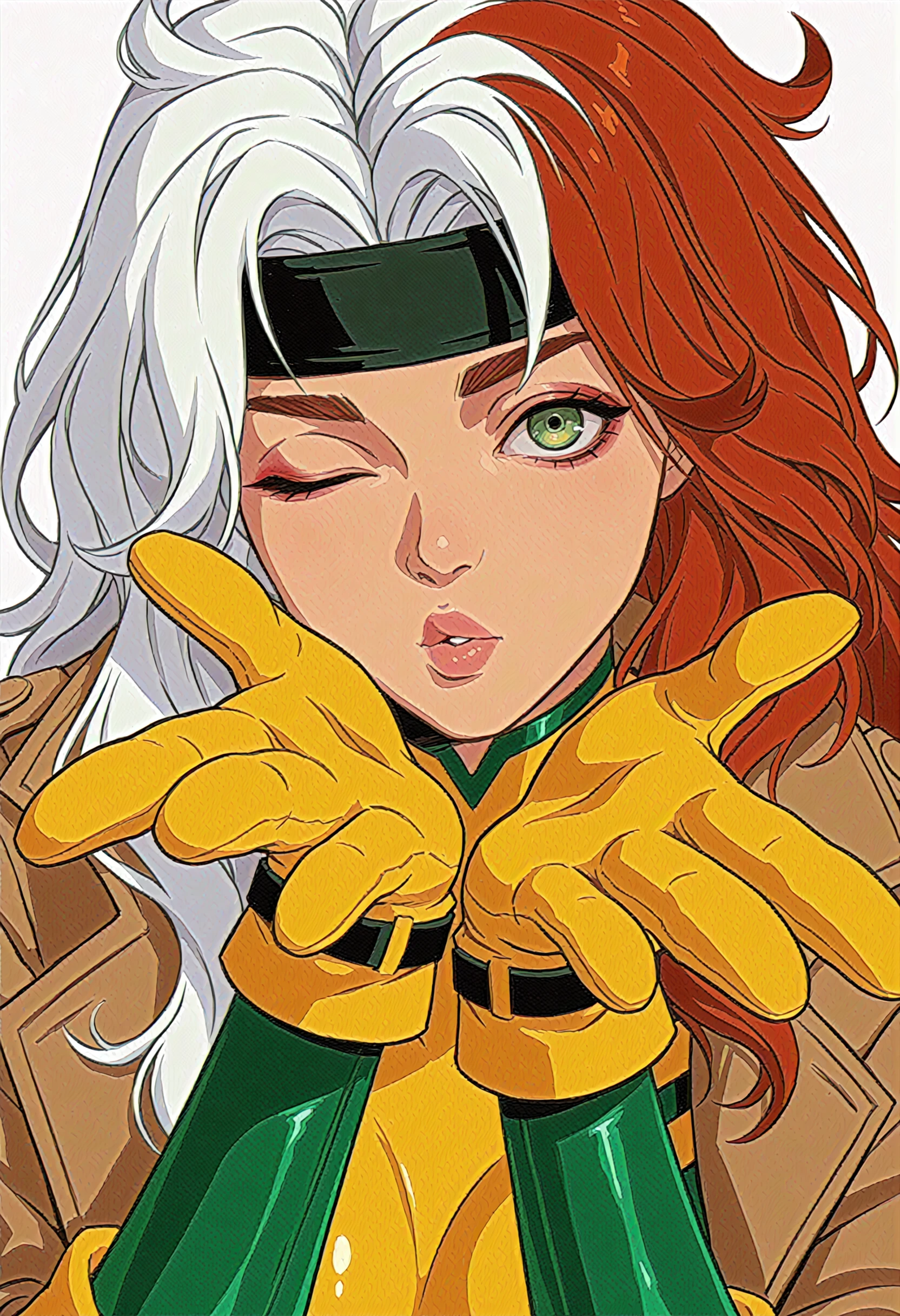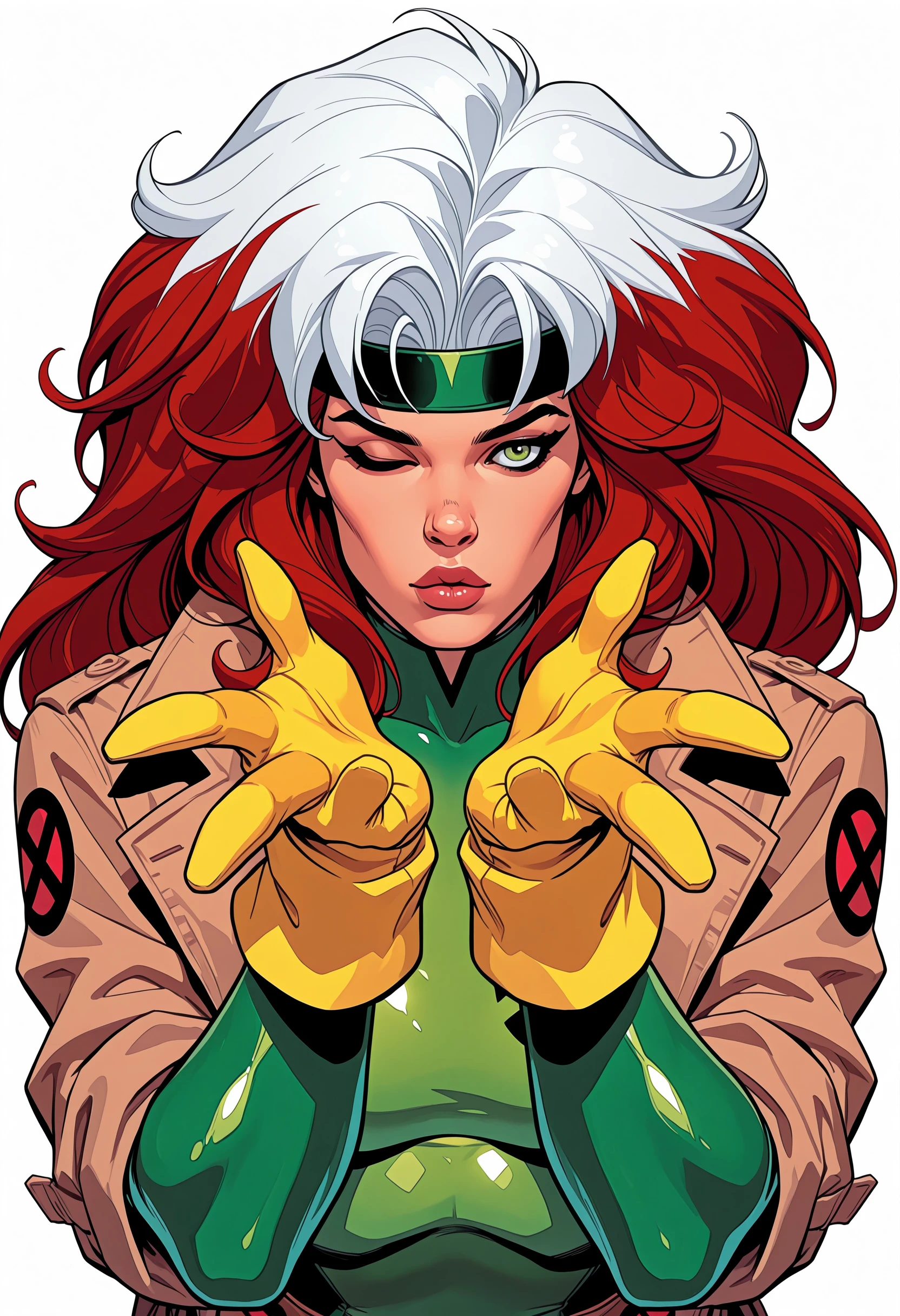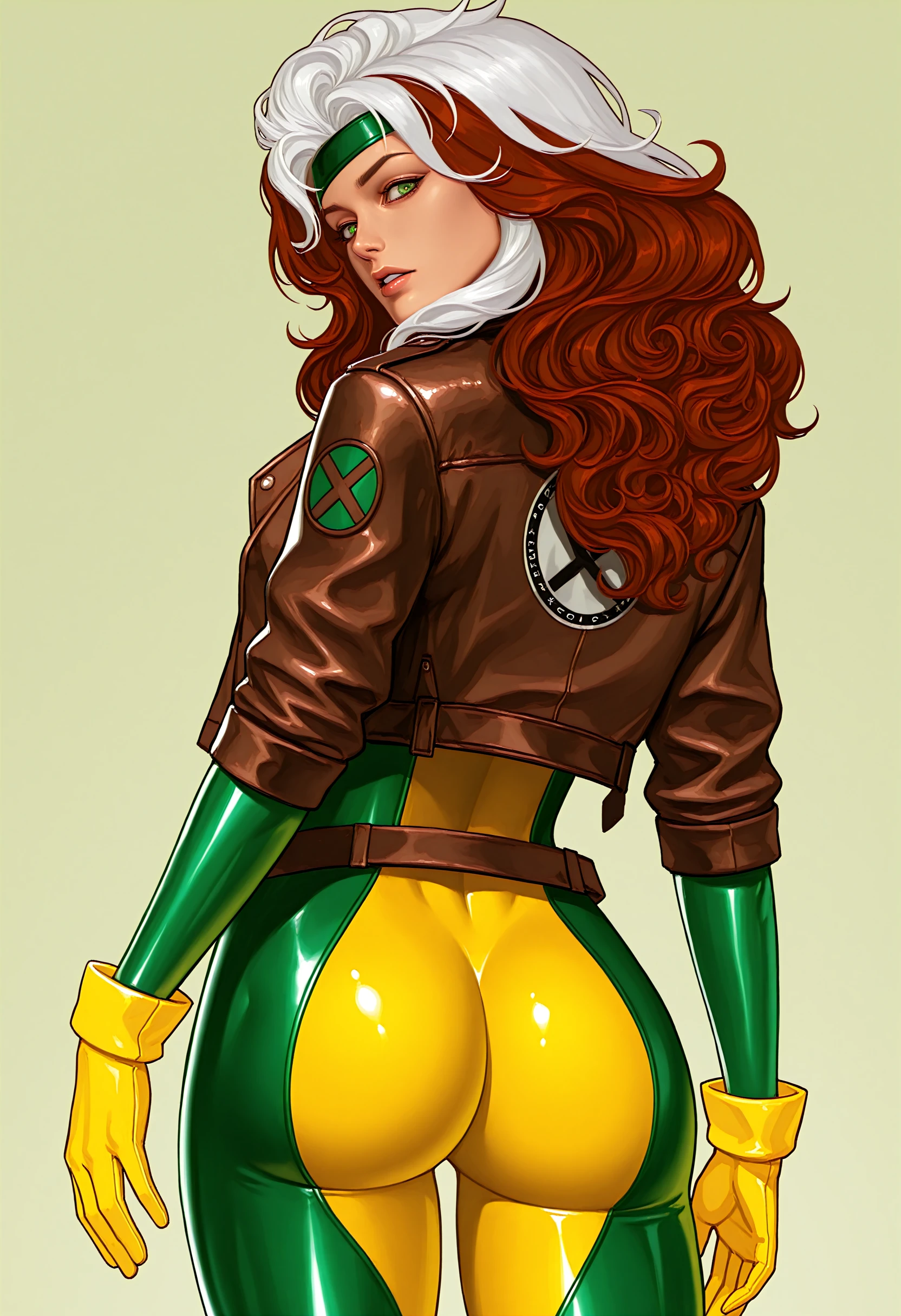 Classic outfit: Bodysuit that's yellow and green, her bomber/crop jacket and a green headband with fluffy/curly auburn hair with the skunk stripe.