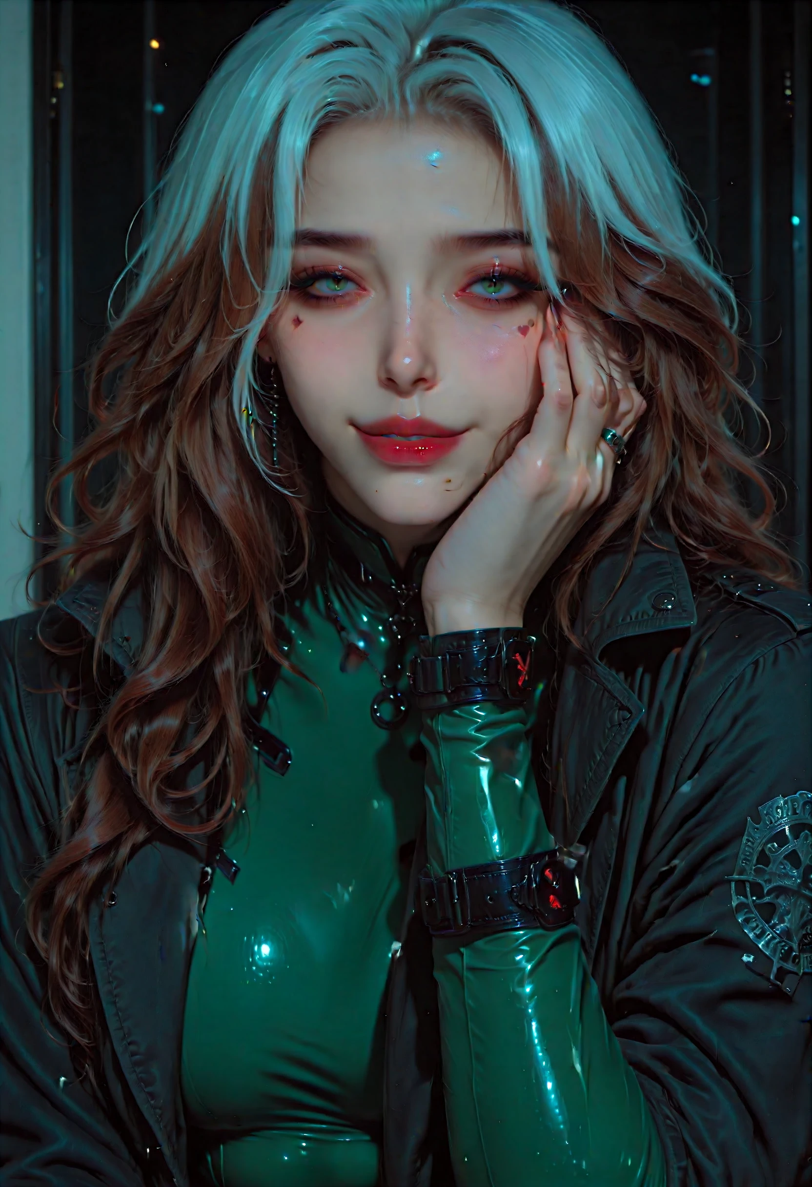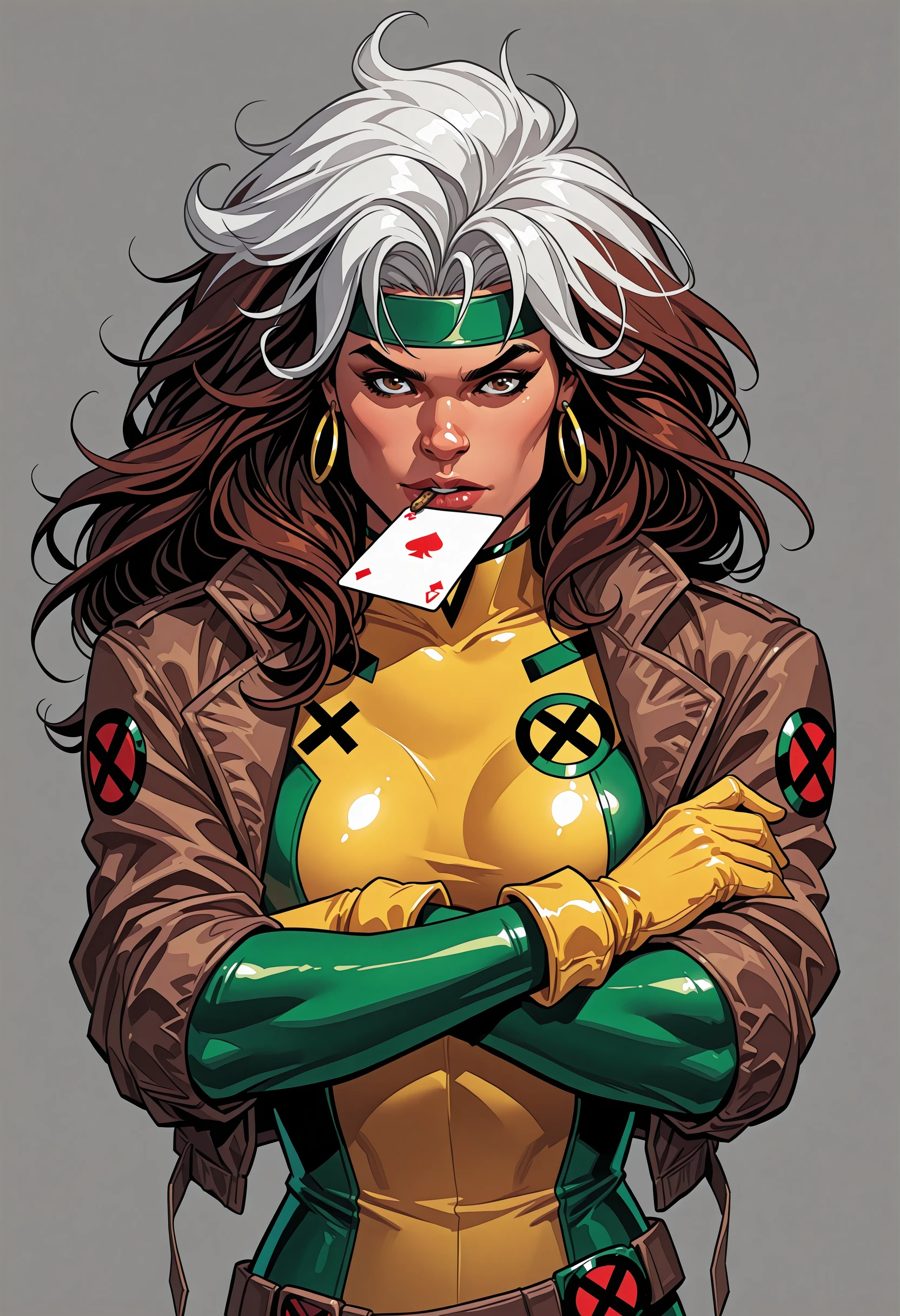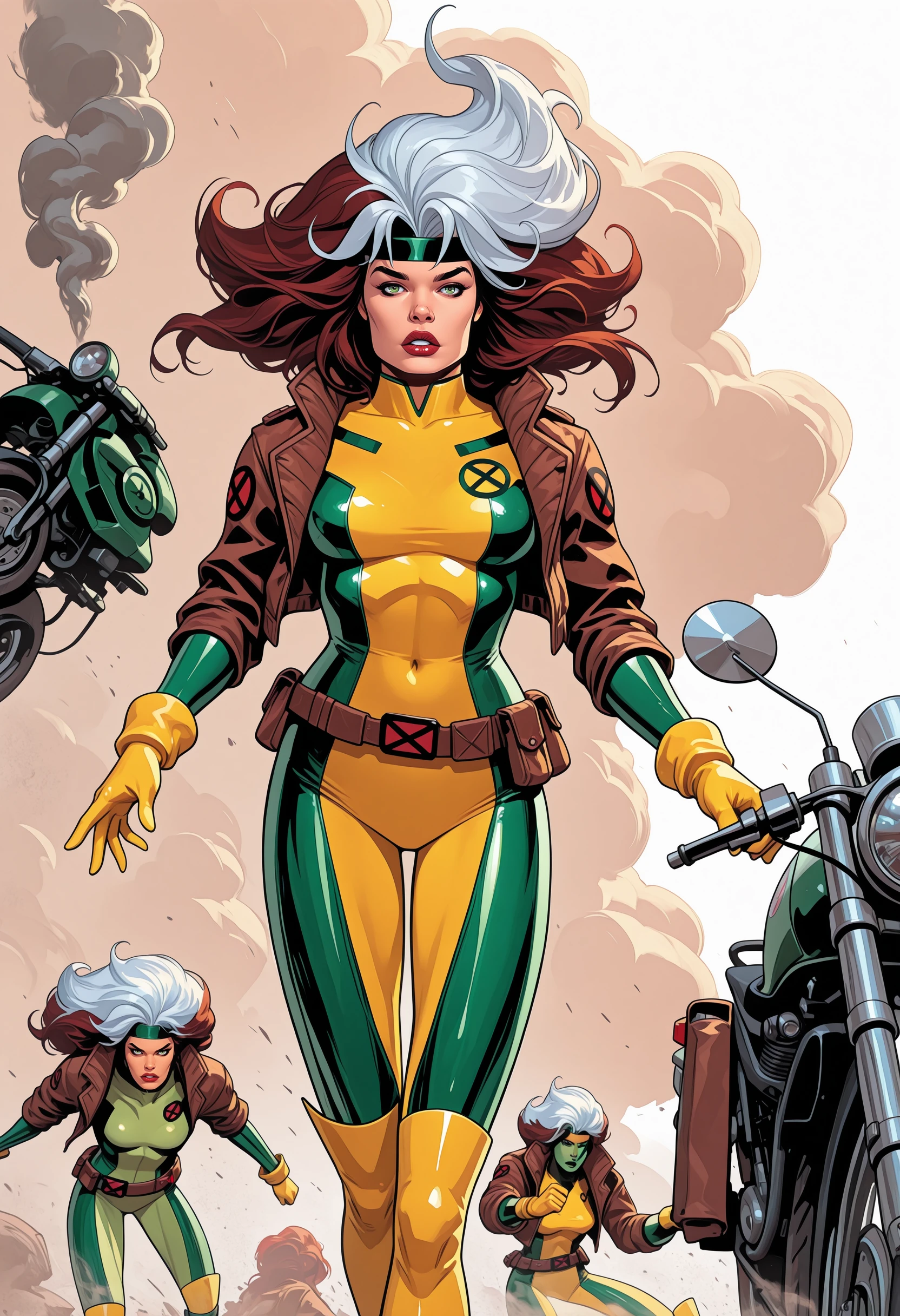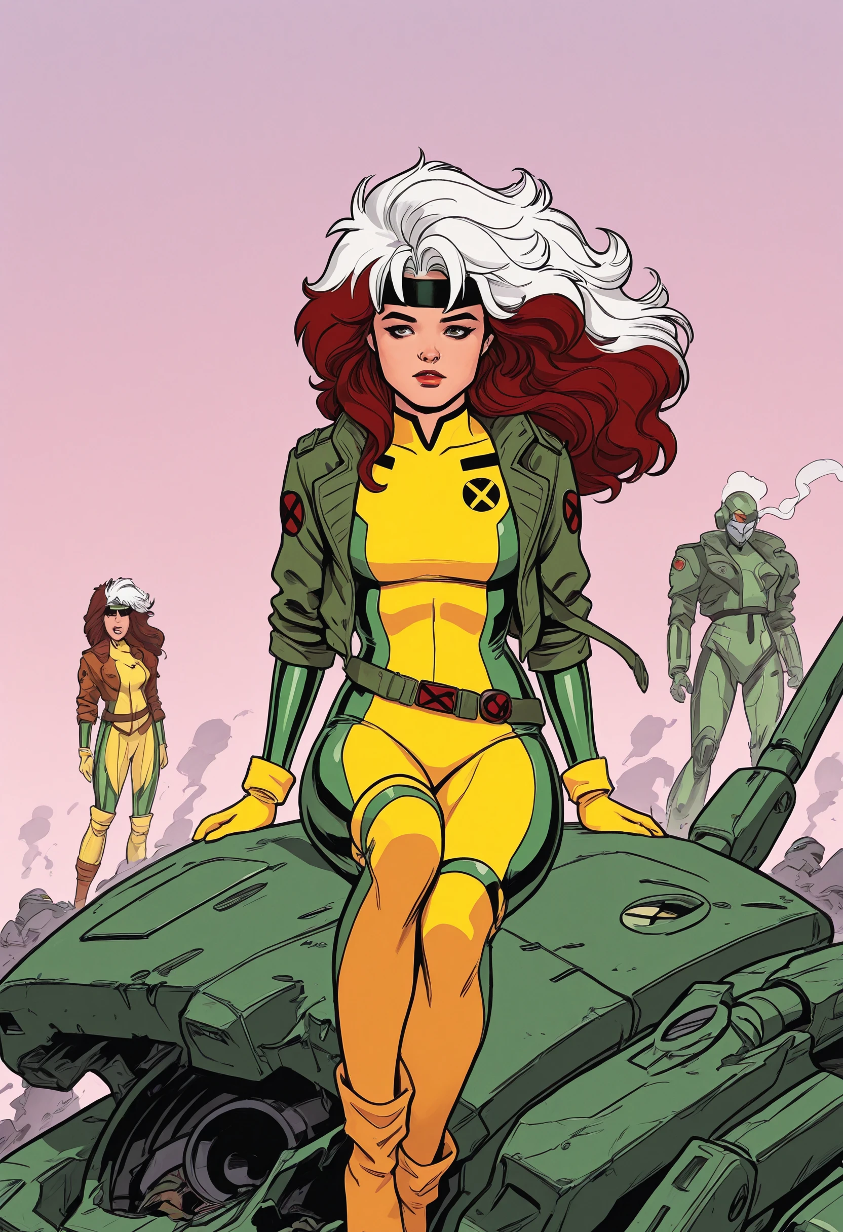 Classic outfit: Bodysuit that's yellow and green, her bomber/crop jacket and a green headband with fluffy/curly auburn hair with the skunk stripe.