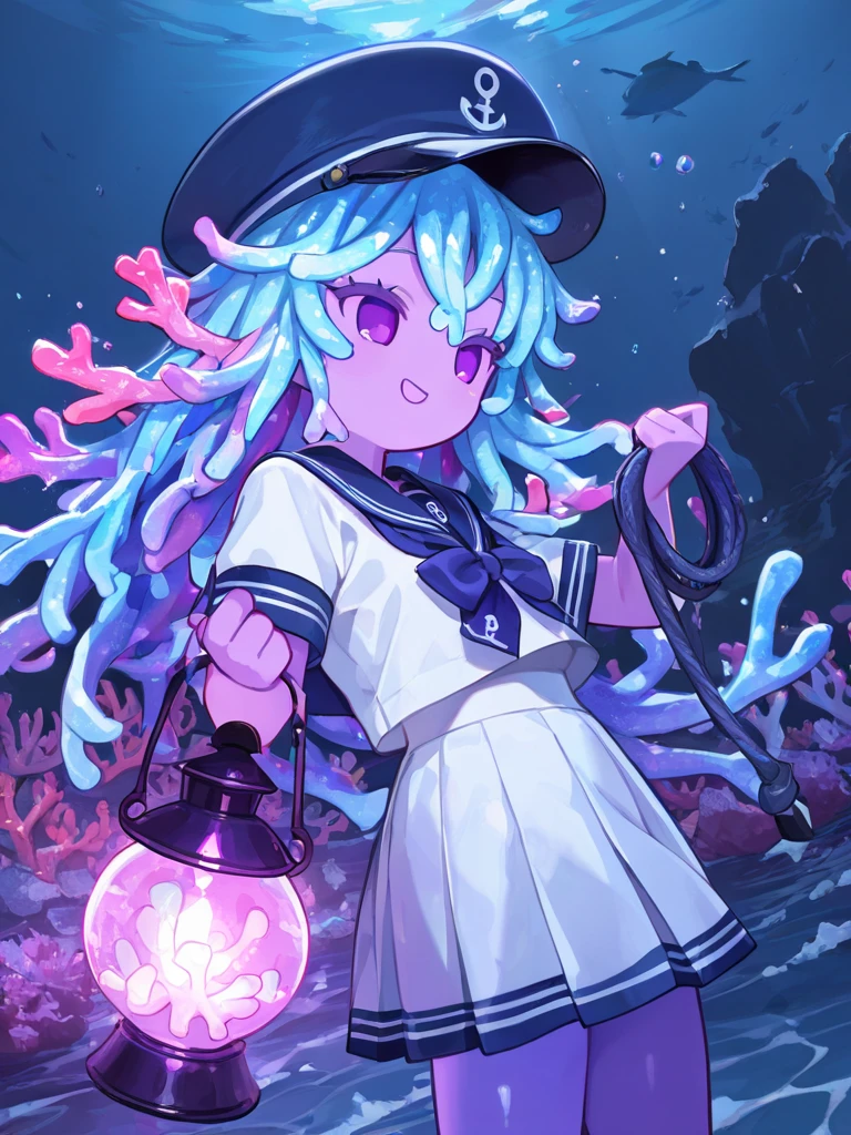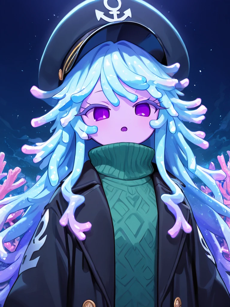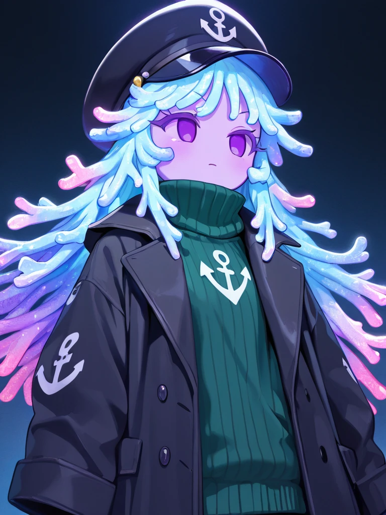 scoral, 1girl, solo, coral hair, blue hair, purple eyes, purple eyelashes, no sclera, no nose, purple skin, colored skin, black hat, anchor symbol, green sweater, black coat, chibi
