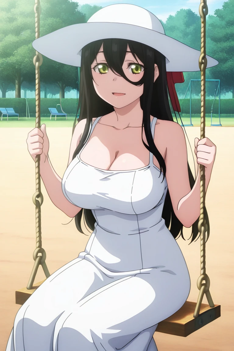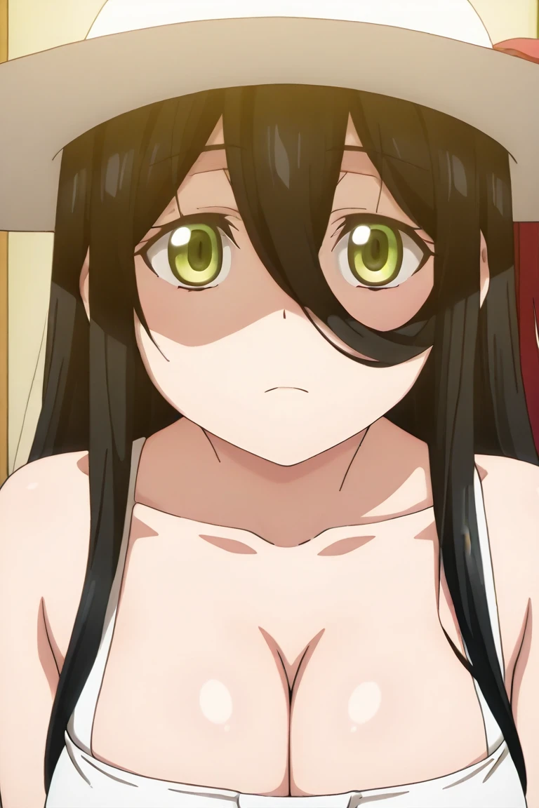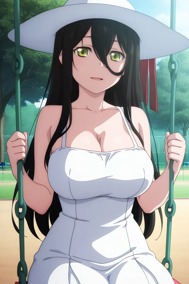 1girl, hasshaku-san, black hair, long hair, green eyes, large breasts