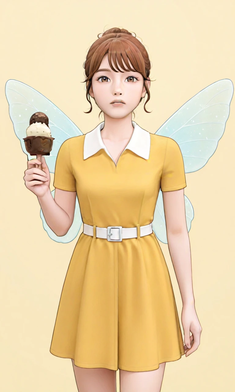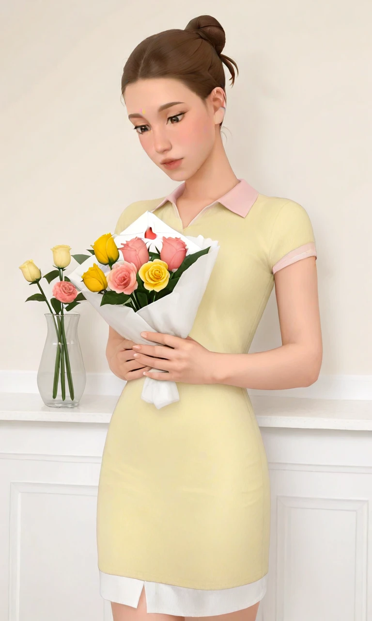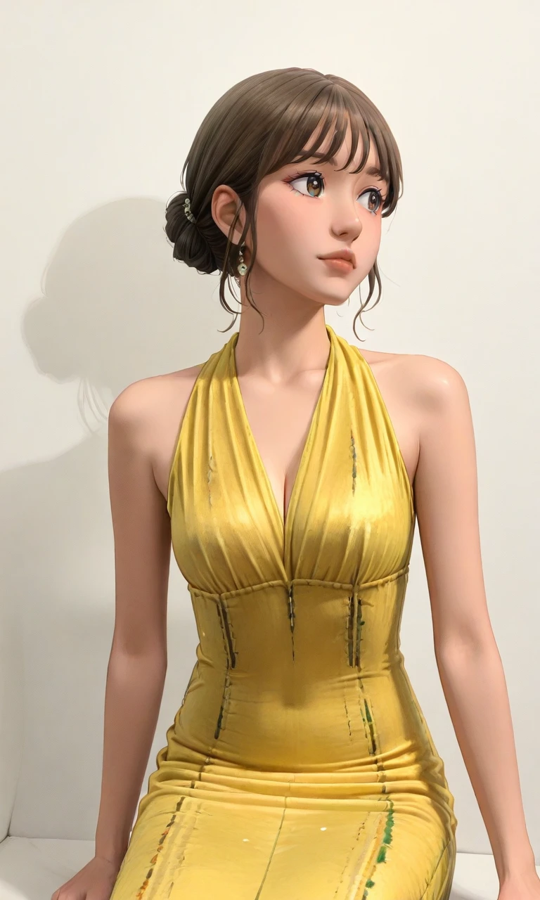 1girl,single hair bun,bangs,brown hair,brown eyes,yellow dress