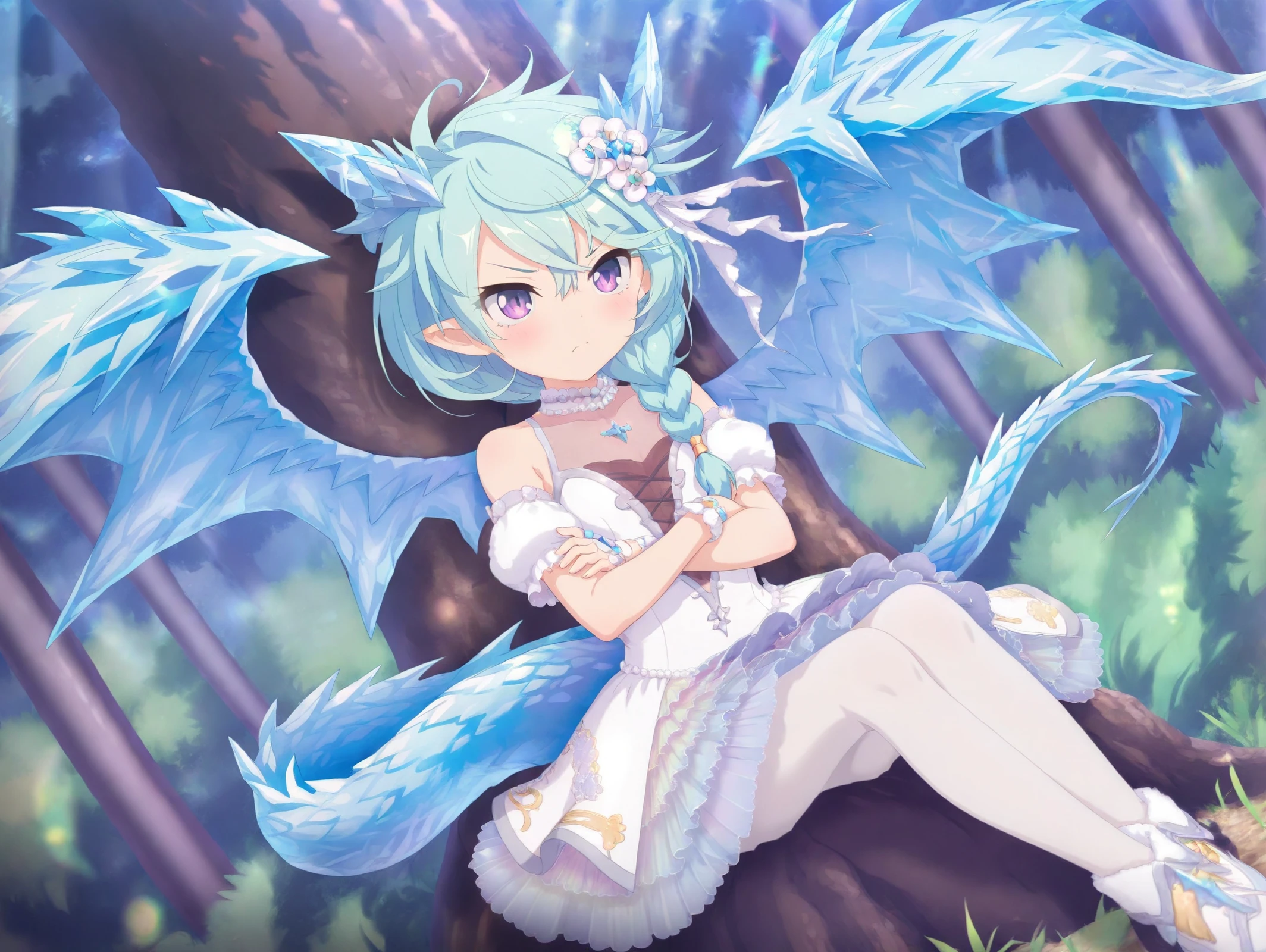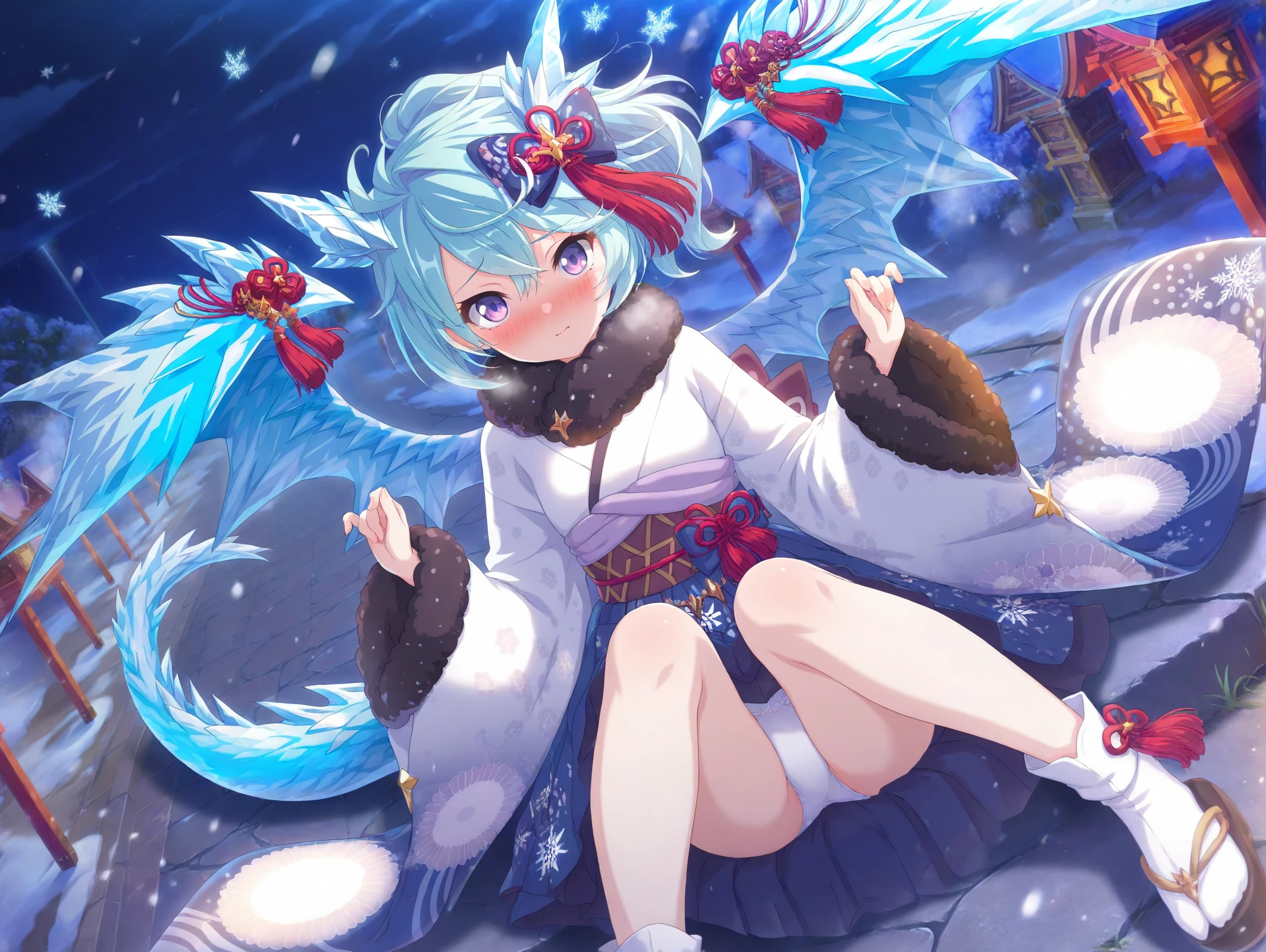 absurdres,official style,<lora:Shefi54??:1>,Shefi,1girl,fur trim,japanese clothes,long sleeves,white kimono,purple eyes,tabi,blue hair,fur-trimmed sleeves,blue wings,dragon girl,blue skirt,looking at viewer,dragon tail,blue bow,dragon wings,zouri,snowflake print,dragon horns,ponytail,hair bow,white socks,night,street,kimono_lift,blush,shy,sitting,white underwear,