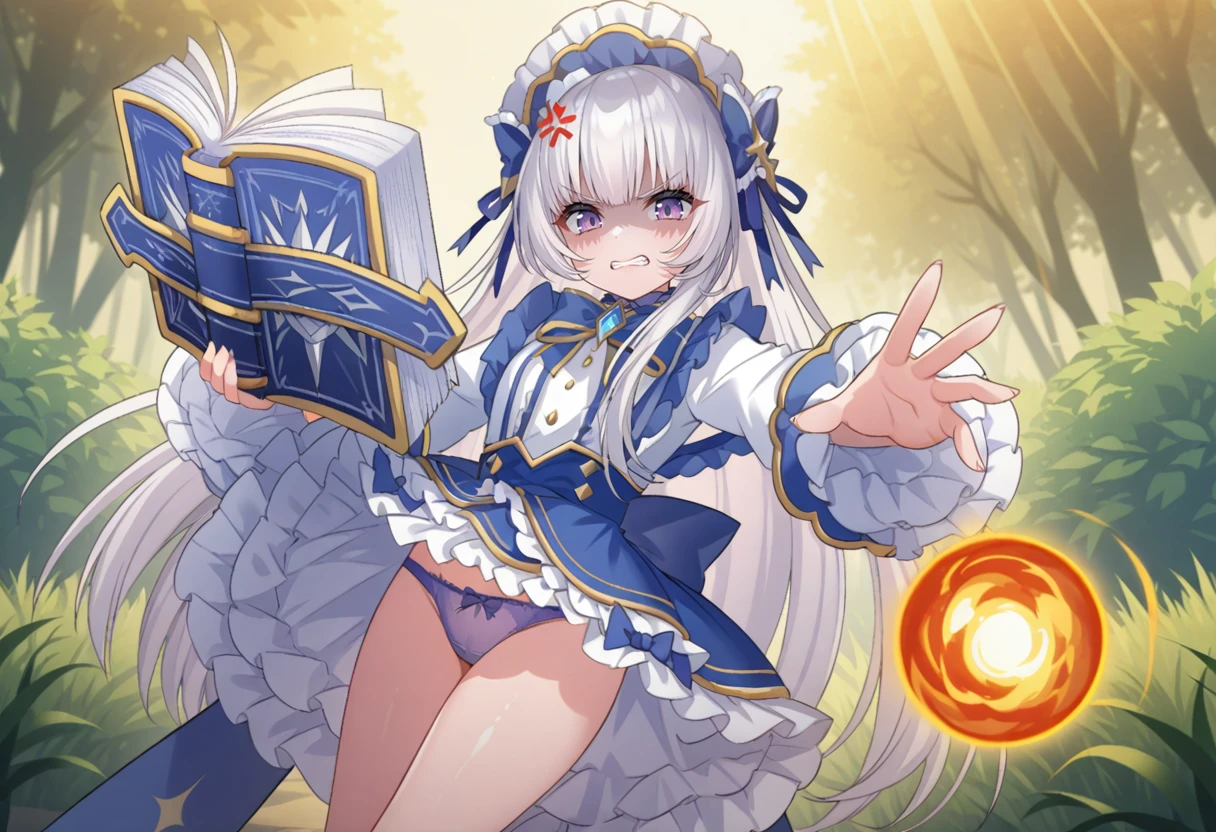 Amelia, 1girl, solo, long hair, white hair, blunt bangs, hair between eyes, sidelocks, purple eyes, small breasts, blue nails