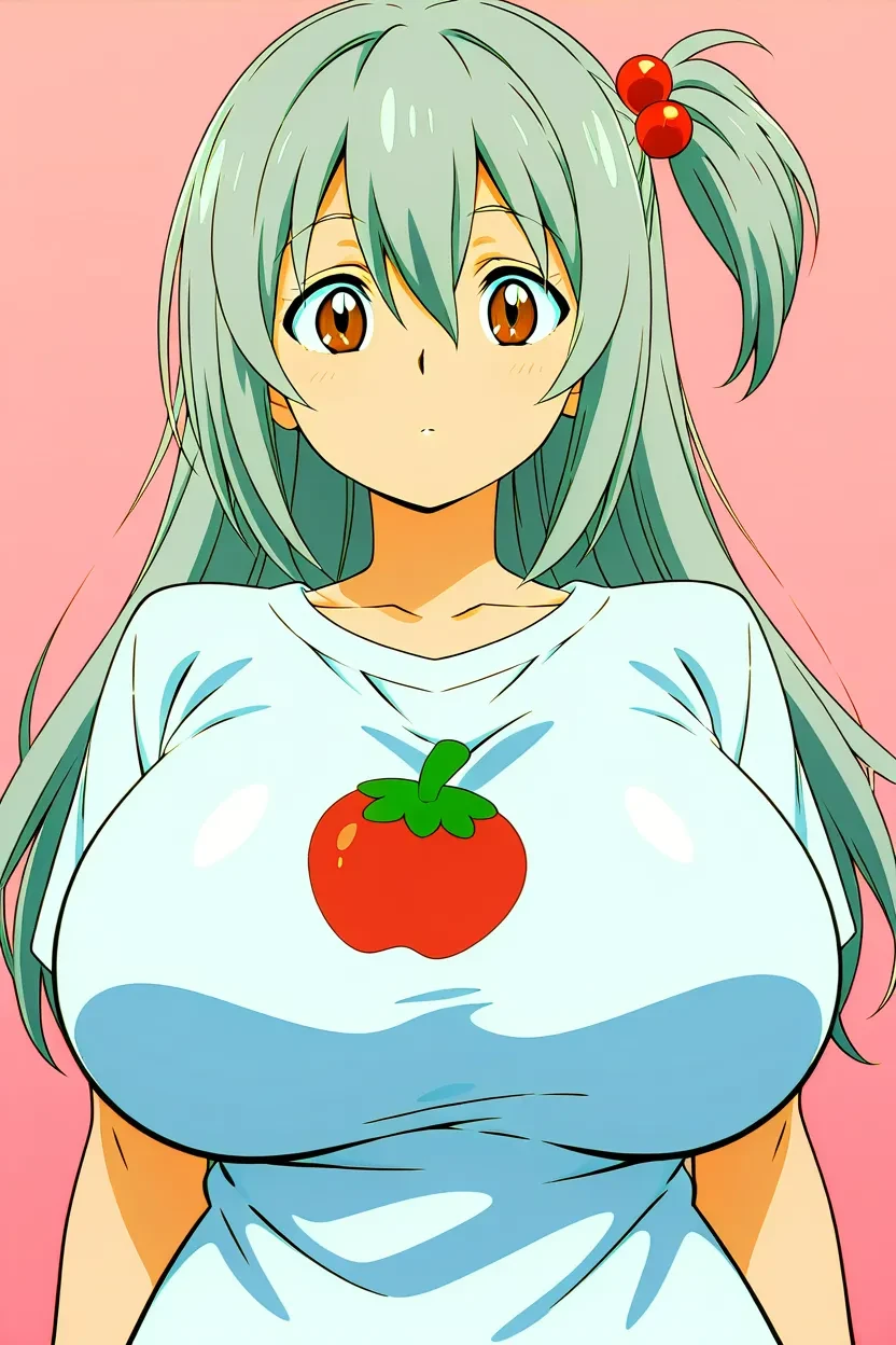 1girl, pepper-chan, brown eyes, grey hair, one side up, long hair, massive breasts,