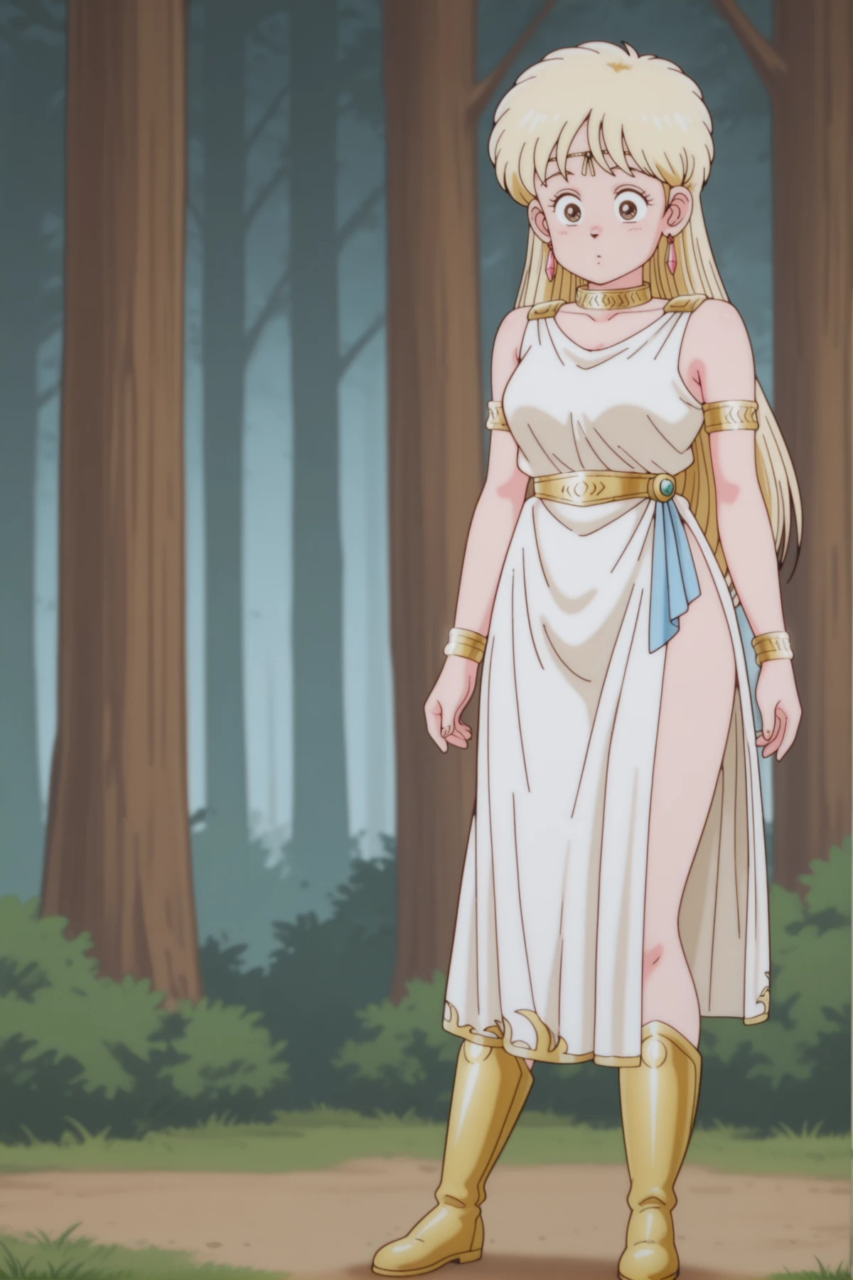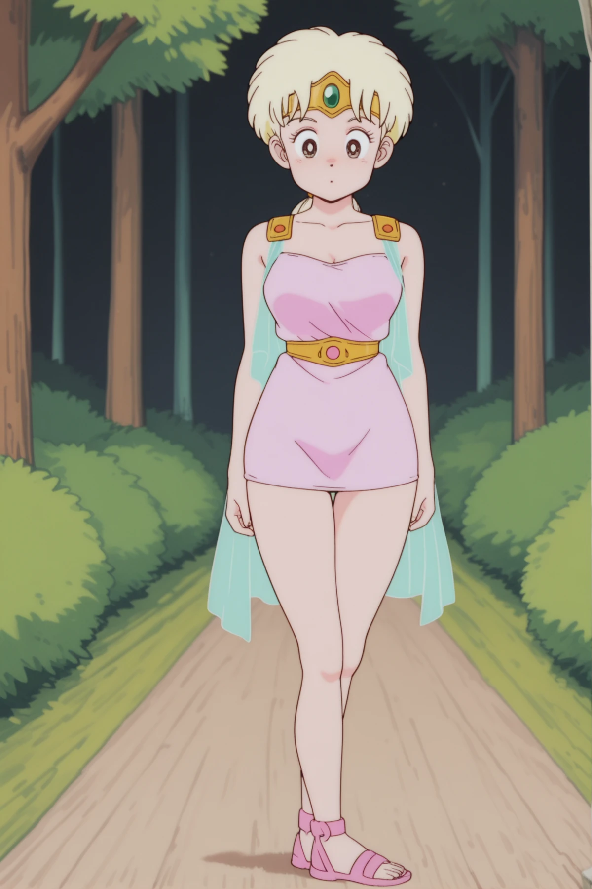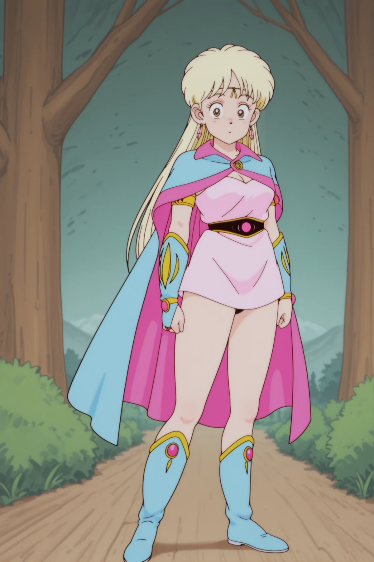 , classic_leona+_ill, Leona_Dermilin, Dermilin_Circlet, Dermilin_dress, Dermilin_cape, Dermilin_belt, Dermilin_Sandals, blonde, tight skirt, big eyes, brown eyes,