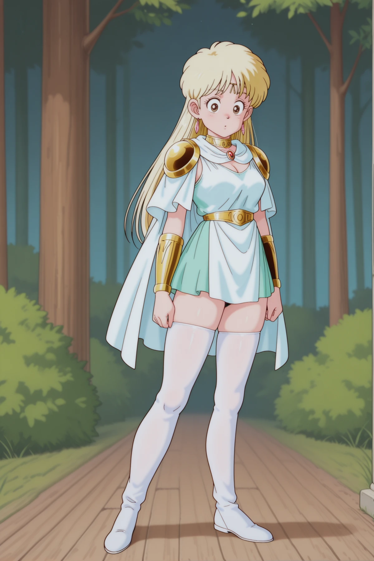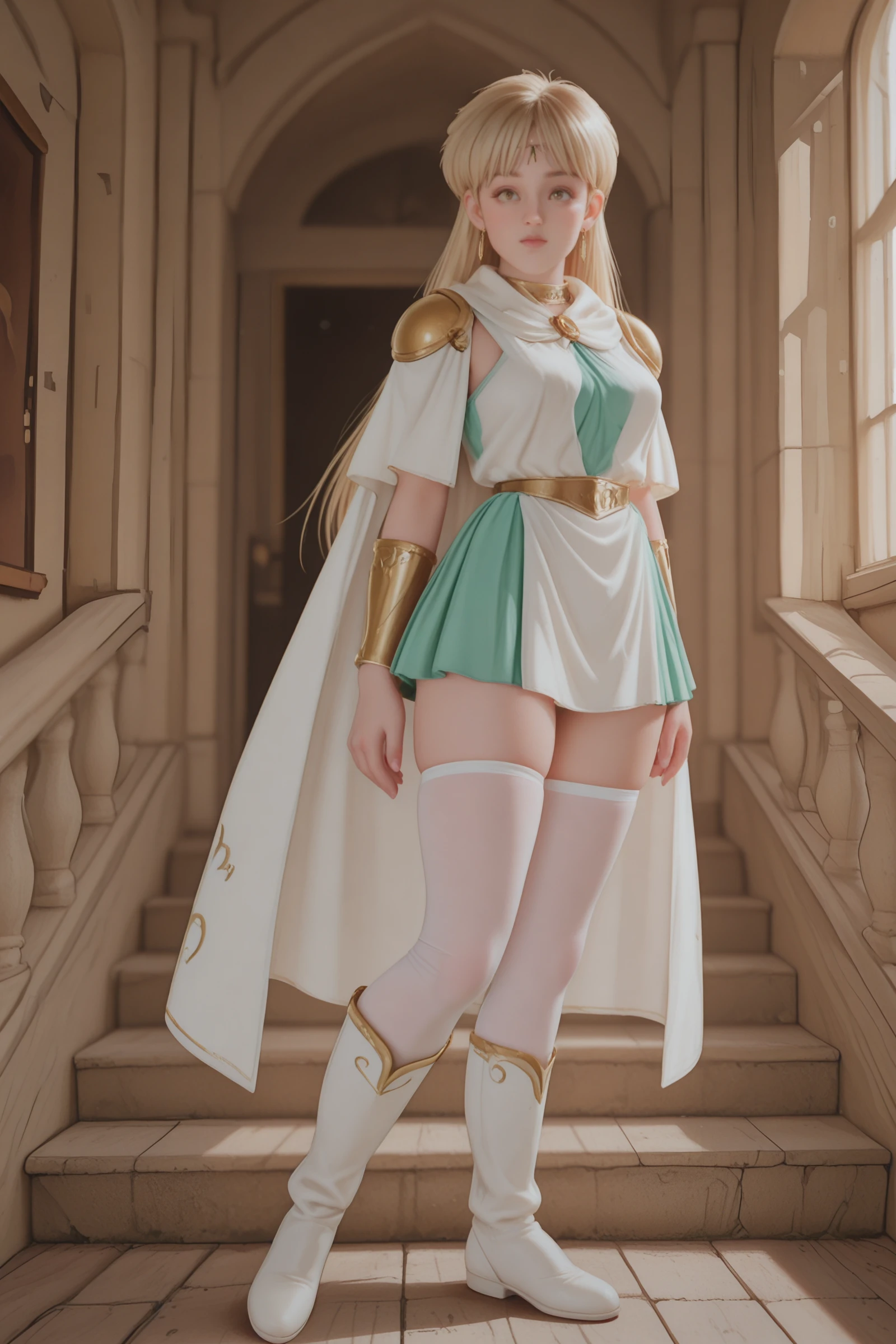, classic_leona+_ill, Leona_FB, Leona_FB_dress, FB_Golden_Shoulder_Pads, FB_White_Cape, leona_fb_boots, zettai_ryouiki, green_skirt, pelvic_curtain, Leona_FB_earrings, Leona_FB_belt, Leona_FB_collar, Leona_FB_vambraces, Leona_head_brooch, blonde, big eyes, brown eyes,