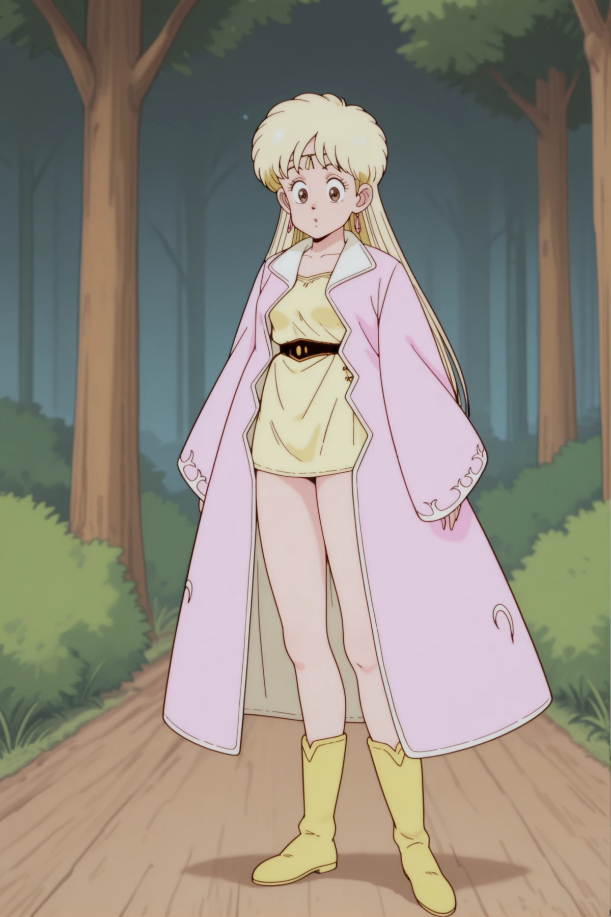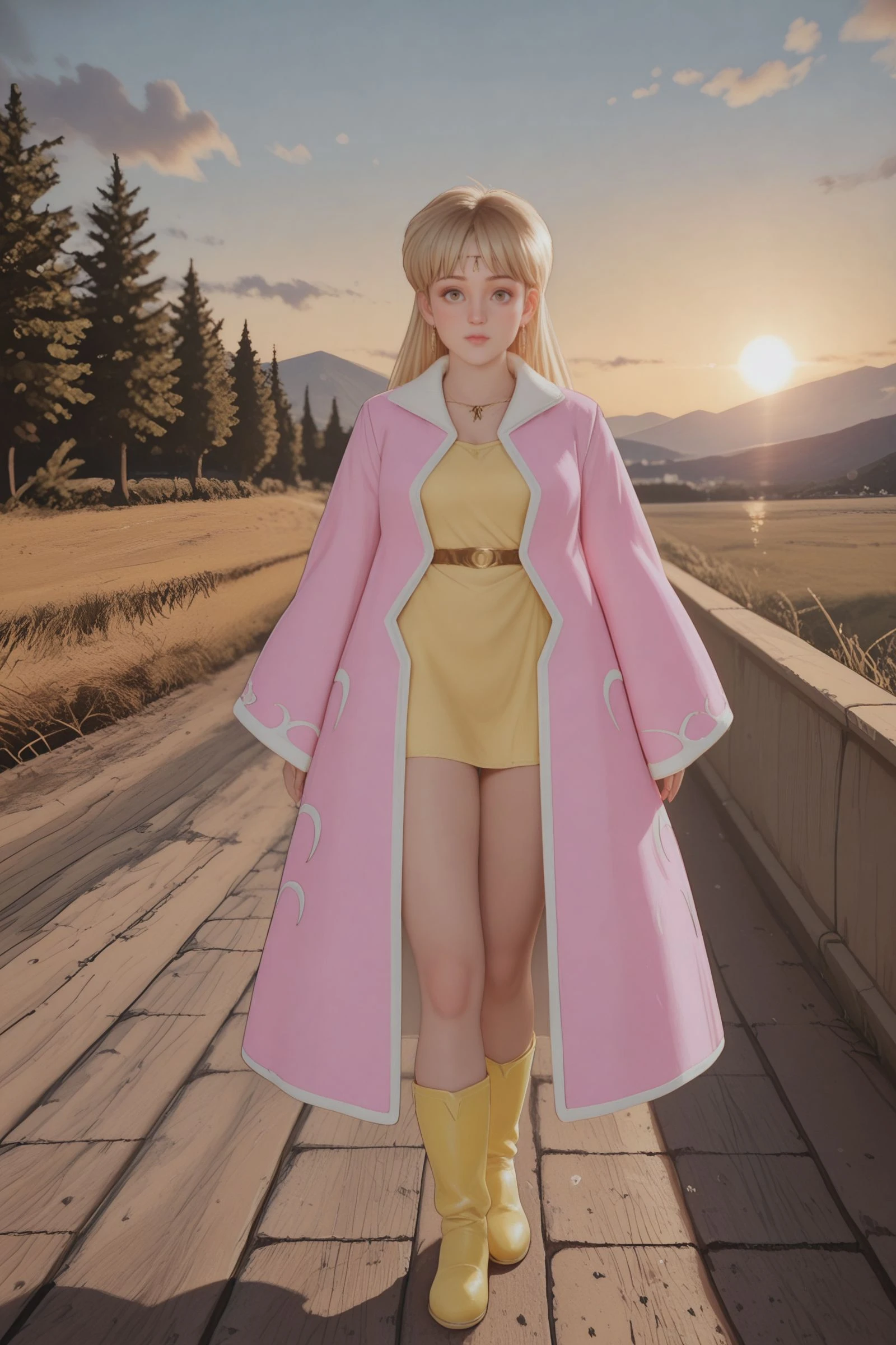 , classic_leona+_ill, Leona_Rich_girl, pink_coat, yellow_dress, yellow_boots, head_chain , blonde, big eyes, brown eyes,