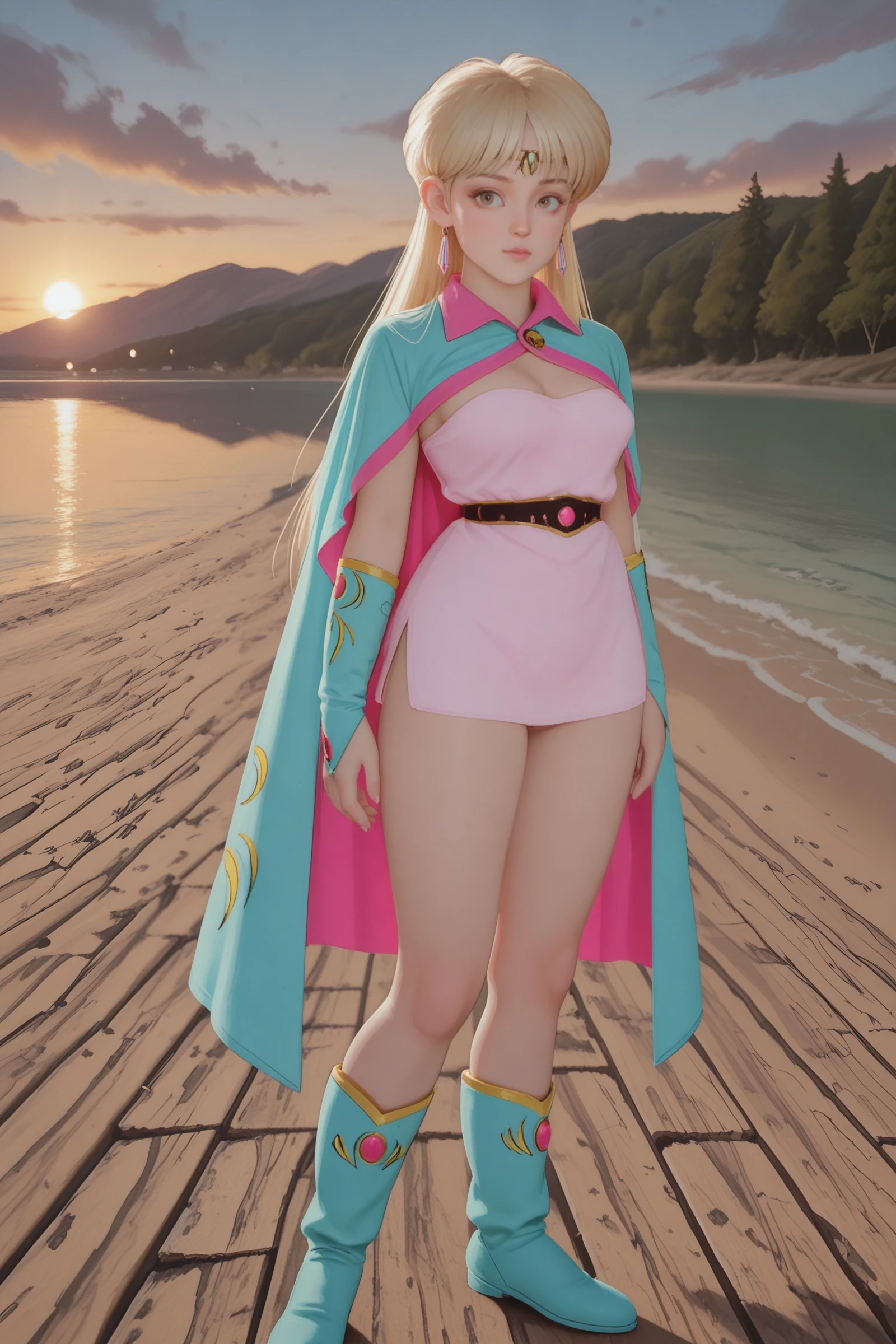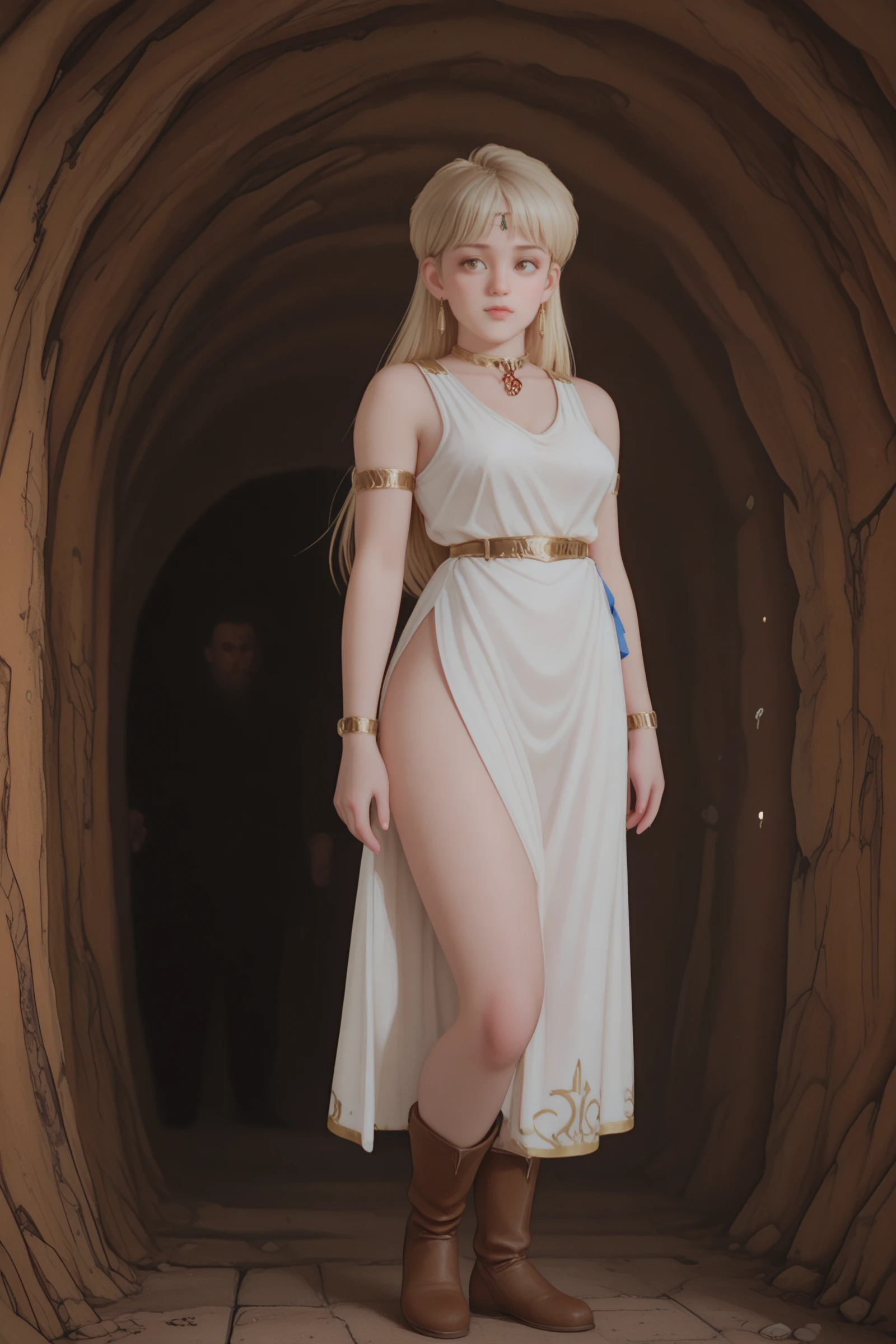 , classic_leona+_ill, Leona_Papunika, Papunika_dress, Papunika_boots, Papunika_Belt, Papunika_Vambraces, Papunika_cape, head_chain, Papunika_Shoulder_pads, Leona_FB_earrings, blonde, long dress, armored boots, big eyes, brown eyes, side slit,