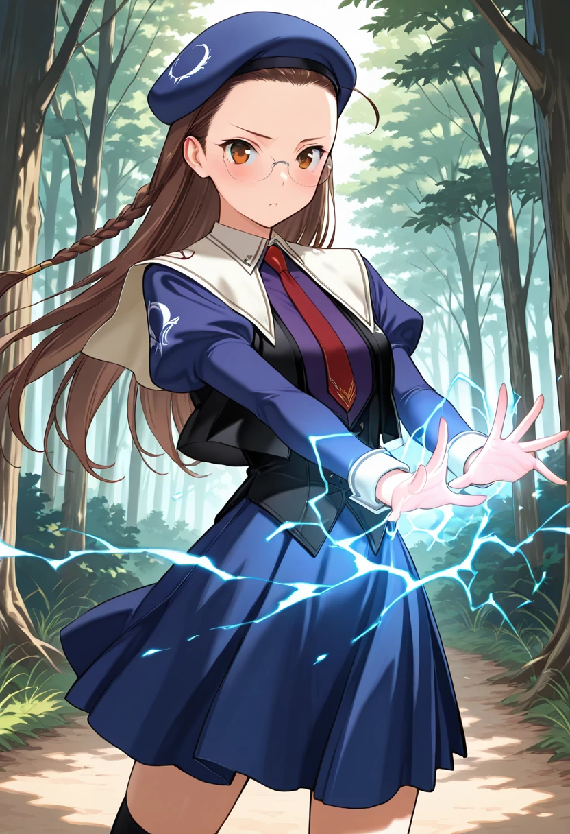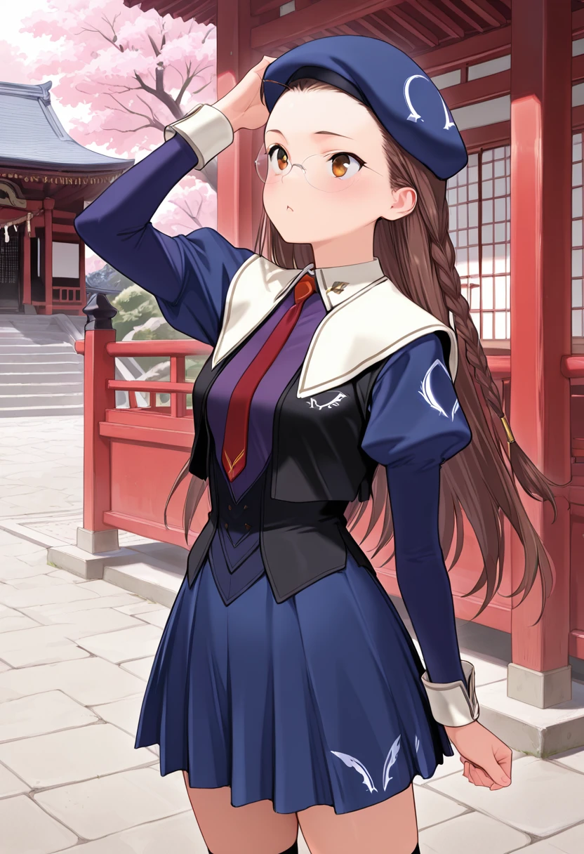 MagicSengokuR, single braid, hair pulled back, blue beret, purple shirt, collared shirt, blue sleeves, juliet sleeves, long sleeves, cuffed sleeves, white collar, red necktie, white capelet, black vest, open vest, blue skirt, short skirt, black socks, knee socks, brown shoes,