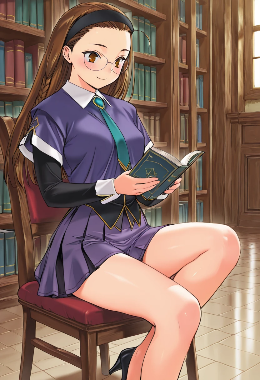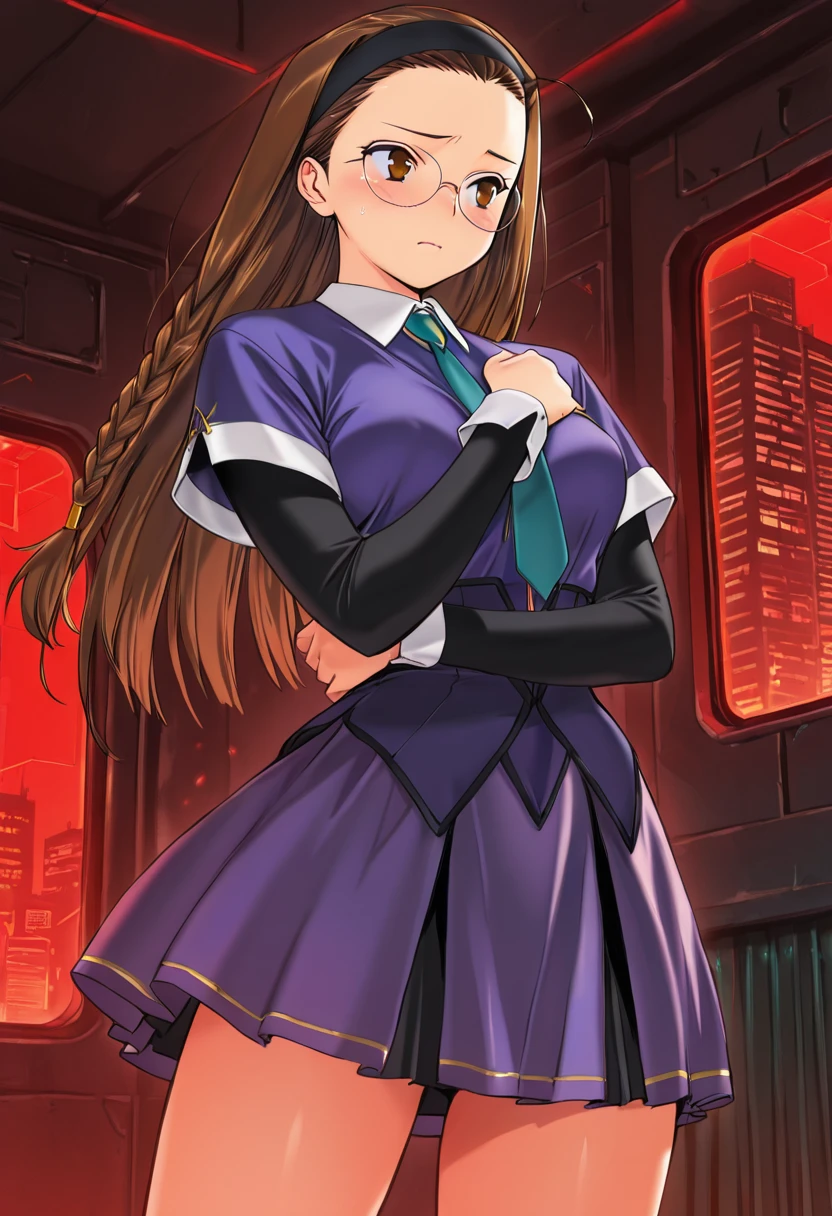 Trigger Words (Casual Rance VI): MagicRanceVI, single braid, hair pulled back, black hairband, purple shirt, collared shirt, white collar, teal necktie, black undershirt, long sleeves, black sleeves, cuffed sleeves, layered skirt, purple skirt, black skirt, short skirt, black high heels,
