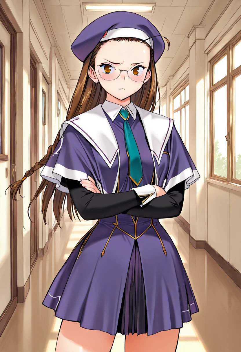 MagicRanceVI, single braid, hair pulled back, purple beret, purple shirt, collared shirt, white collar, teal necktie, purple capelet, white trim, black undershirt, long sleeves, black sleeves, cuffed sleeves, layered skirt, purple skirt, black skirt, short skirt, black high heels,