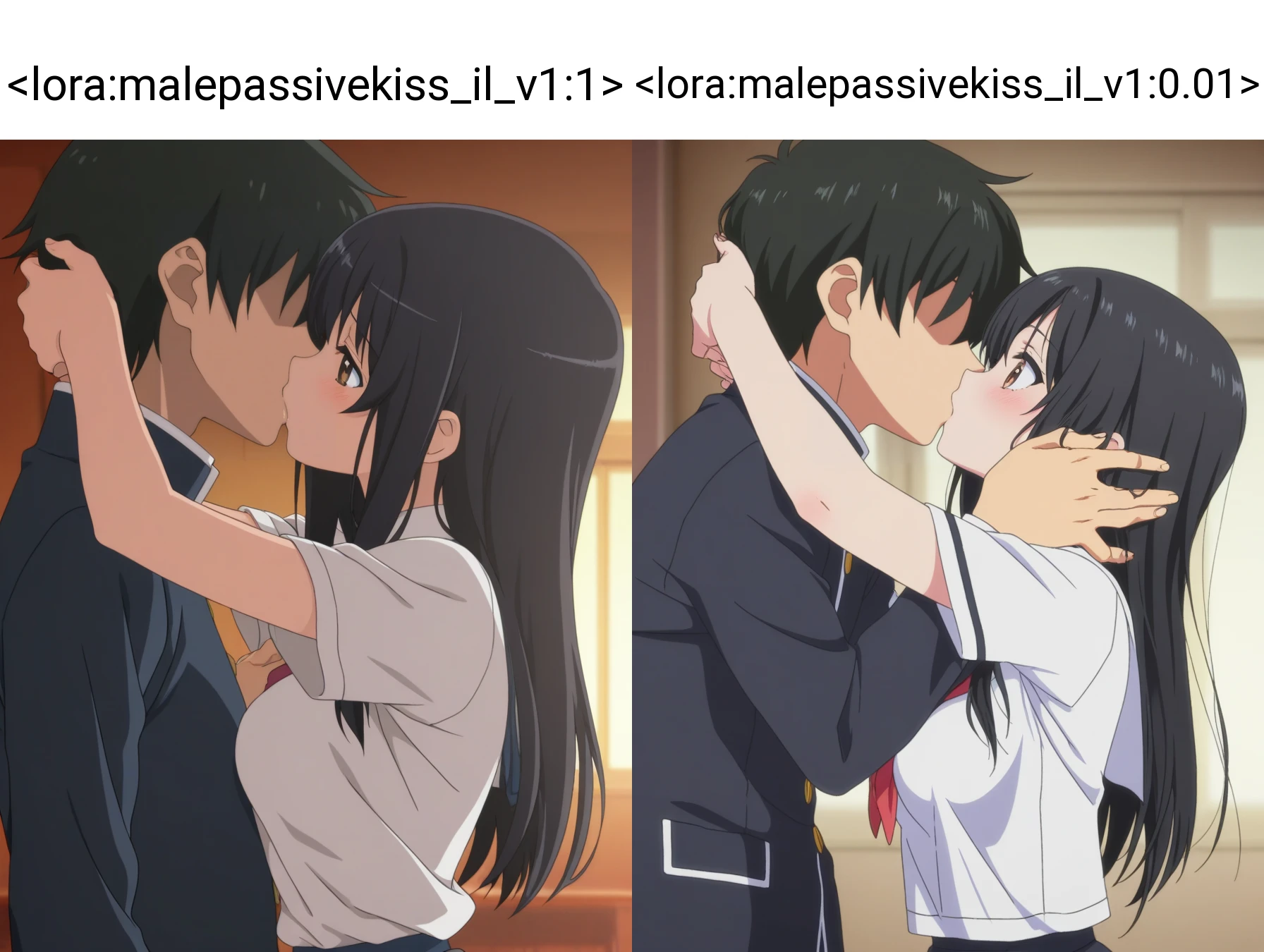 This LoRA assists in generating scenes where the man is in a passive position during a kiss.
