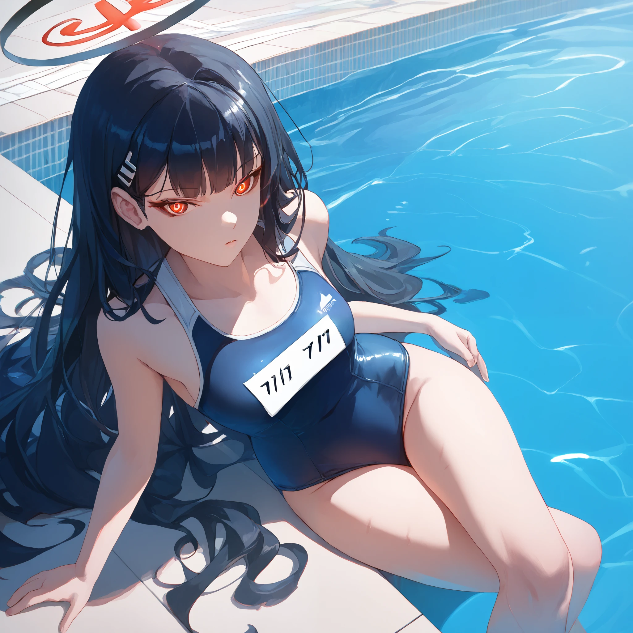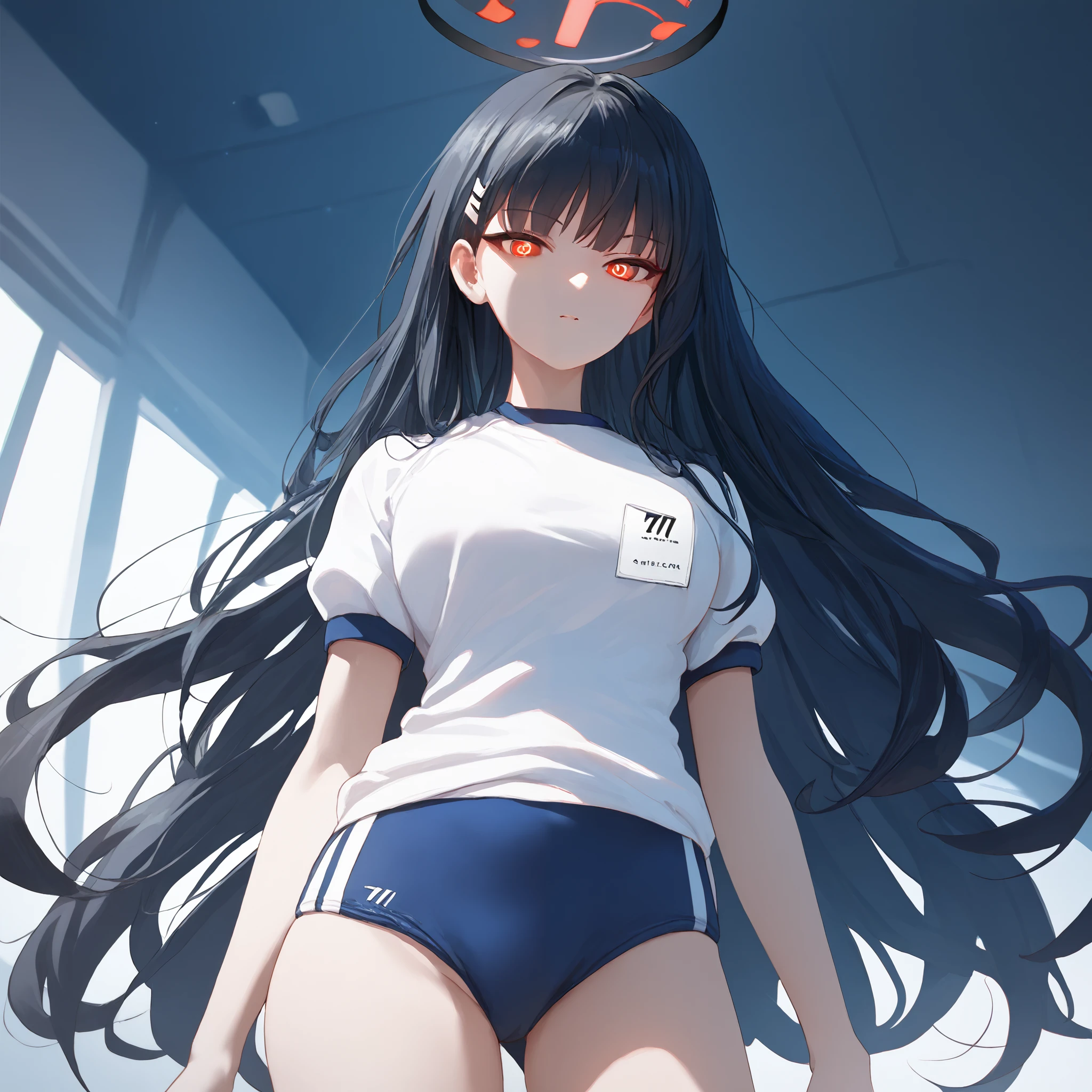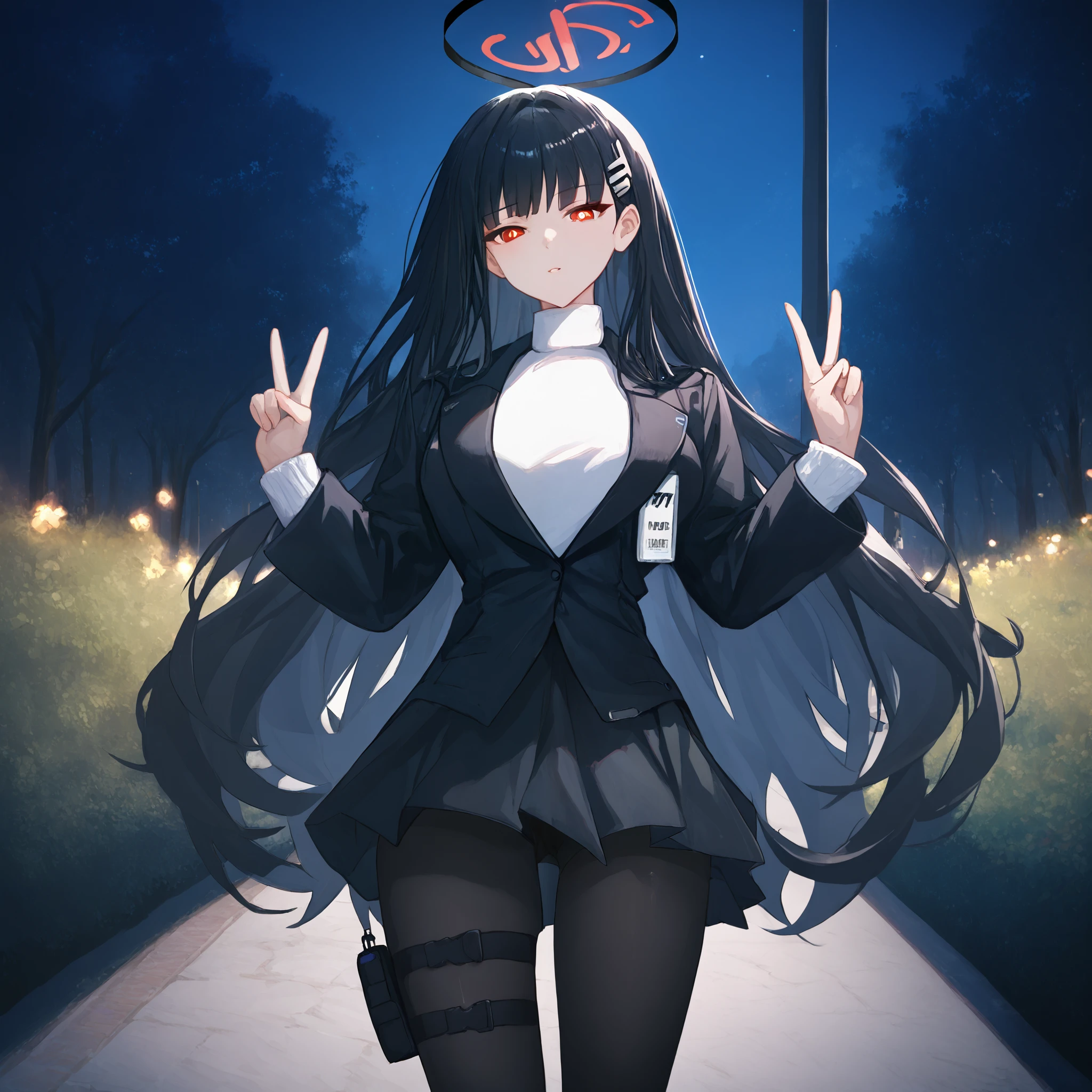 Default : rio_(blue_archive), black hair, long hair, hairpin, red eyes, white pupils, halo, black jacket, white sweater, miniskirt, black skirt, black pantyhose, thigh strap,Description