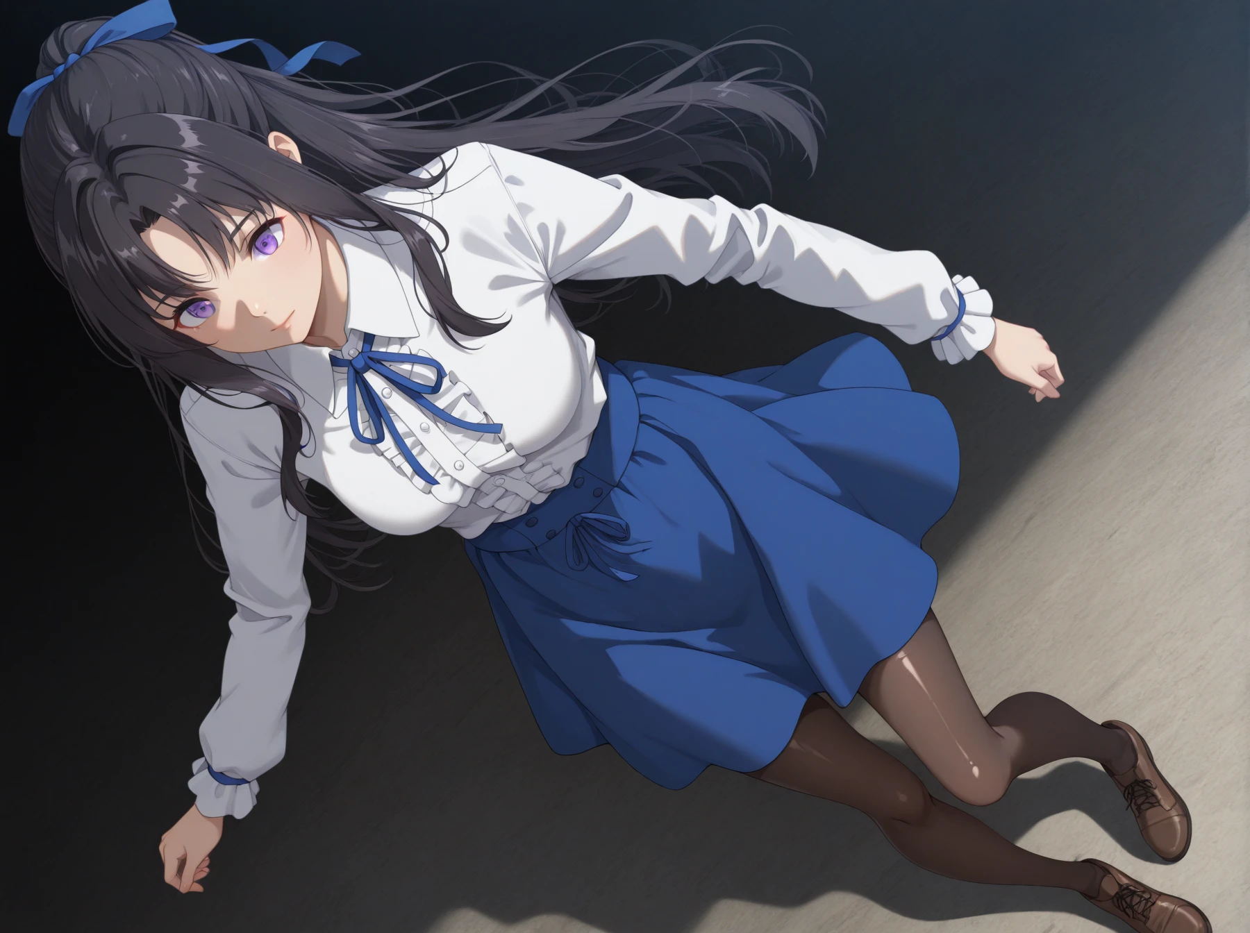Dress: (FrauDress, white shirt, collared shirt, tucked shirt, long sleeves, blue shirt, knee length skirt, pantyhose, brown shoes)