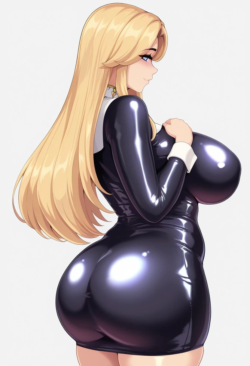 1 girl, blonde, thicc, busty, voluptuous, blue eyes, cute face, big breasts, huge hips, pale skin, long hair,