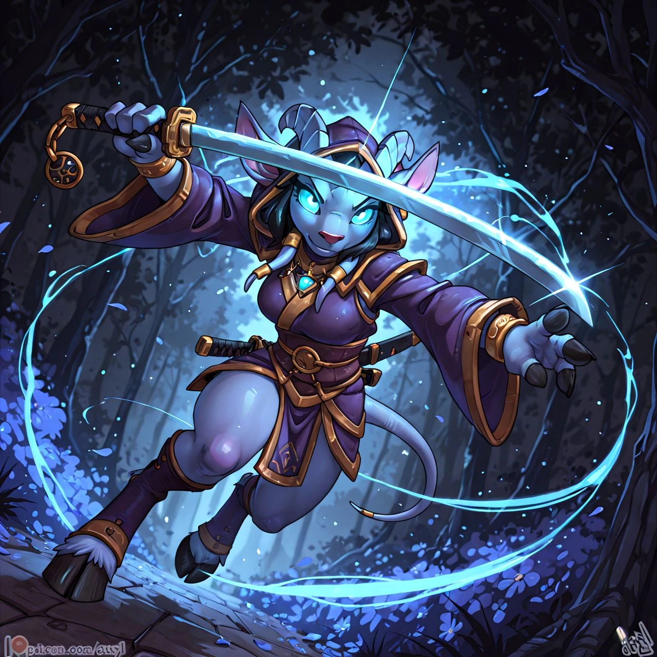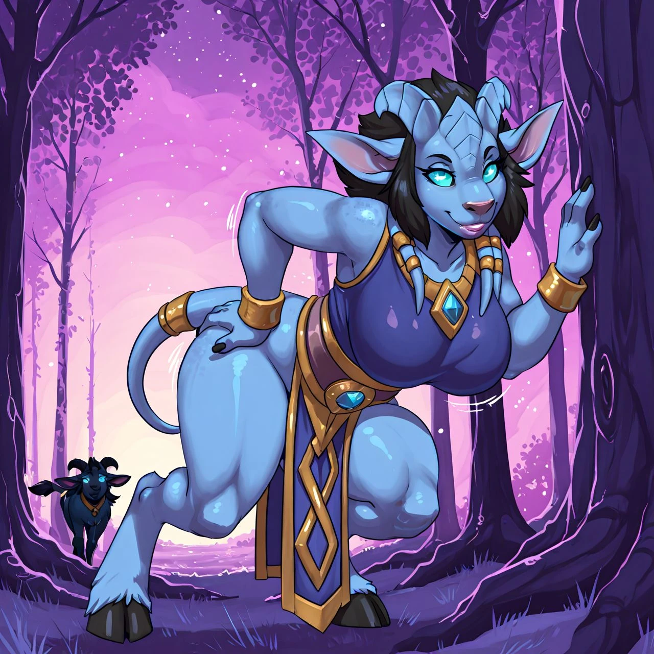 argi, blue_eyes, hair, black hair, bovid, jewelry, hooves, goat, (unusual pupils,horizontal pupils:1.4), eyelashes, tree, fingers, bracelet, fur, claws, draenei, blue body, hooves, digitigrade, pink nose,