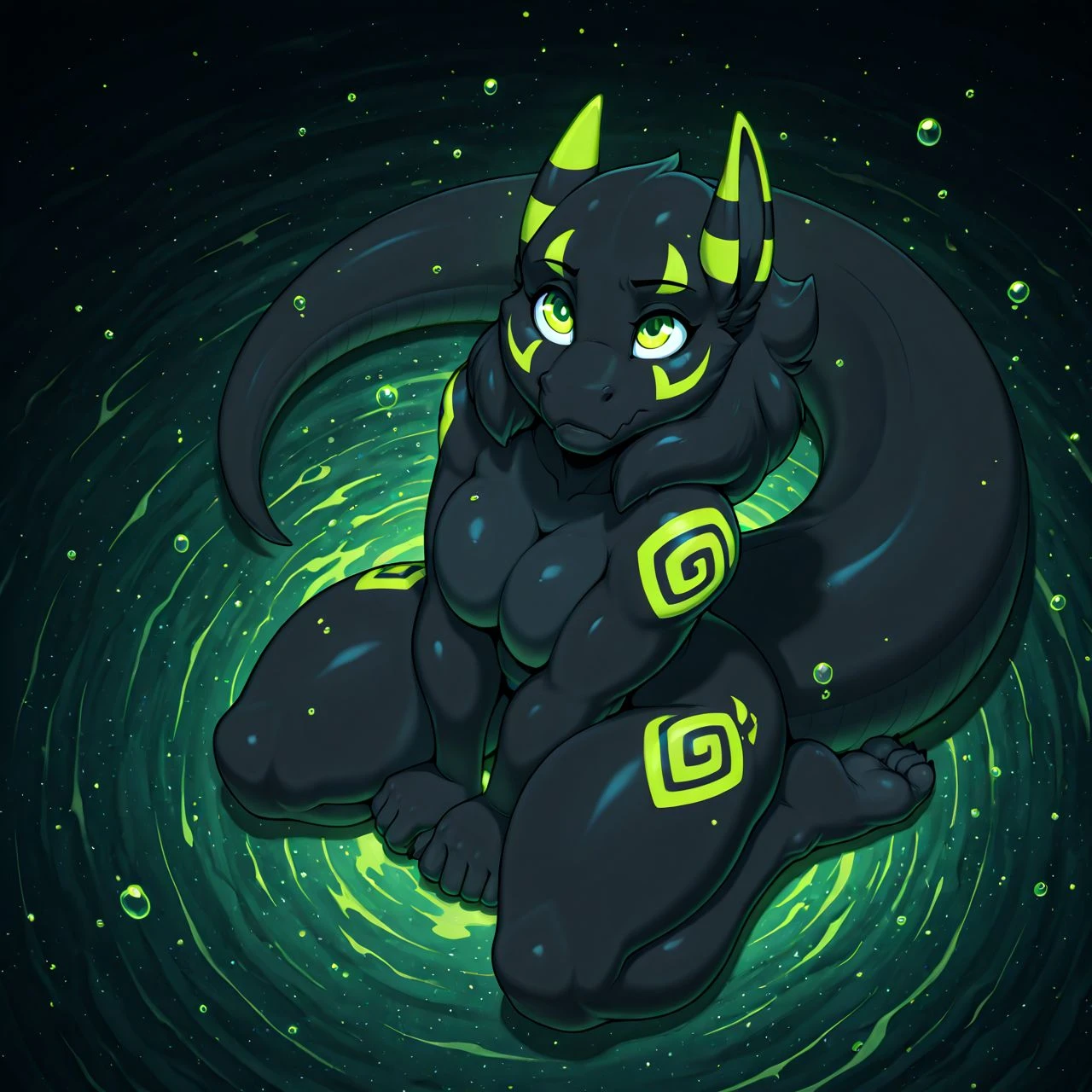 dax, dragon, mythological scalie, markings, ear markings, facial markings, shoulder markings, thigh markings, green eyes, green markings, black body, hair, thick tail,
