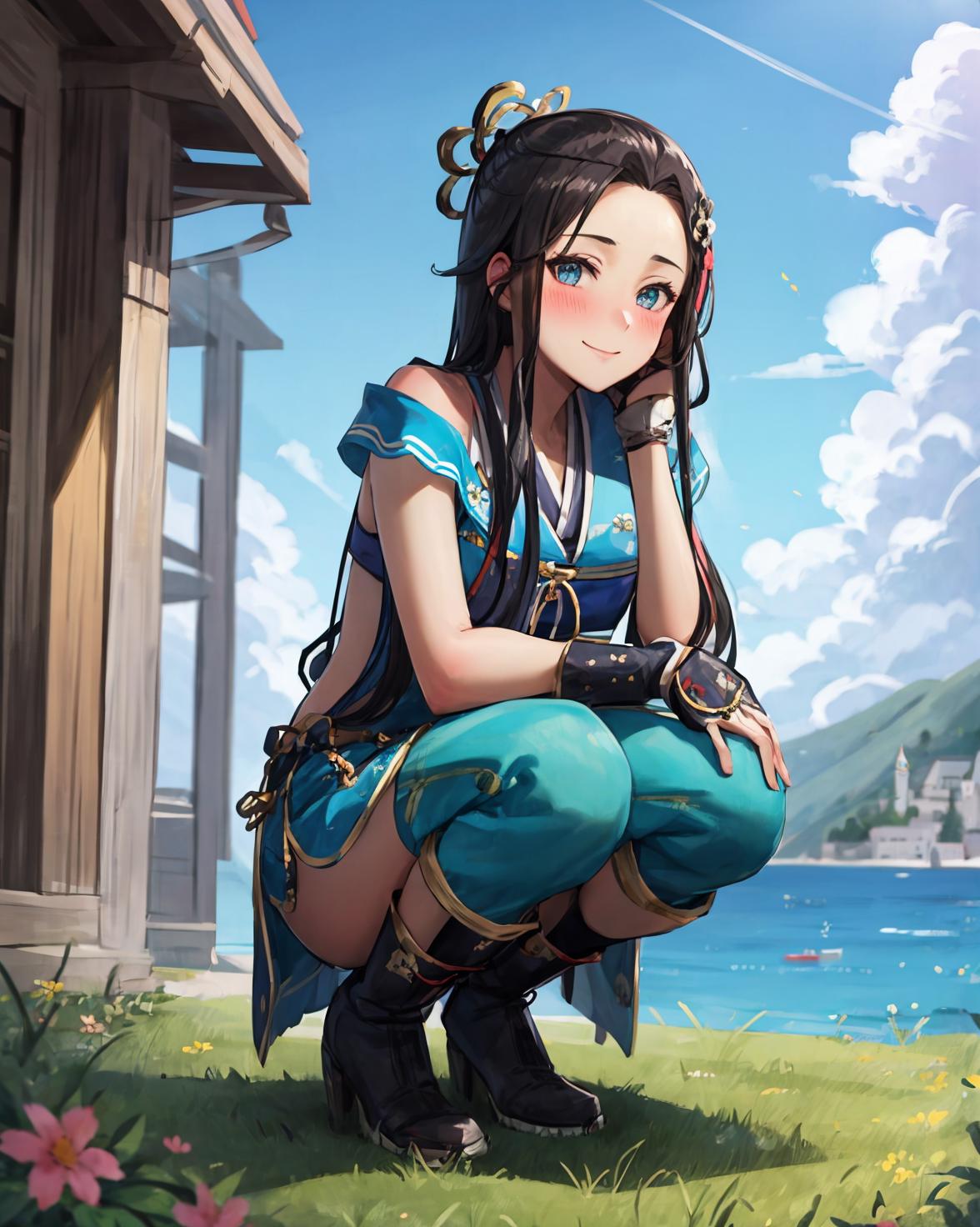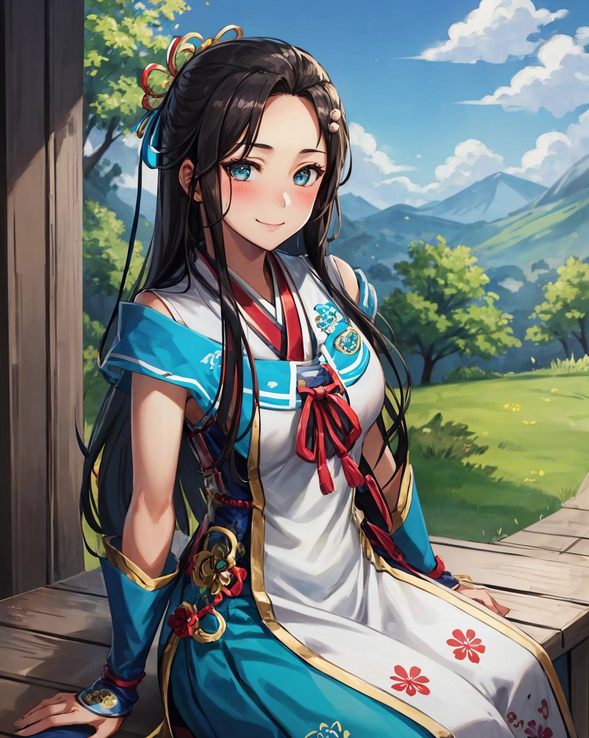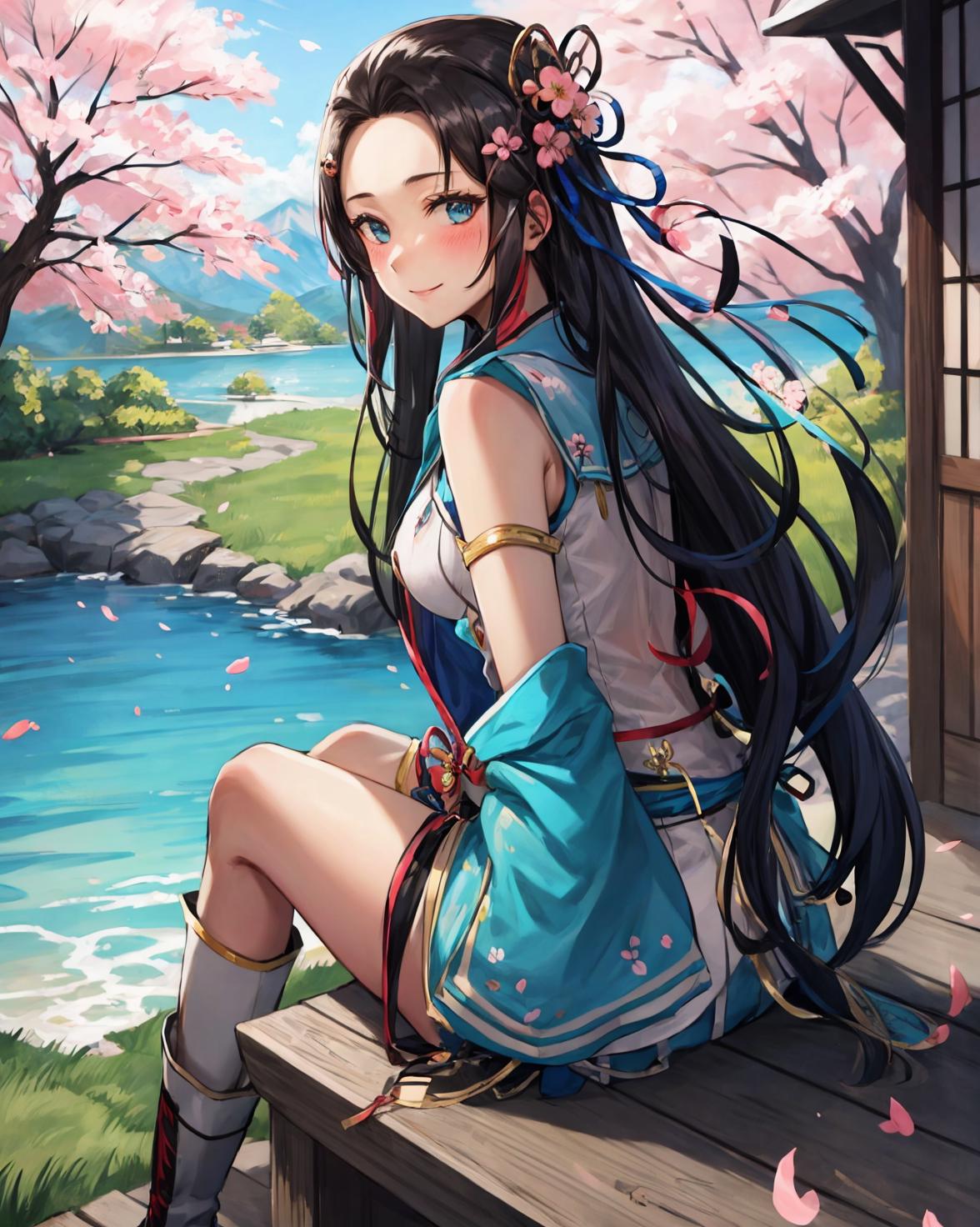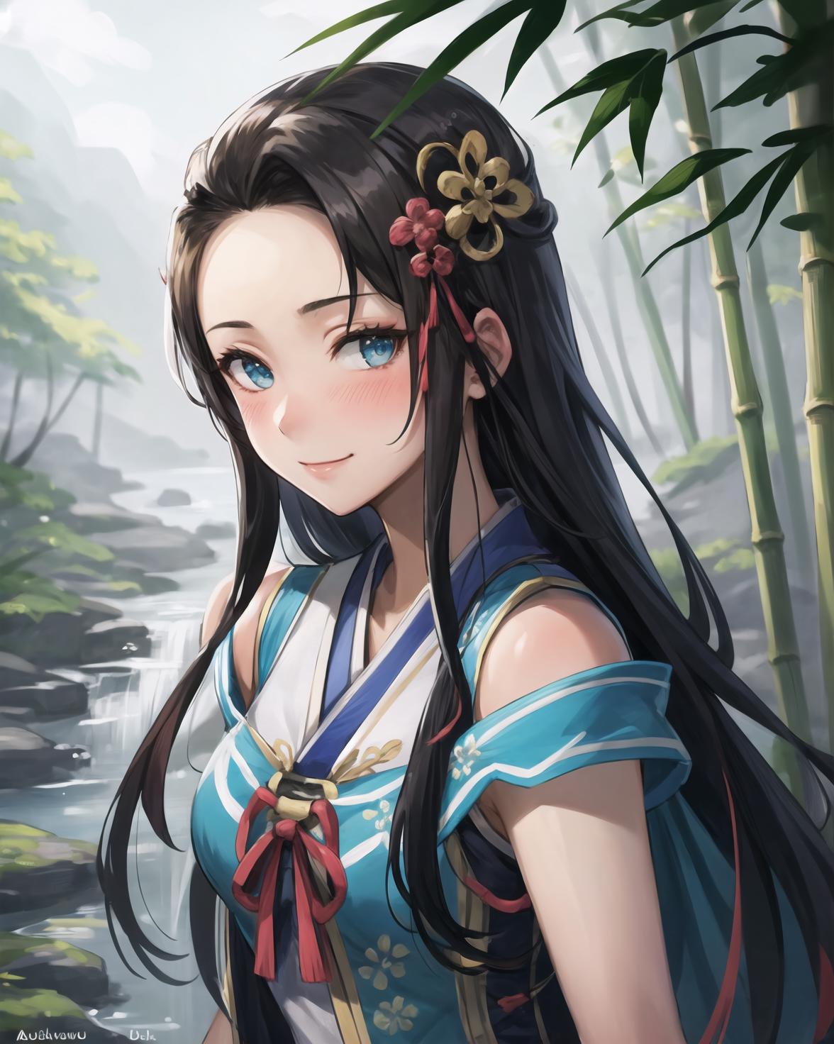 <lora:LadyHayakawa:0.95>, Lady Hayakawa, black hair, long hair,  blue eyes, small breasts, hair ornament,