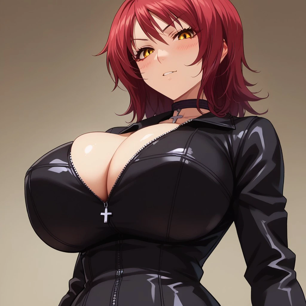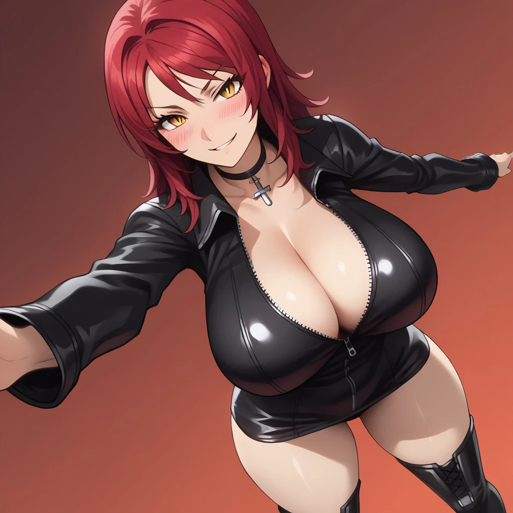 choker, cross, catsuit, bodysuit, zipper, unzipped, sleeves, long sleeves, thick thighs, thicc thighs, high leg boots, leather boots,