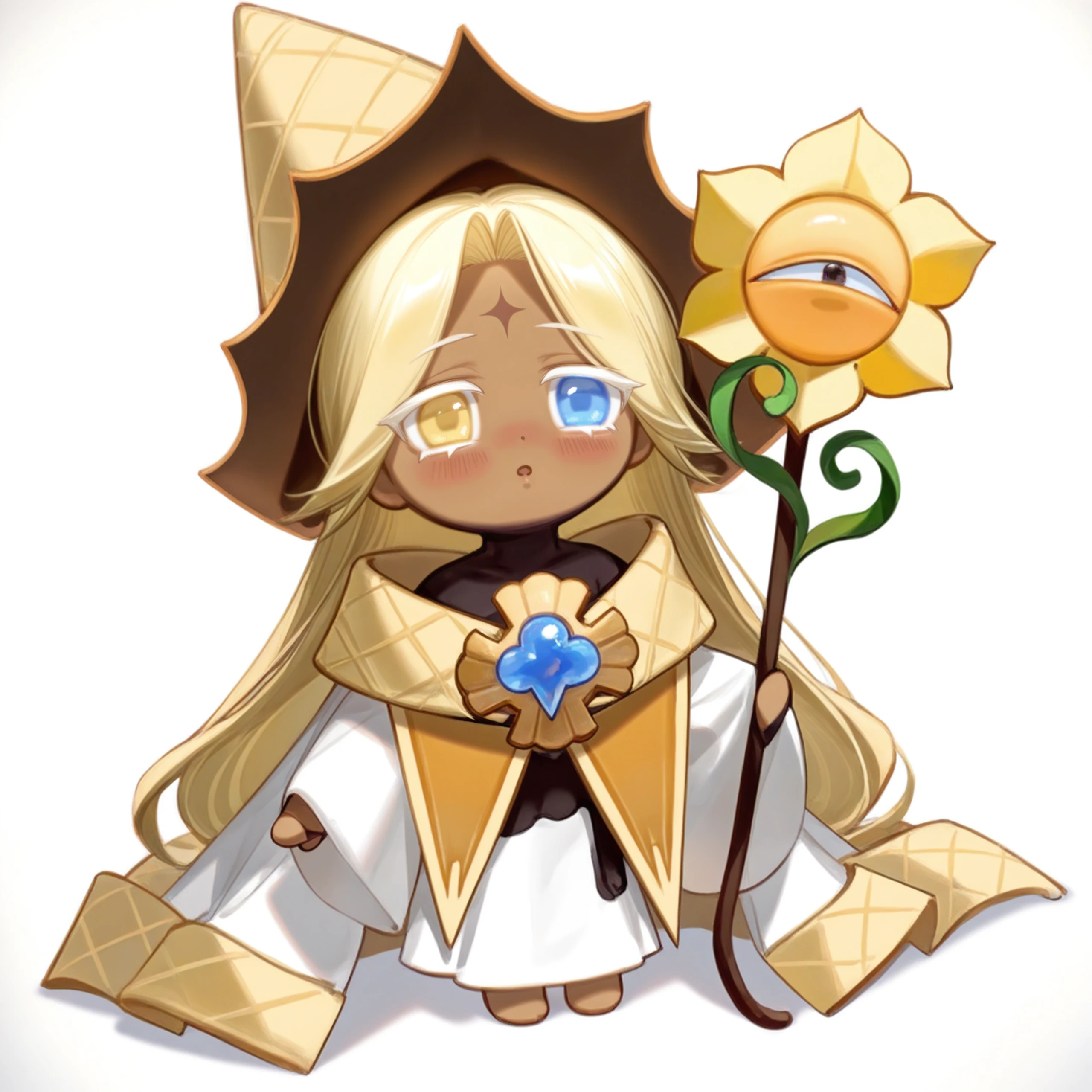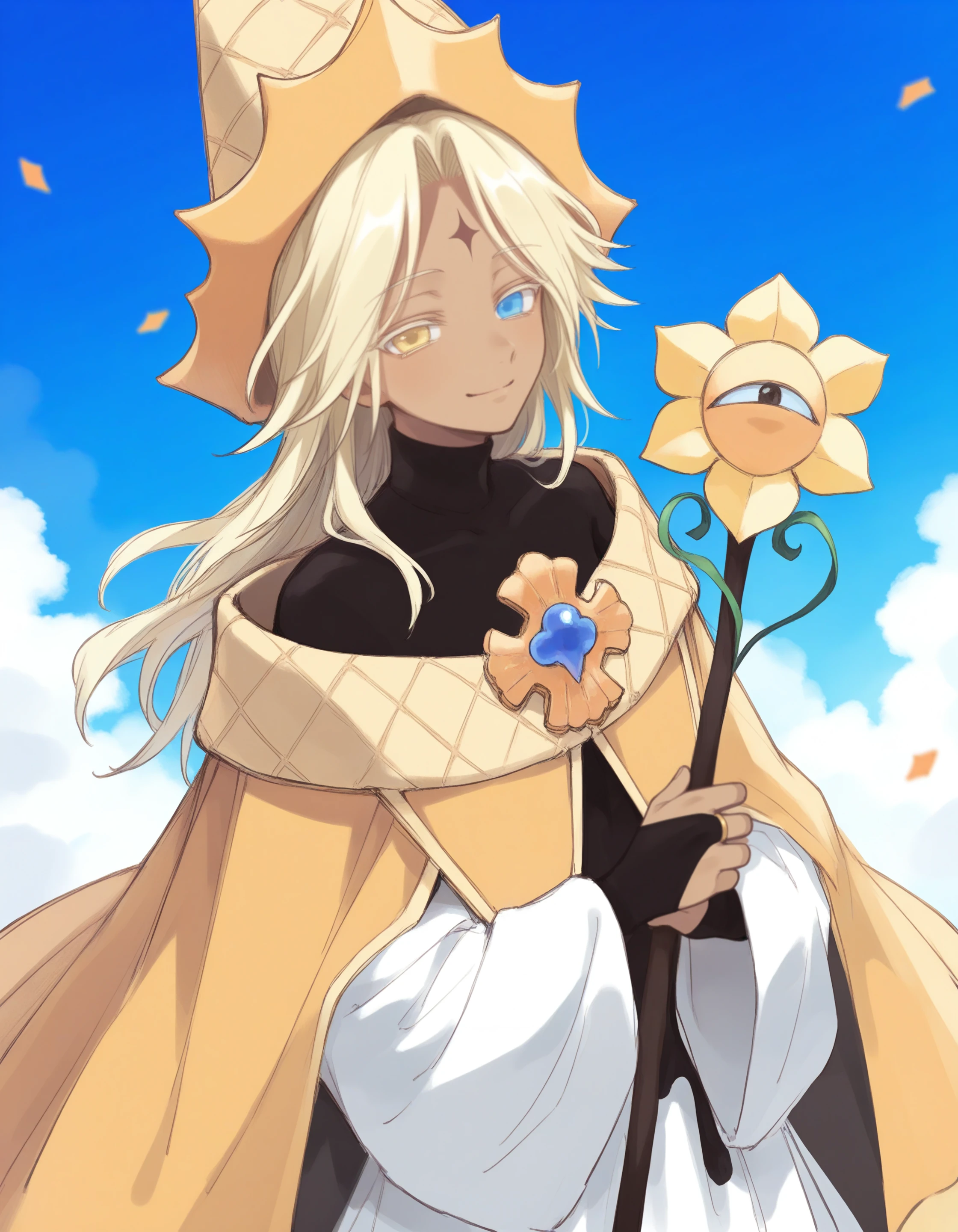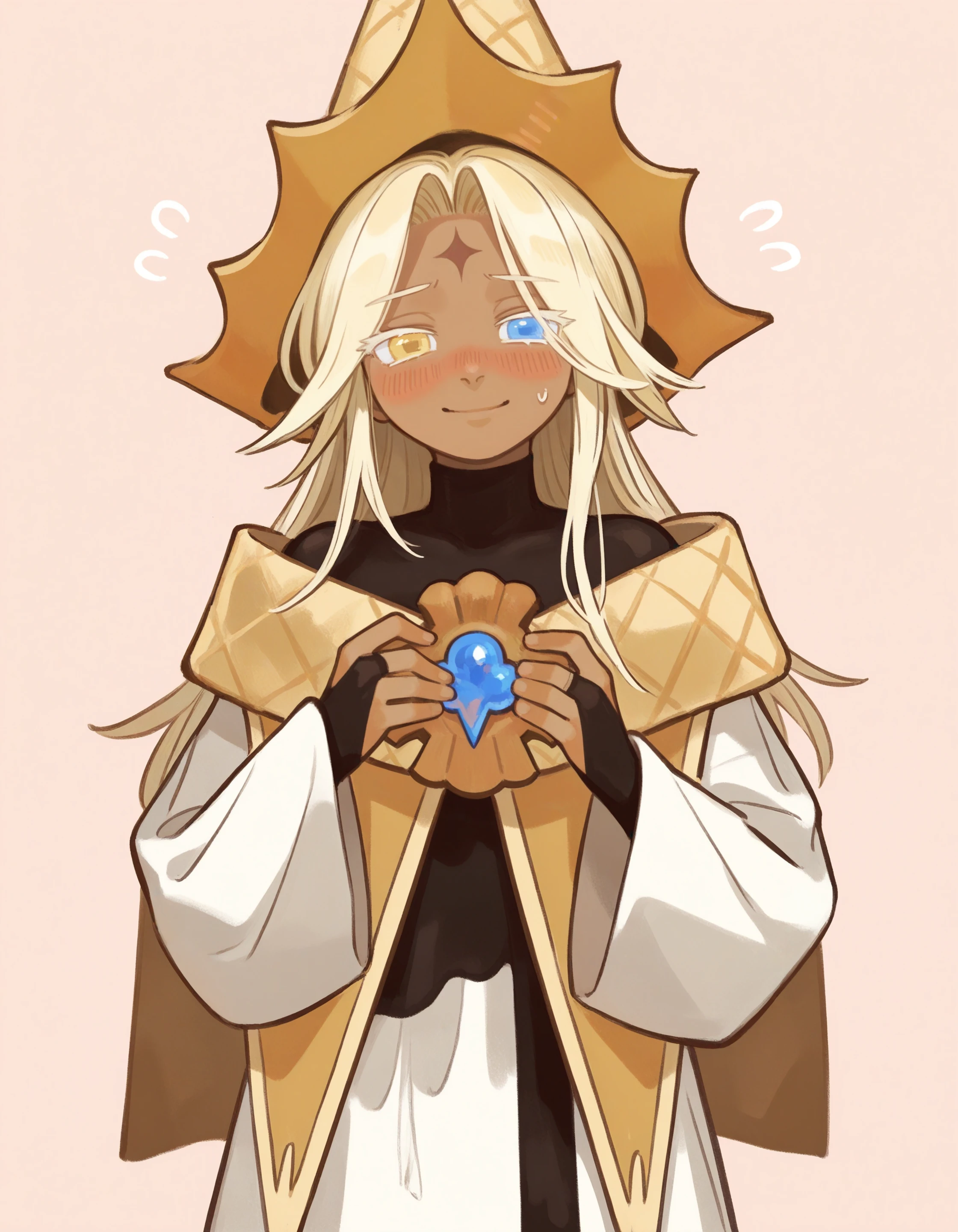 1boy, blonde hair, long hair, white robe, jacket, curtained hair, dark skin, brown forehead mark, heterochromia, yellow eyes, blue eyes, hat, long sleeves, brooch, white sleeves, black shirt, bridal gauntlets, turtleneck, wide sleeves, sleeves past wrists